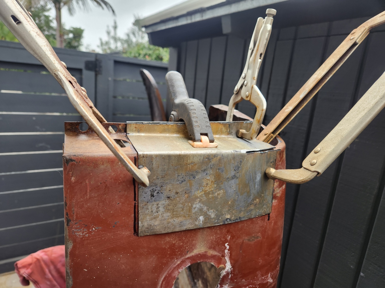This whole panel is from another Scout, it runs from back of door and wraps around to tailgate. My original had severe damage. It had to be removed from the body tub by drilling out spot welds, so next steps will be to plug weld this guy back in. I'm going to need every clamp I have, and then some. I have a Cleco set I haven't used in years, may bust that out to help keep things straight