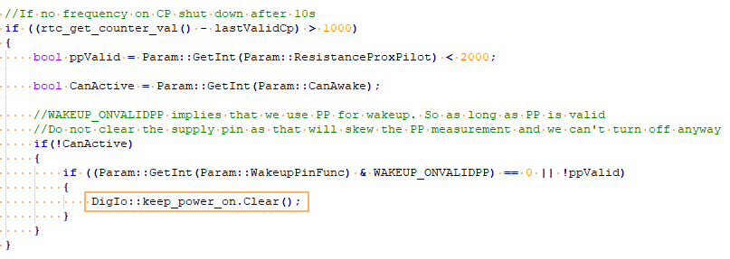 Is it still possible that KEEP_POWER_ON drops out when it shouldn't? In Code it looks like as long as CP is valid it should stay onuhi22 wrote: ↑Fri Oct 04, 2024 4:15 pm The PP resistance measurement is disturbed via the path R64 (1k to 12V), D21, PP_WAKE, JP3, PP. As long as the controller sets KEEP_POWER_ON=1, everything is fine, because Q3 pulls the anode of D21 to ground. But if the controller releases the KEEP_POWER_ON, the voltage on the PP rises, and the controller interprets this as increased resistance.