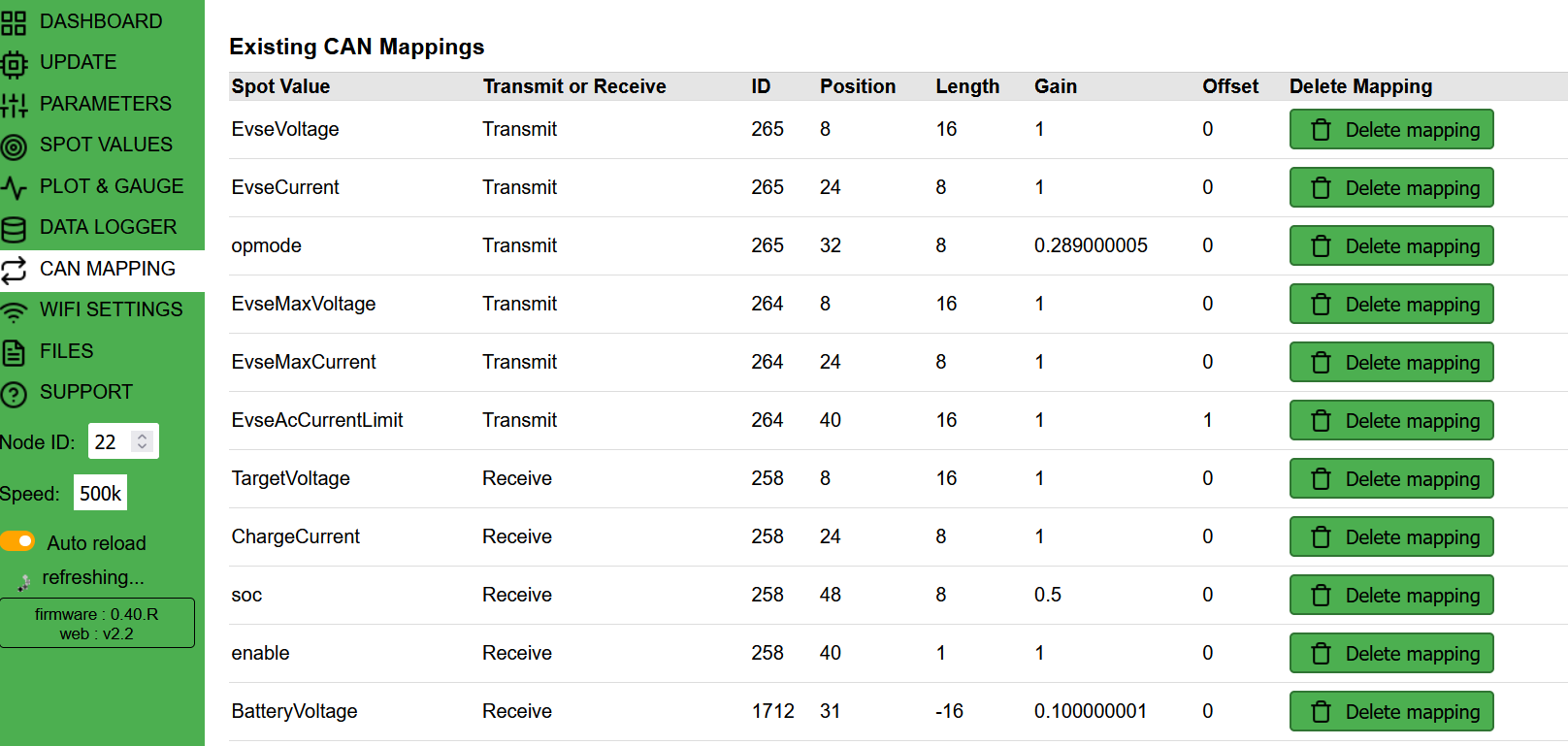 So i got everything powered up, 12v permanent to focci and bms, wakeup of focci when i plug my T2 portable station, I have access to the wifi interface I can modify parameters, start the charge by manually changing the AcObcState from 0 to 1 and to 2. but i can't map any can message anymore. I don't think i have that many mapped.