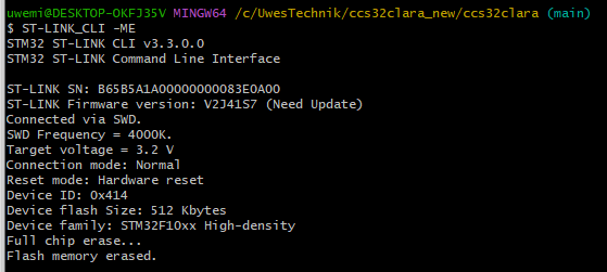 Done with full chip erase via the gui stlink utility, but now i have to put an uncorupted bin/hex back in the stm32. I'm using windows and i'm not that computer savvy, last release of clara is v0.22 so quite old.uhi22 wrote: ↑Mon Oct 21, 2024 6:31 am I do not know the details about the why it fails, but the mappings are at the end of the flash memory in Foccci. So to clean up everything, a "mass erase" of the STM32 on the Foccci board should help. How to do this? Using an STlink programmer, which is connected to the Foccci board via the 3-pin connector SWCLK, GND, SWDIO. And then using the STLink command line utility, with the argument "-ME" for "mass erase":