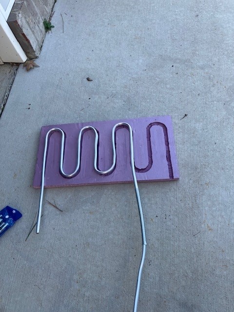Basic design is 1" foam with 1/2" aluminum tubing, 3" bends, 20ga aluminum sheet to spread the load and heat. The front HX uses 7 bends because it needs to be in "landscape" orientation. The bottom HXs will be a simpler 3-bend design because they are portrait orientation. Here is the tool I used to cut the grooves in the foam: