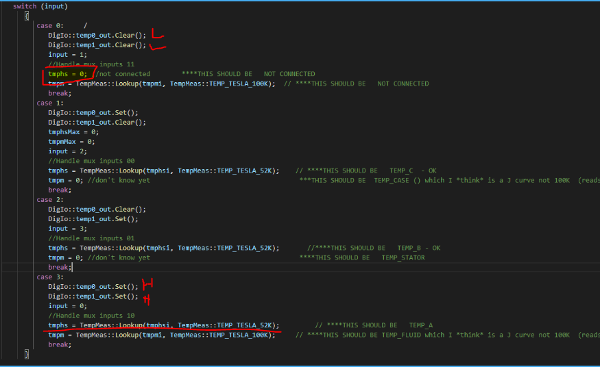 There are four motor temp sensors. Two are implemented as I was given the temp/resistance info. Two were not as up to now no one had bothered to find out or share. The mux runs through all 3 heatsink and all 4 motor temps and displays the hottest.
