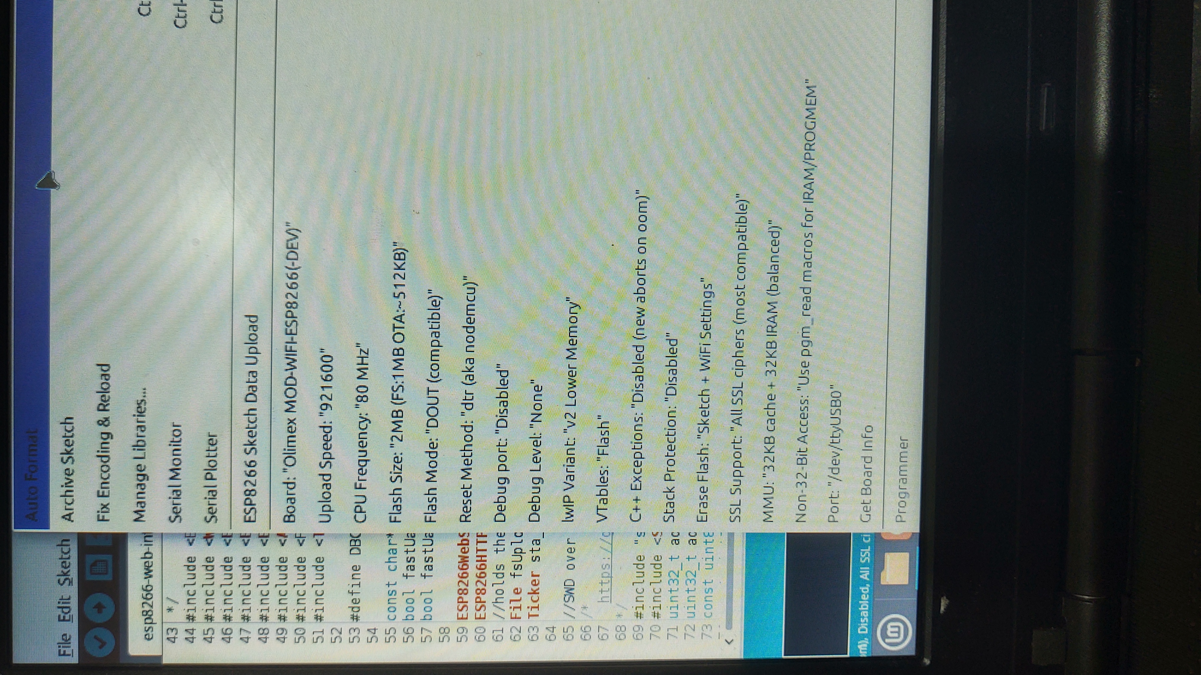 4. Select your version of ESP8266 from 'Tools - Boards - ESP8266 - Olimex-MOD-WIFI-ESP8266' and the correct port.