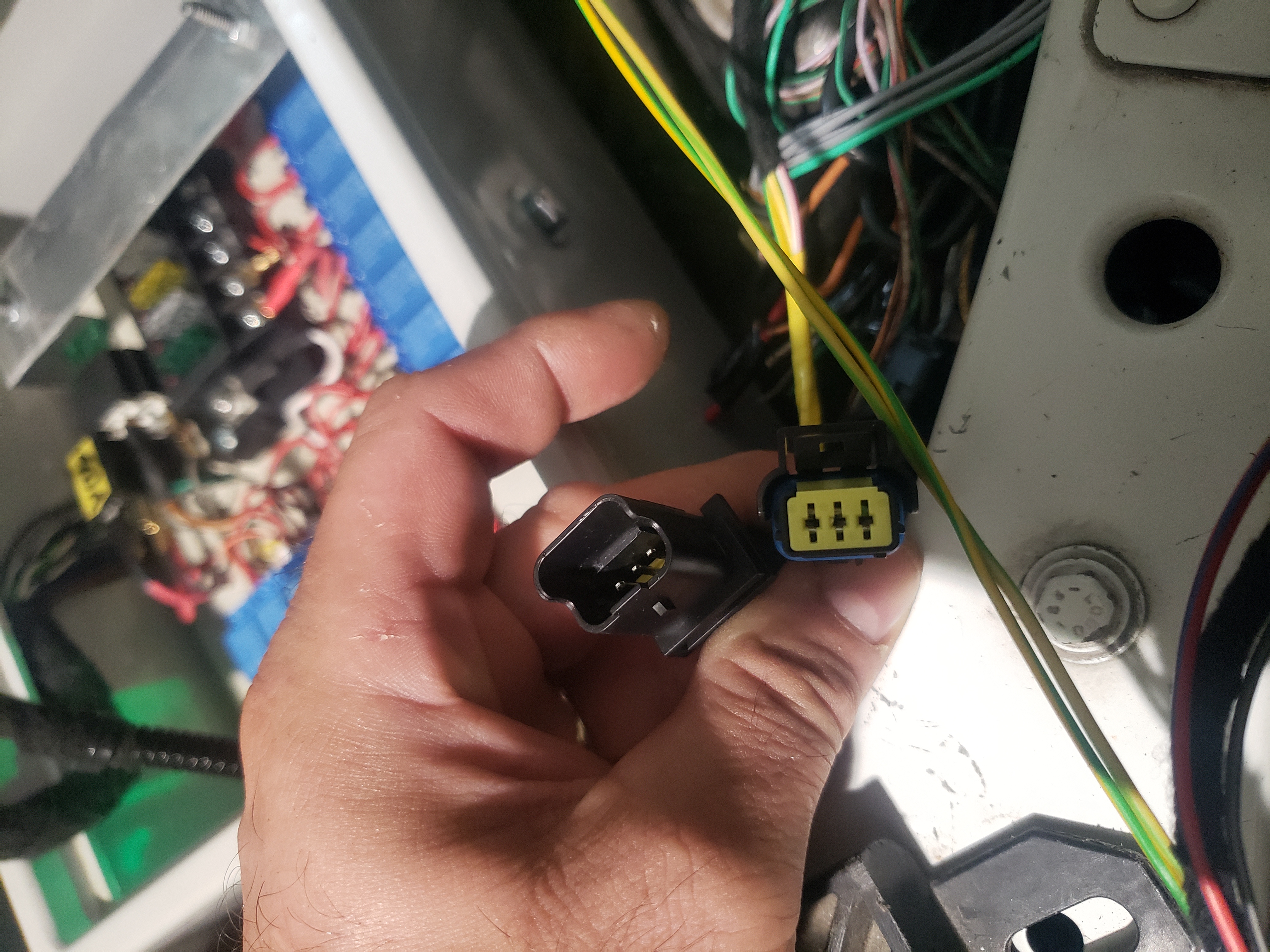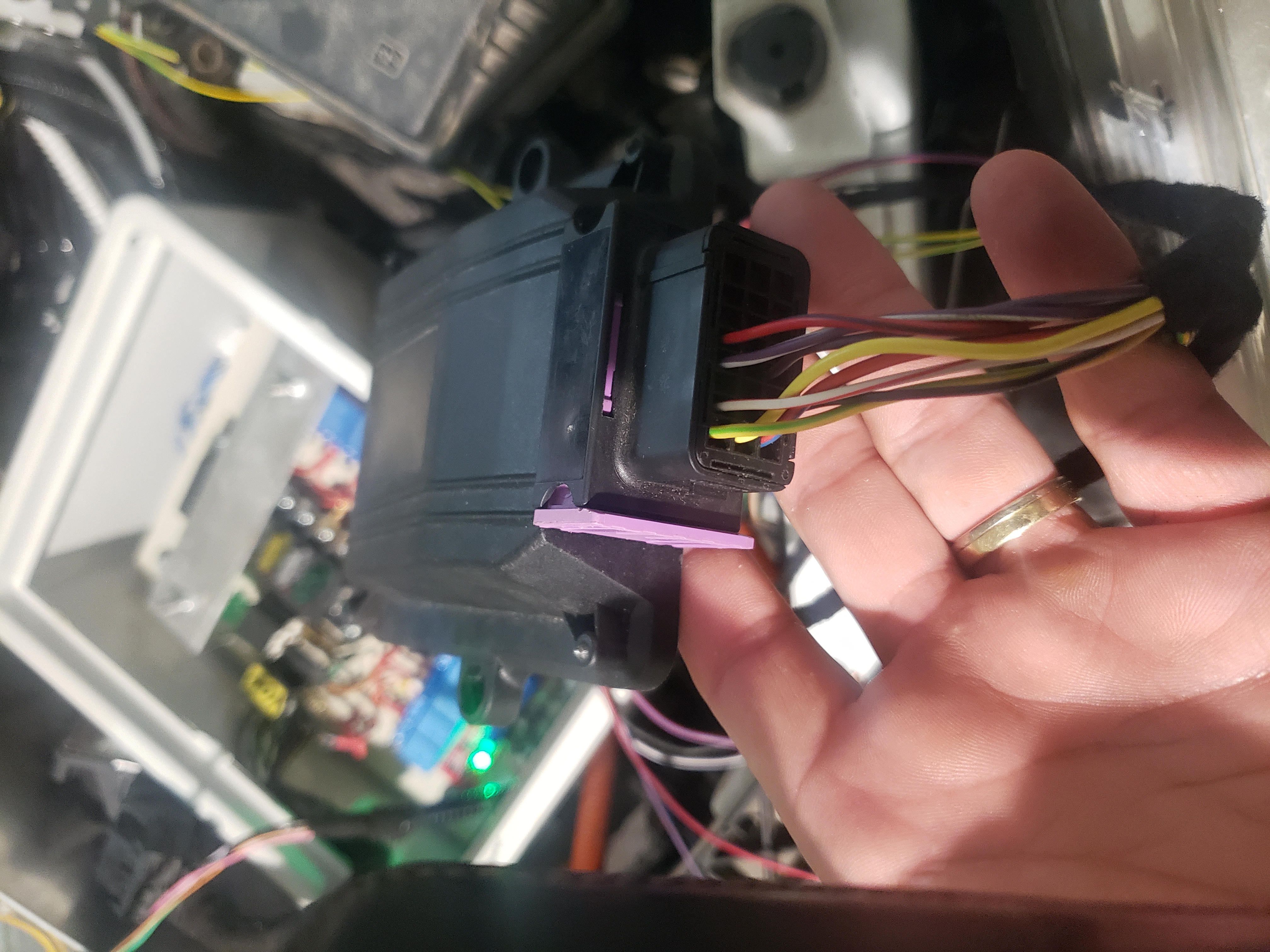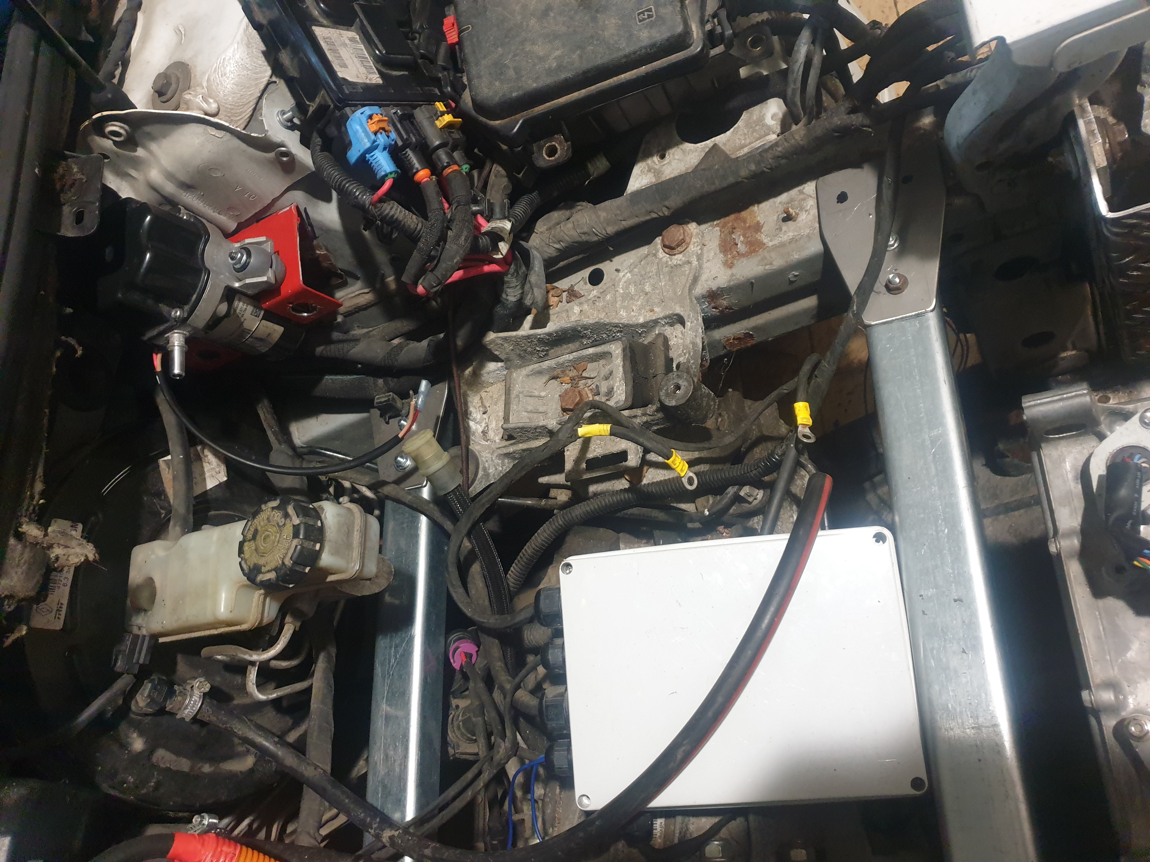 Fourth... i installed Outlander Chademo port at front. I managed to squeeze the connector under hood and relayed cables along the firewall down into the middle tunnel. Later i will connect this somewhere...