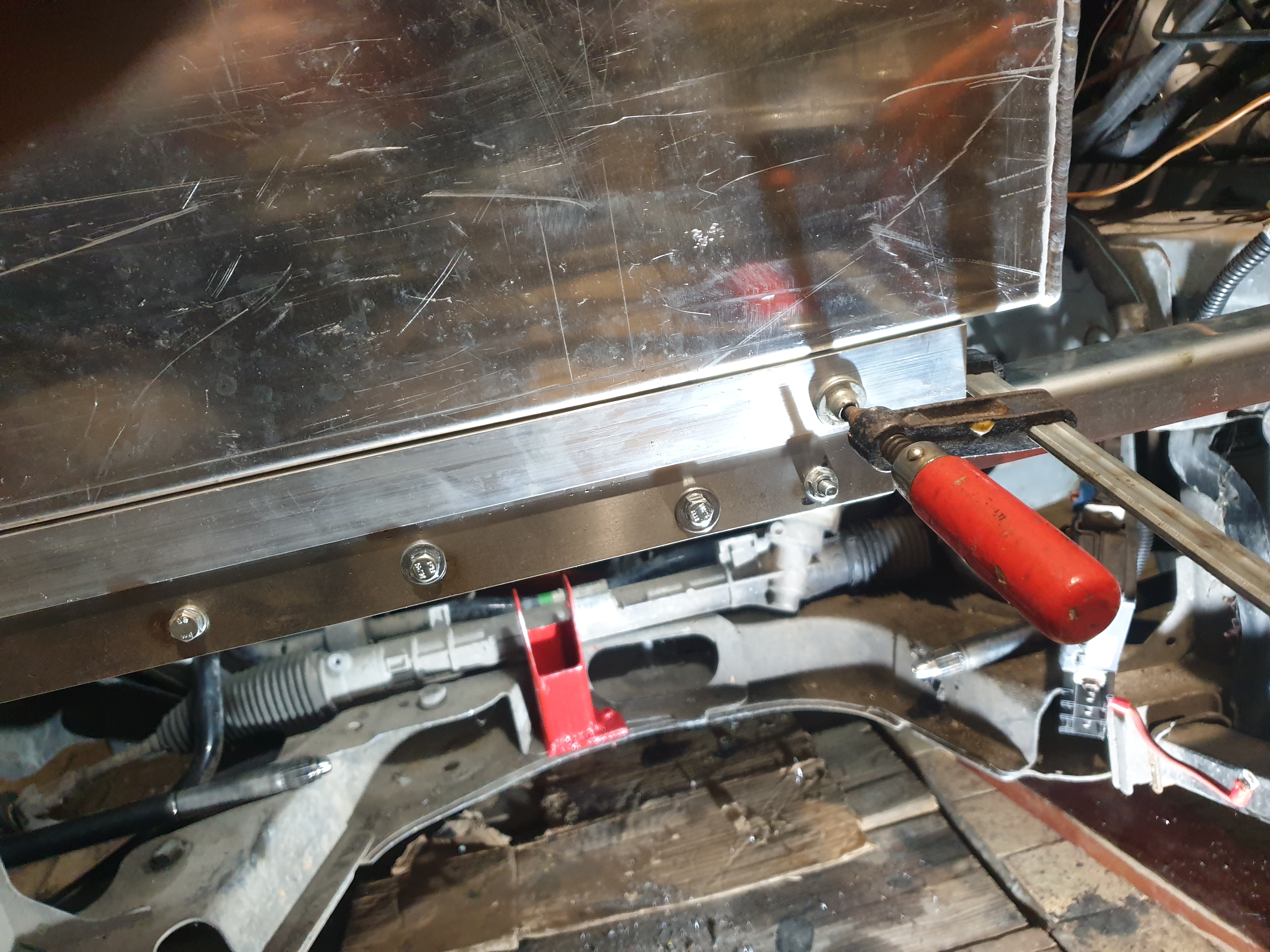 I decided to tack weld nuts behind inox plates to make assembly and dissassembly easier. From the front i will simply fit the bolts through the holes and tighten them.