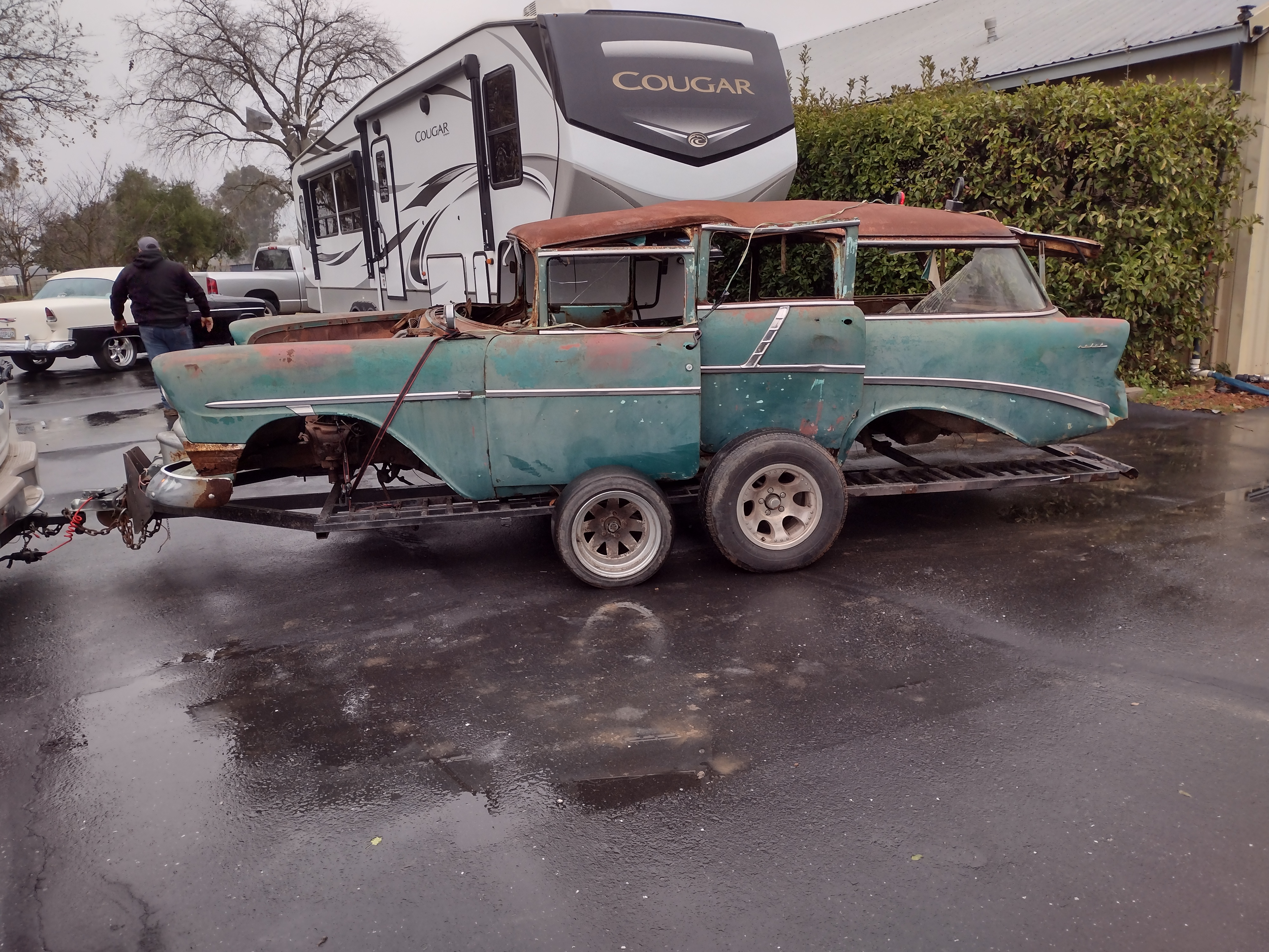 I guess I'd also add that I've chopped all the body parts off the rusted smashed 4 door, that car was about as bad as they get, but it did have a few good parts. I'm driving the 450 miles to southern california from sacramento to get a pair of 2-door hardtop fiberglass "race" doors. Shipping on anything this large is insane, I also got a 56 chevy windshield for $25, was only a 60 mile drive for that one.
