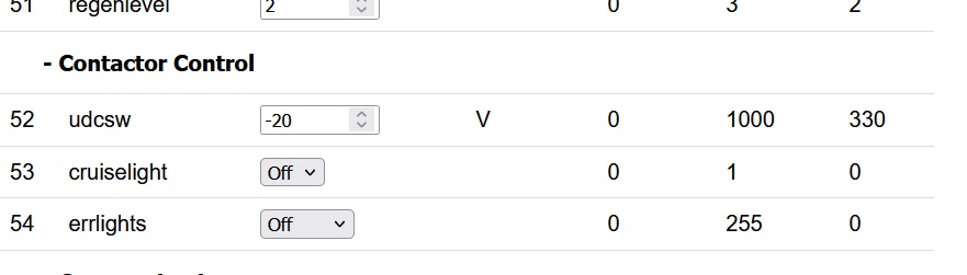 Recently I did a Zombie update to 2.20. Now I'm at the point where I want test the motor, but before that, I wanted to make sure that all component were connected and functioning well, so I fired up de Zombie webpage and saw that UDCSW had a value of -20 (negative). I have tired to change this value many times but it keeps reverting back to -20 after I hit refresh. Other parameters gave no problem changing them. I Have tried to change the UDCSW value with and without my components connected. I tried flashing the 2.20 software again this didn't result in what I hoped for.