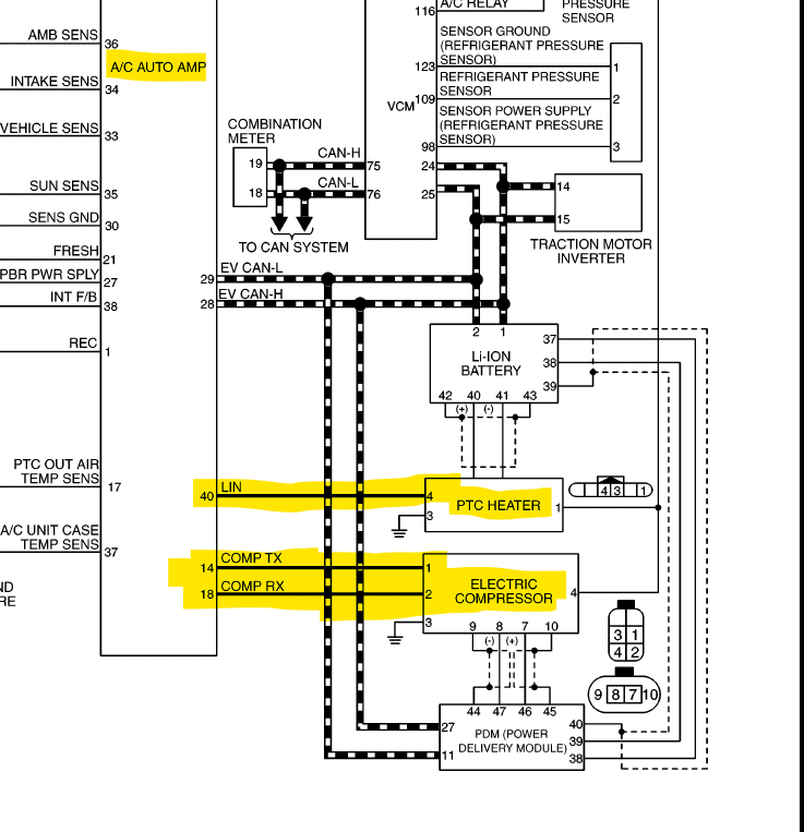 I've got a question for all on this thread. I noticed that the Nissan Leaf models without a heat pump do not have a direct LIN communication line to the compressor, but rather a "COMP_TX" and a "COMP_RX" to the compressor. These compressors are the Panasonic ones. It appears that the PTC Heater communicates directly, via LIN, to the A/C Auto Amp, which in turn communicates via two communication lines, one TX and one RX, to the compressor. So, it appears the A/C auto amp converts the LIN signal to a UART(?) signal that the compressor can understand. Does anyone know if the same LIN signals we've been discussing on this thread would work for the Panasonic Compressor? If so, how are these signals converted to the two-wire signal that the compressor understands? If not, any ideas?