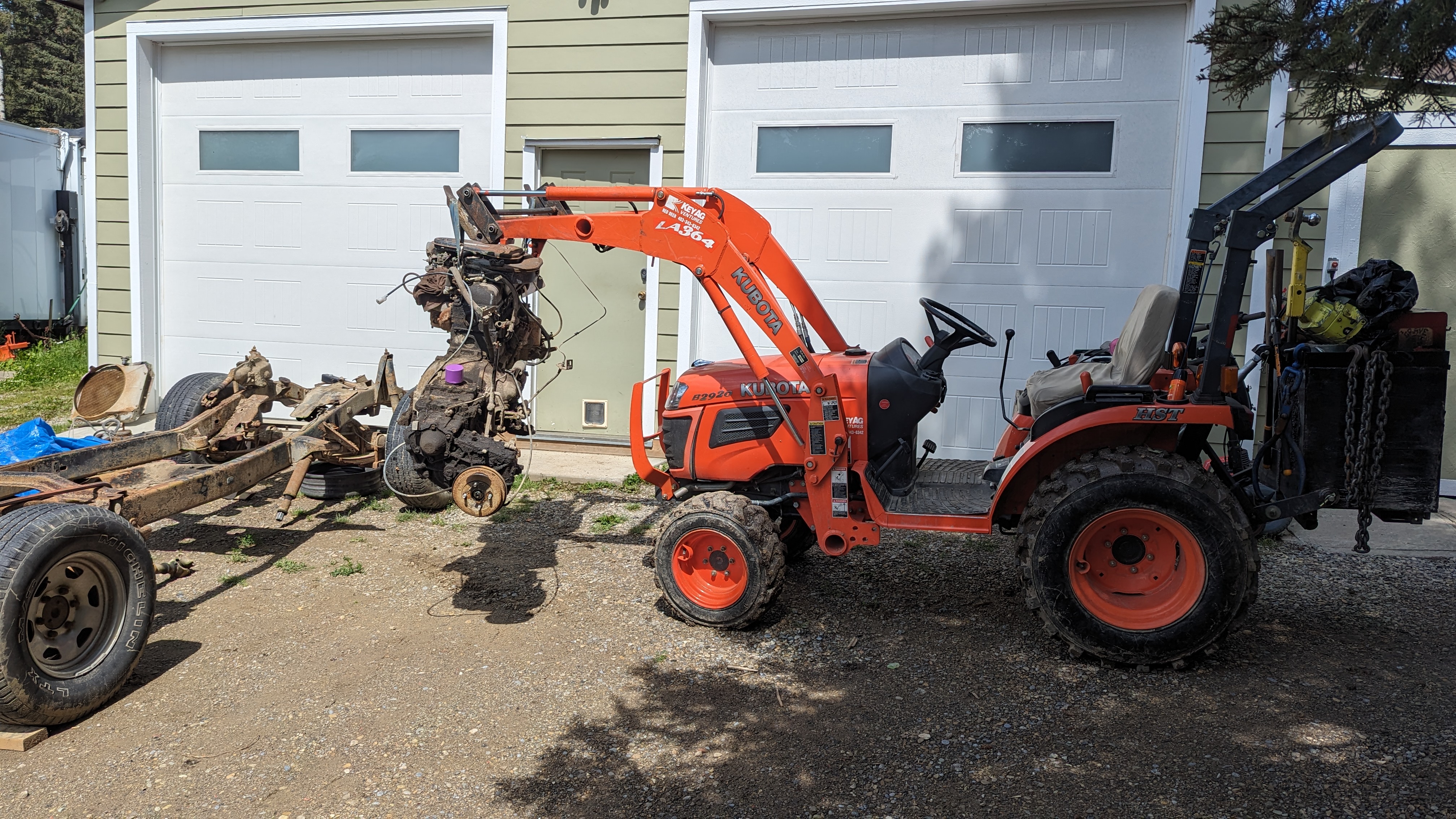 Next I guess I'll introduce the L110F to its new home and remove extraneous motor mounts. Try to get as much 'outside work' done as possible before the snow flies. I'd like to get the tub back on the frame atop the L110F (even if temporarily) before winter. My shop is sizable (28'x36') but I don't have room for a rolling chassis plus rotisserie plus i3 battery pack plus engine stand.