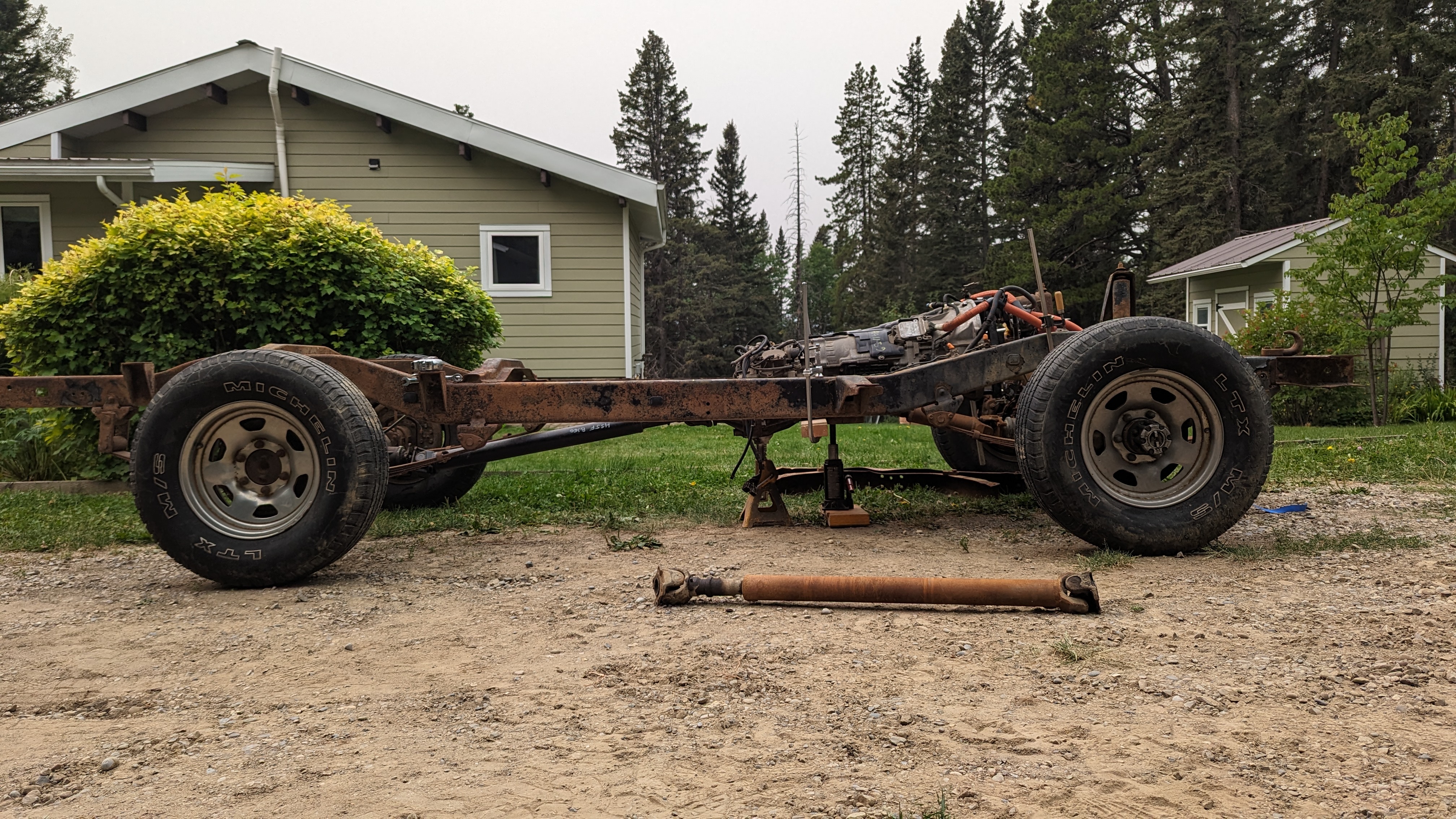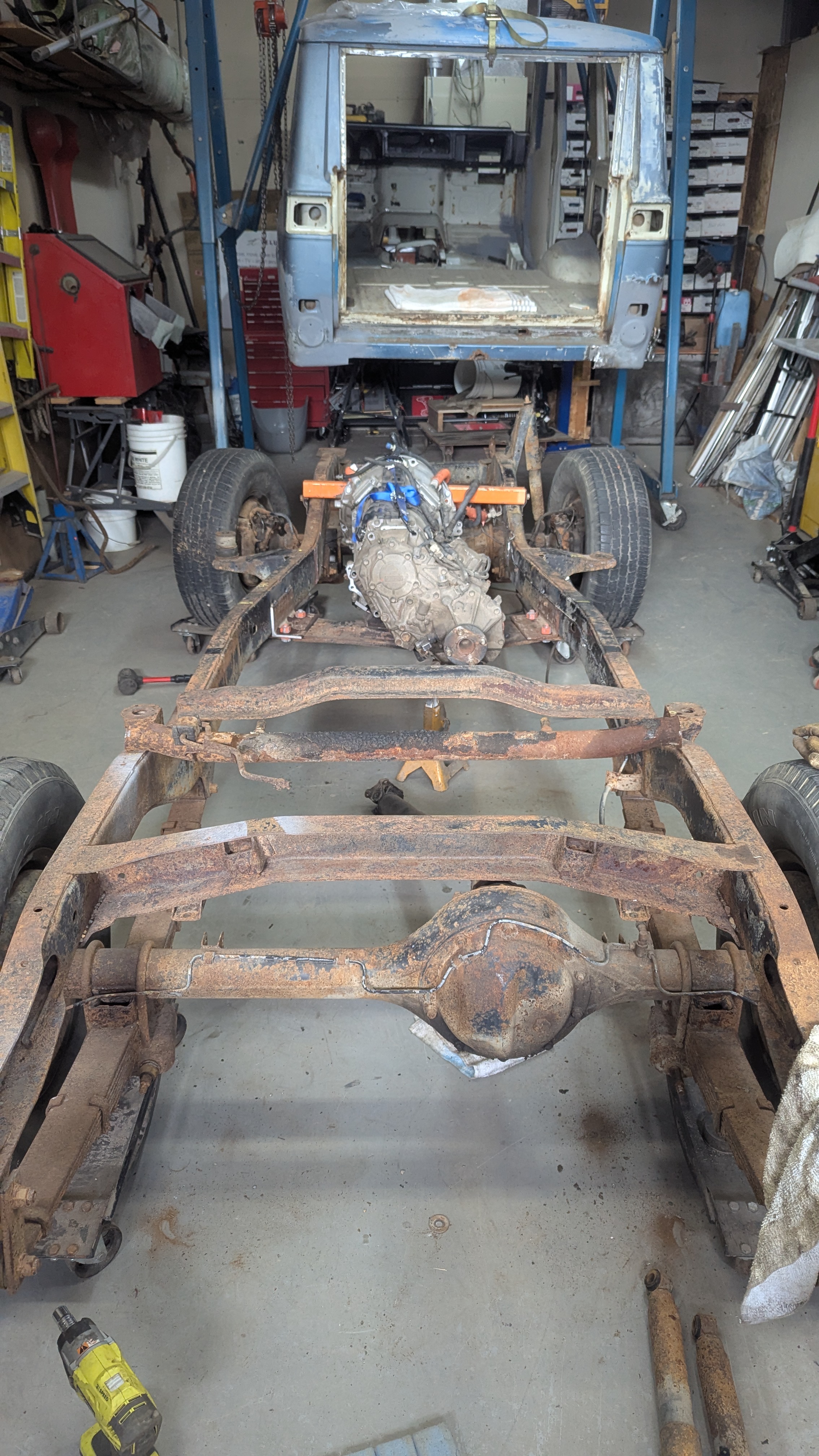 Also pulled the old drivetrain, removed a bunch of heat shields, skid plates, etc and pressure washed the frame.