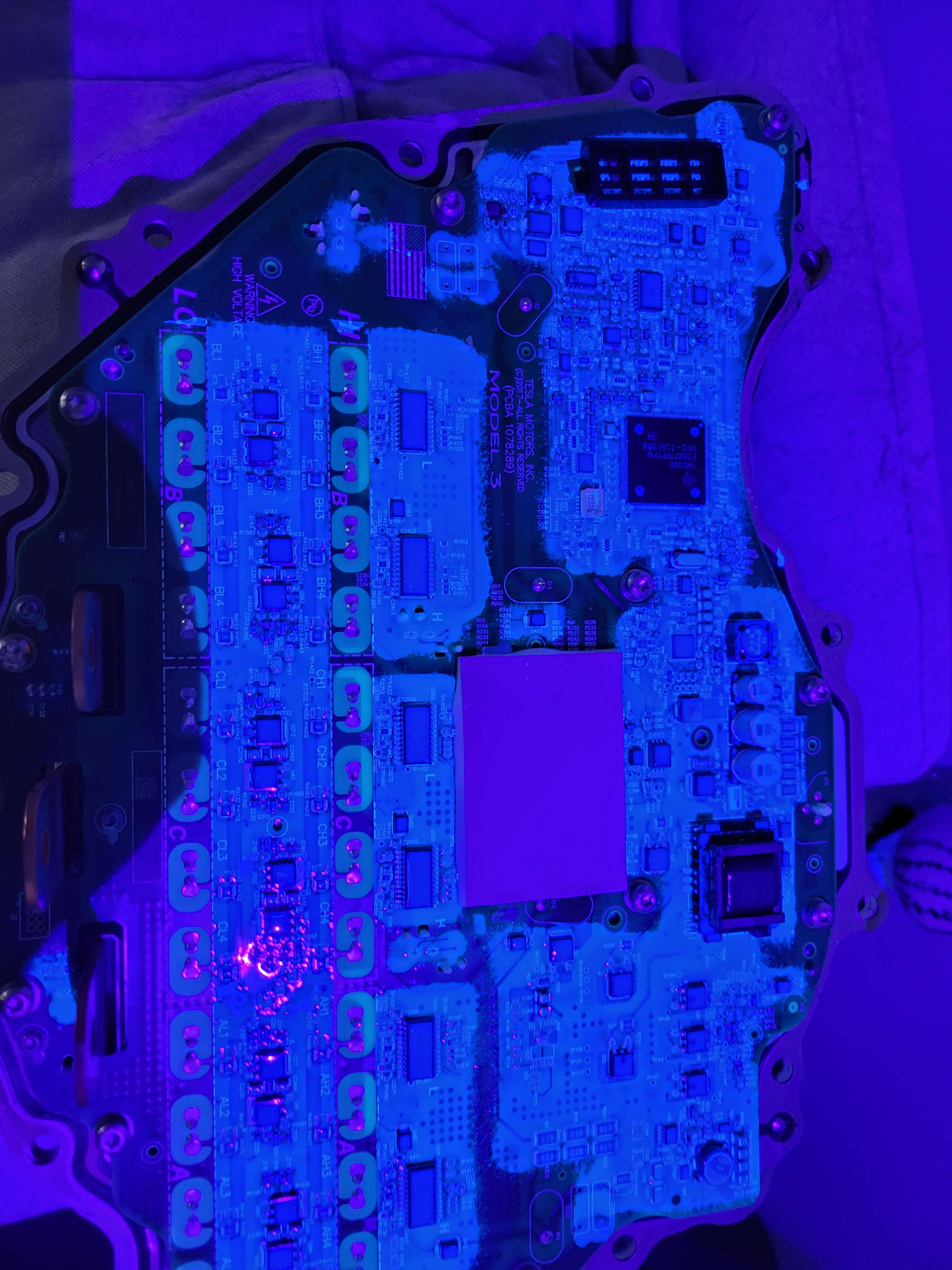 UV/blacklight (I have party store blacklights at home and they work as shown) as conformal coating is uv reactive