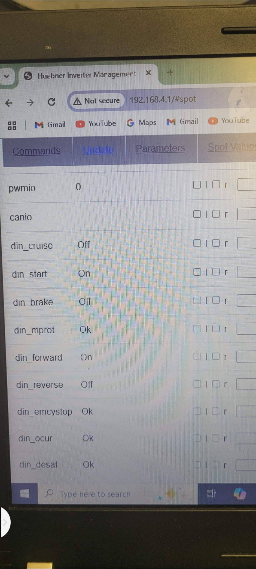 What I noticed was I had my "laster" on PRECHARGE, I don't know it it should be like that because as I followed the video and put in some of Damiens parameters, it changed to TMPMMAX and opmode at that time changed to RUN. During that stage the light bulbs connected on the inverter output stopped blinking meaning the was no PWM coming out.