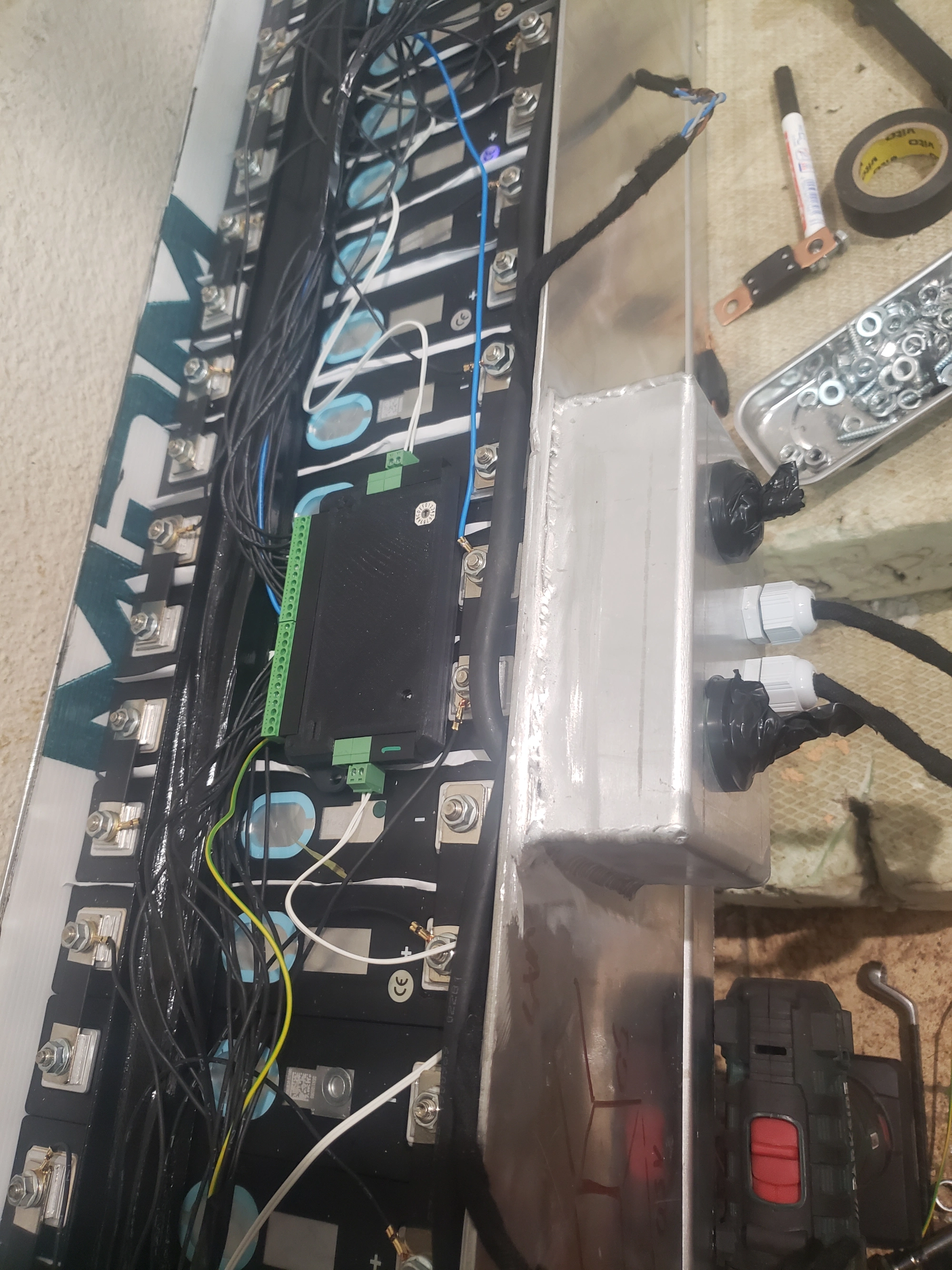 All those cells will be secured against overturning by inox U profile bolted at each end of the box. I will strick some isolation material under the profile so its sharp edges wont nick BMS cables.