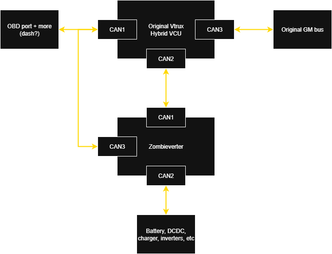 I was thinking for the next time I have to do this I'd like to do it with something that is more permanently installed rather than a laptop running a Python script with wires going into the engine bay, and I was thinking the Zombieverter would be a good candidate for this, I could use 2 of its CAN ports to bridge the EV can bus to do the same modification I did before, and then I could use the third to tap onto one of the original GM CAN busses to be able to get more information about vehicle states, such as speed, shift position, etc. I could also give instructions to other Vtrux owners - get a Zombieverter, make these wire harness modifications, and load my custom software and you're good to go.