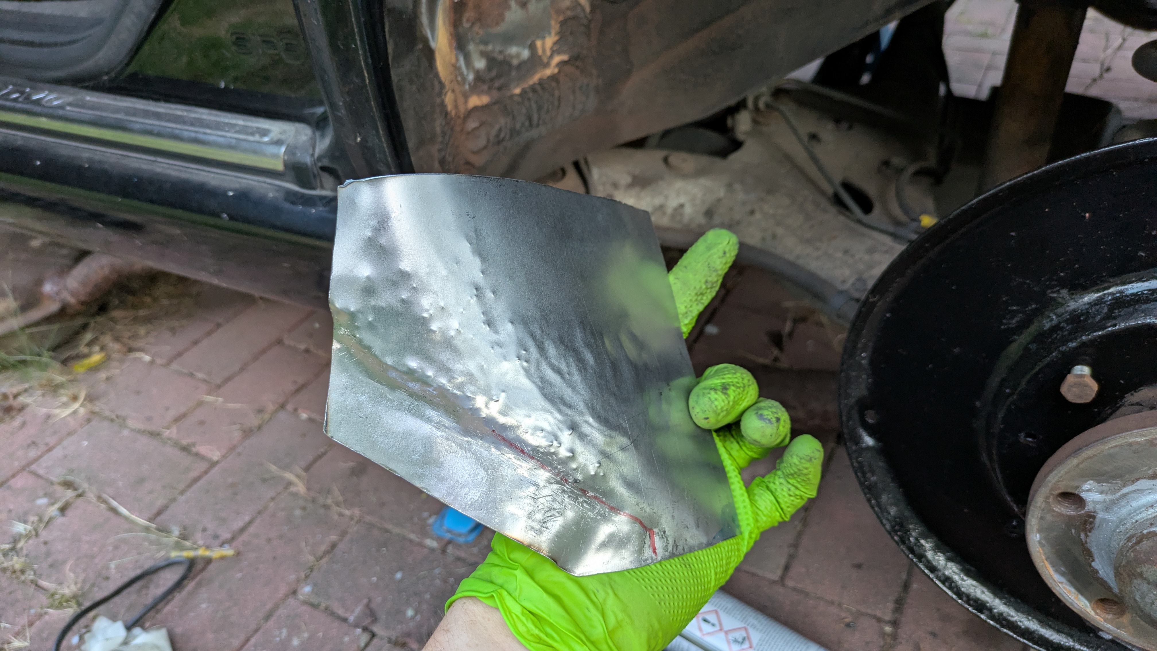 As you can see, the inner metal structure is fortunately in excellent condition, so there is no need to repair it. To make a metal patch, I first created a paper template that fits exactly into the spot. This was a bit tricky because there is a bit of a depression in the metal which obviously does not transfer to the paper. To compensate for this, the metal was cut out with ~1cm more "meat" on the circumference.