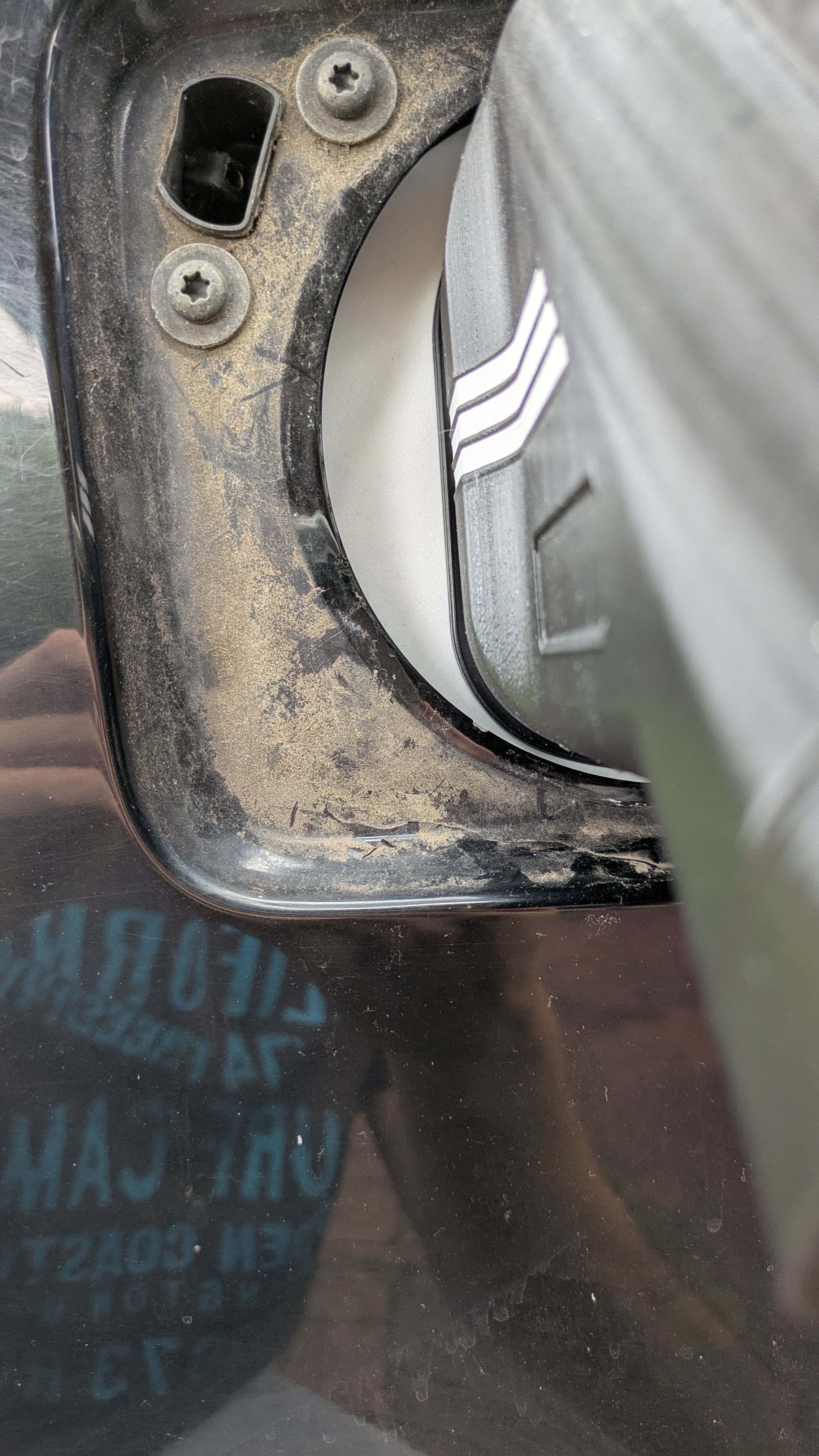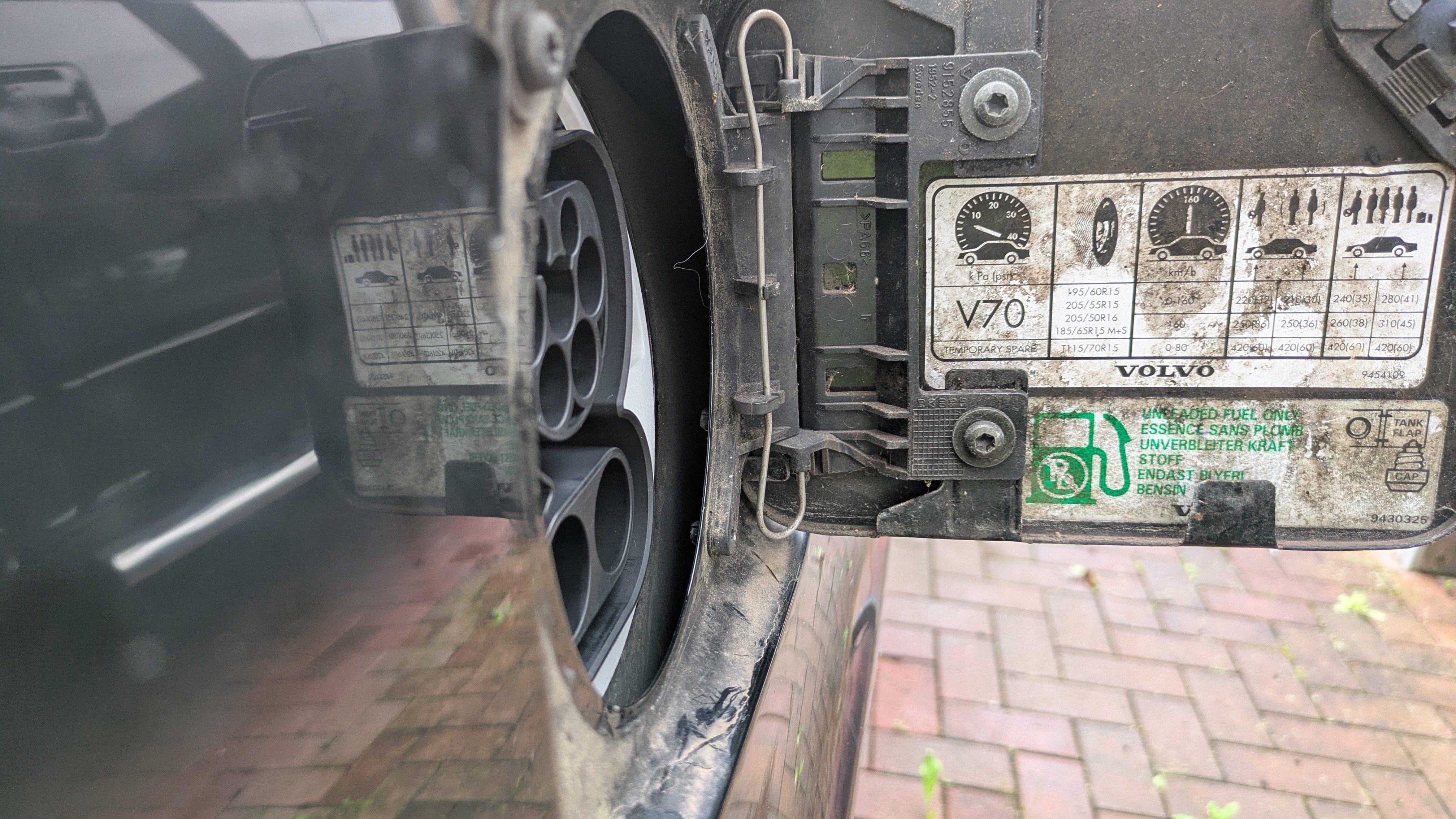 I really wanted to avoid this, but overall it's not so bad I think. The dent is behind the carpet. This is how the connector sits in the filler port. In the first iteration I wanted to place the connector at the outer sheet metal, but that wouldn't allow the fuel door to close.