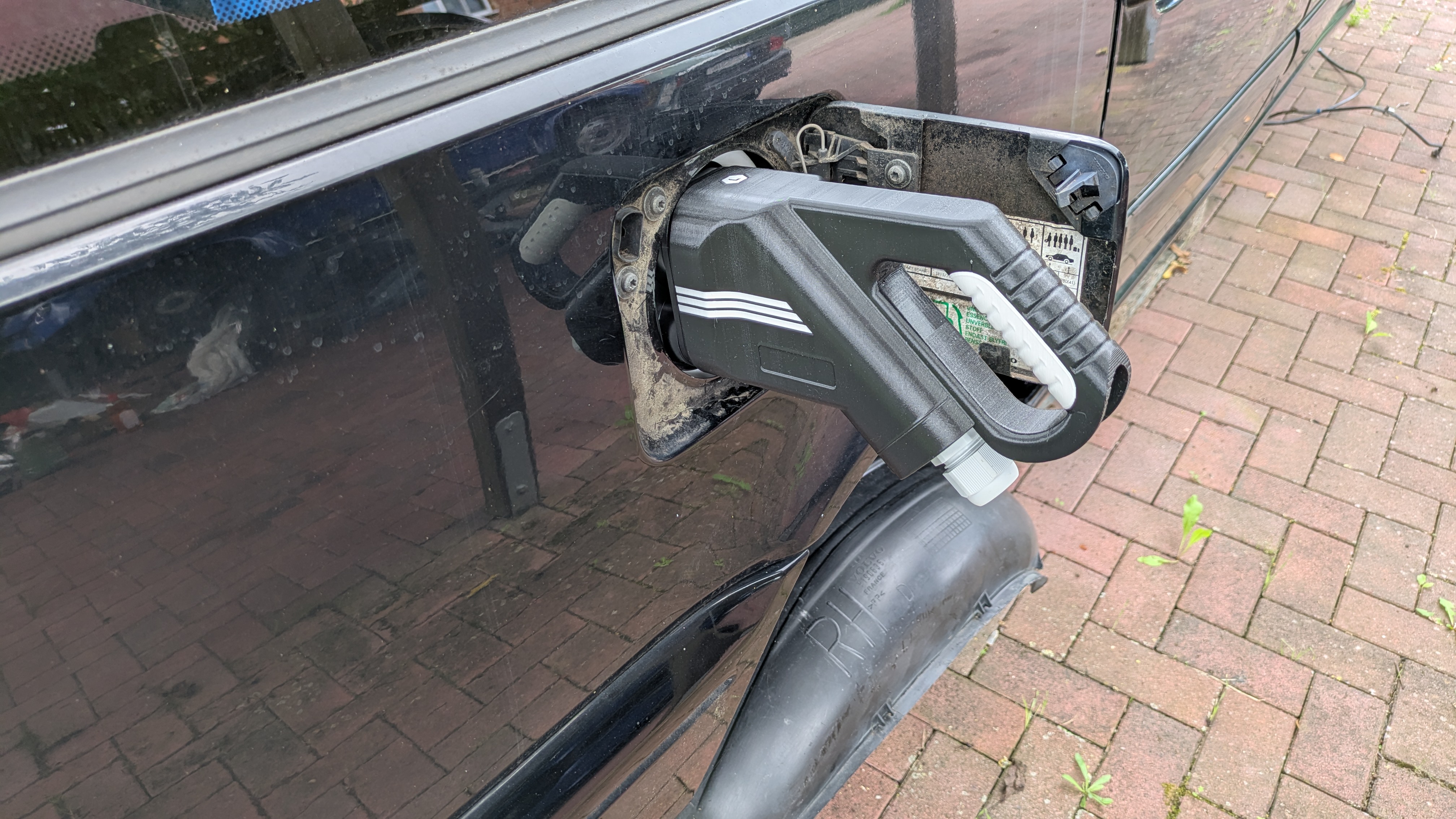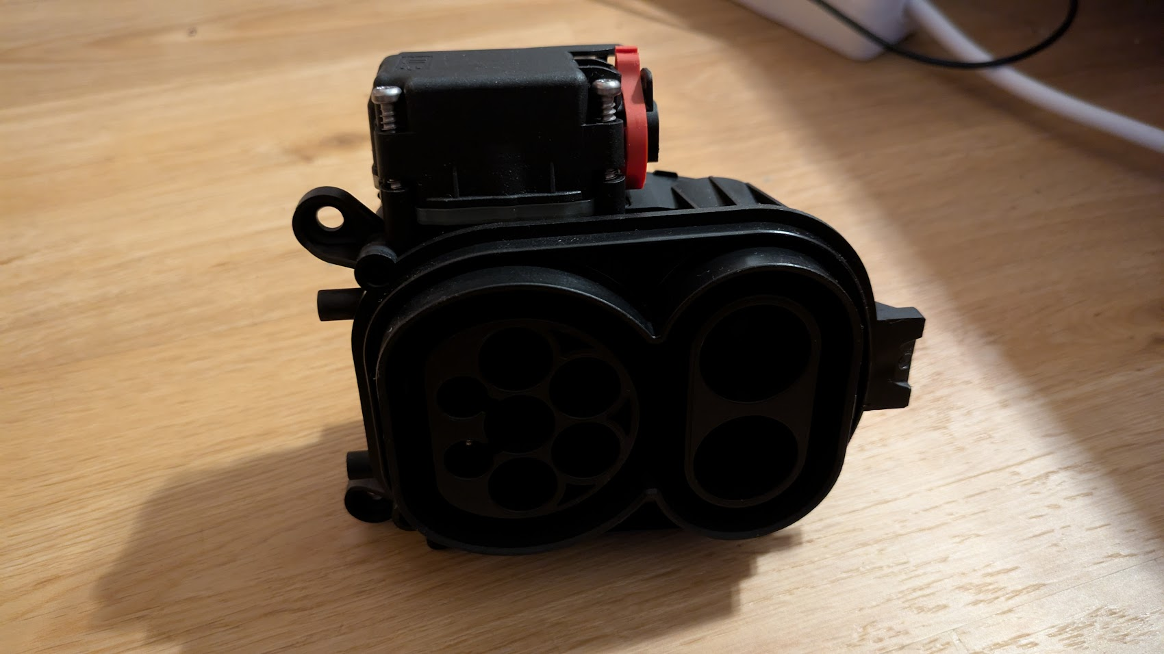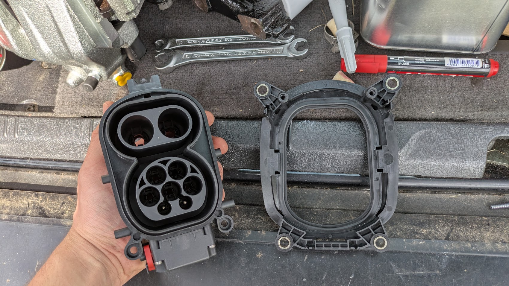 The TE CCS2 port arrived last week and I worked on mounting that in the old fuel filler location. This was not super trivial because there is not much space. The TE connector is very slim, but it was still super tight.