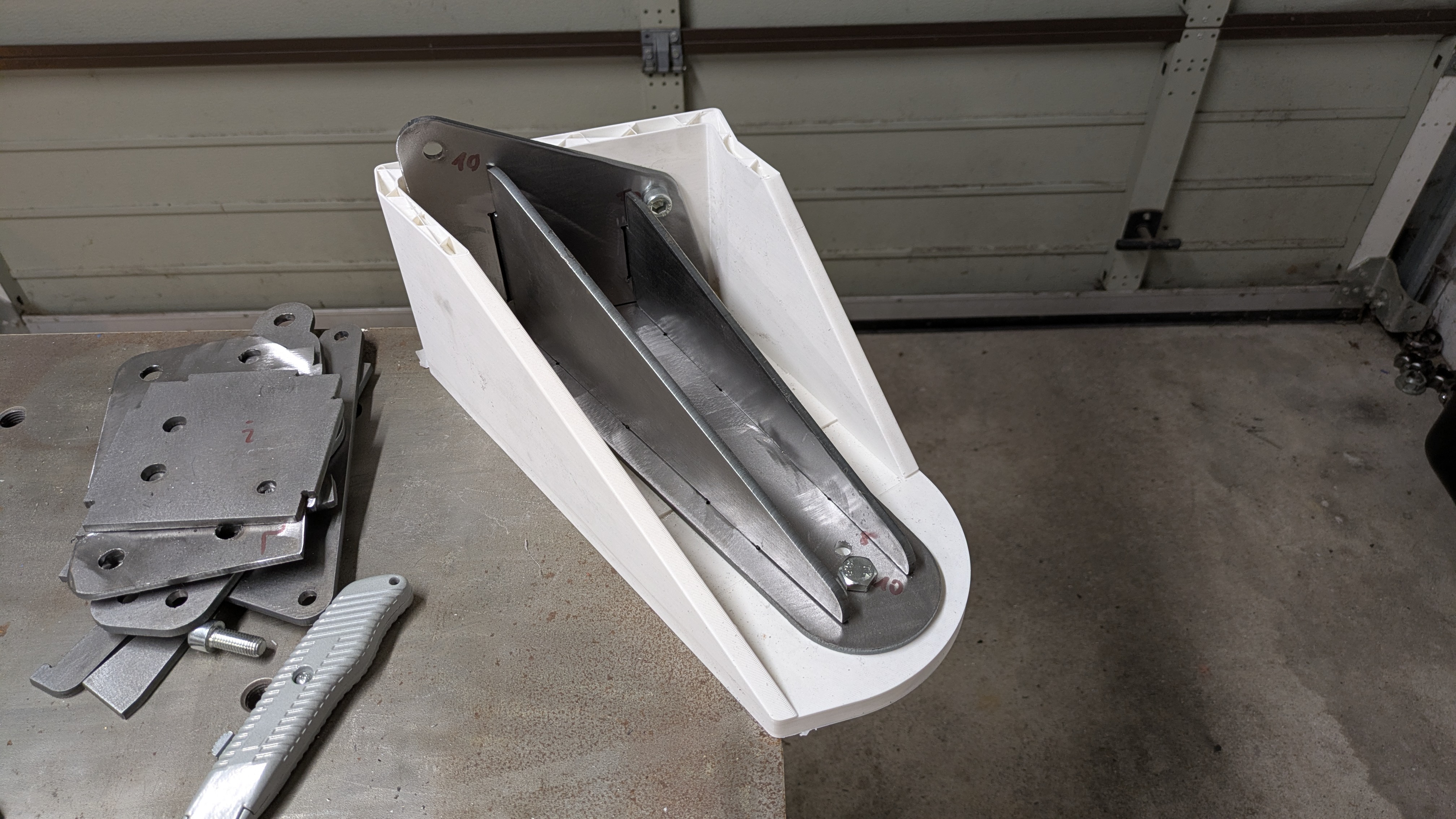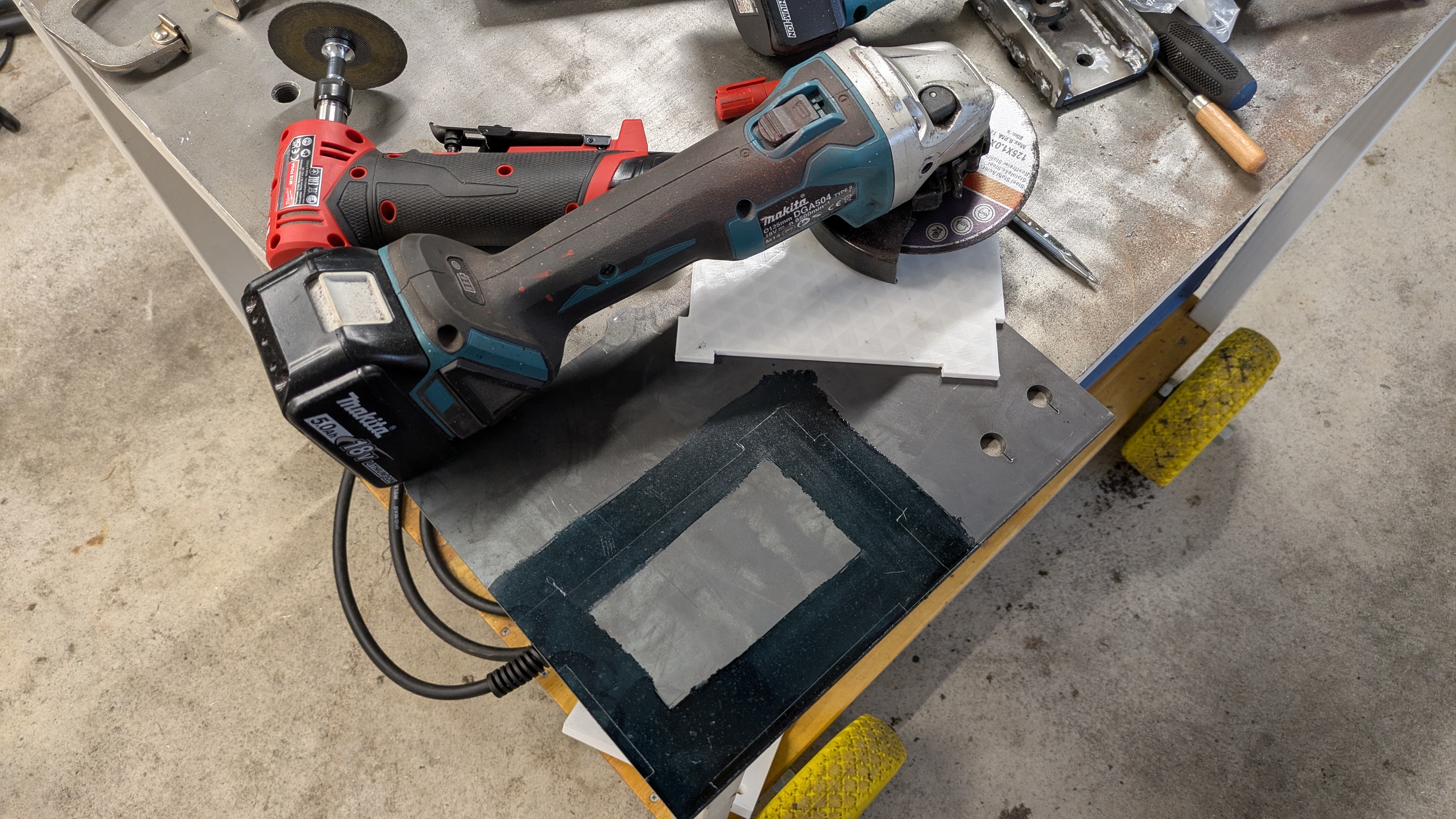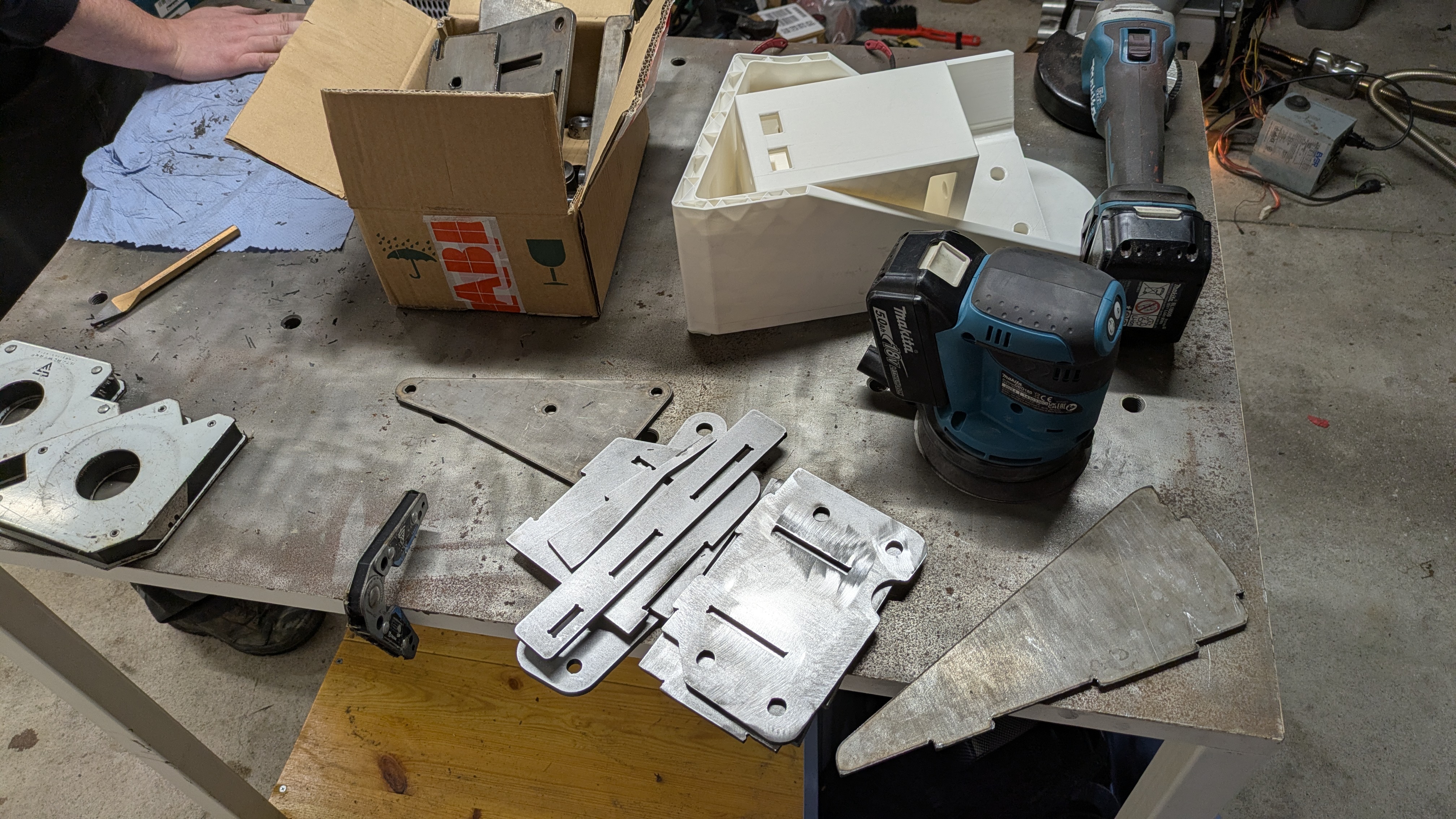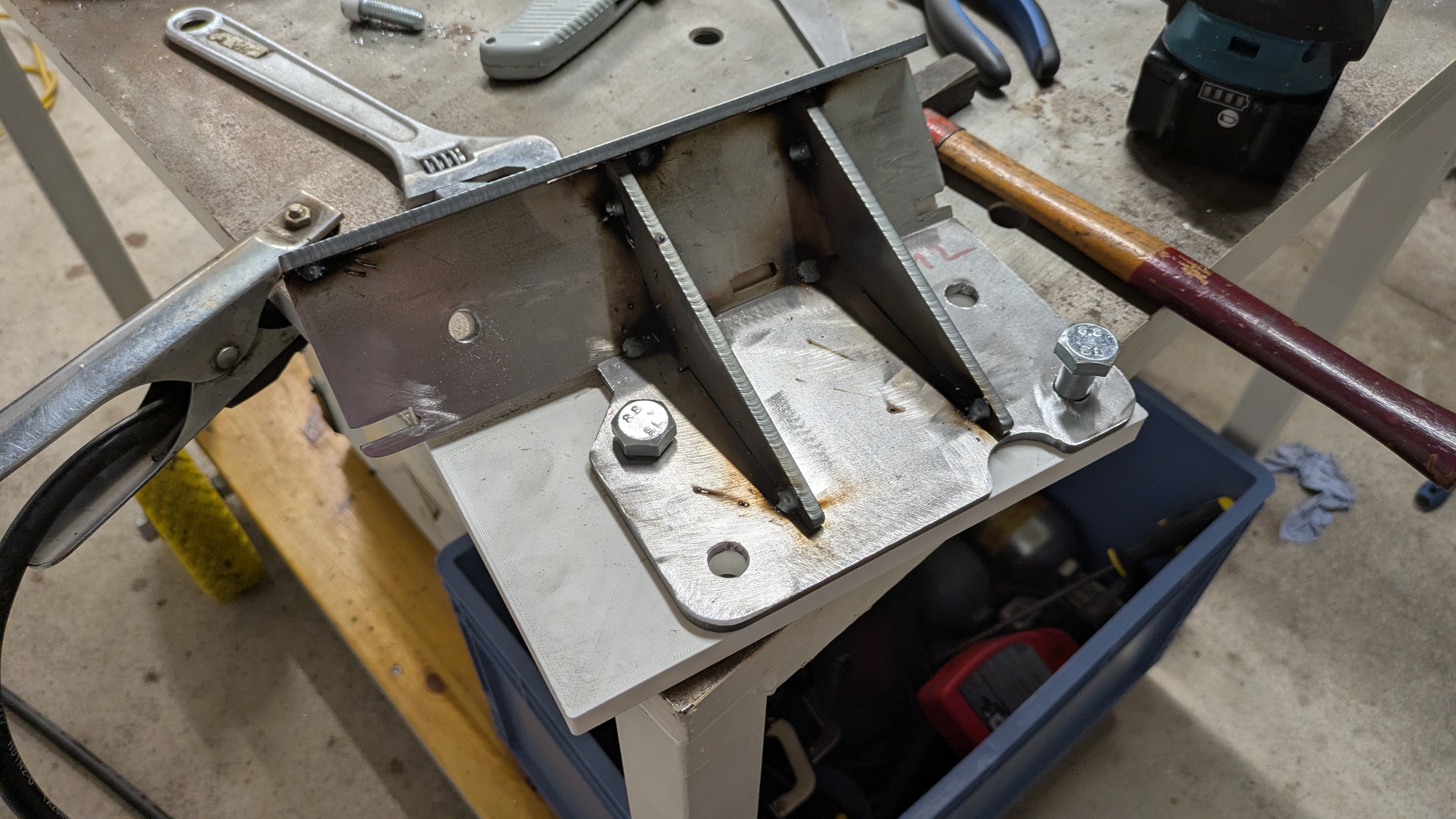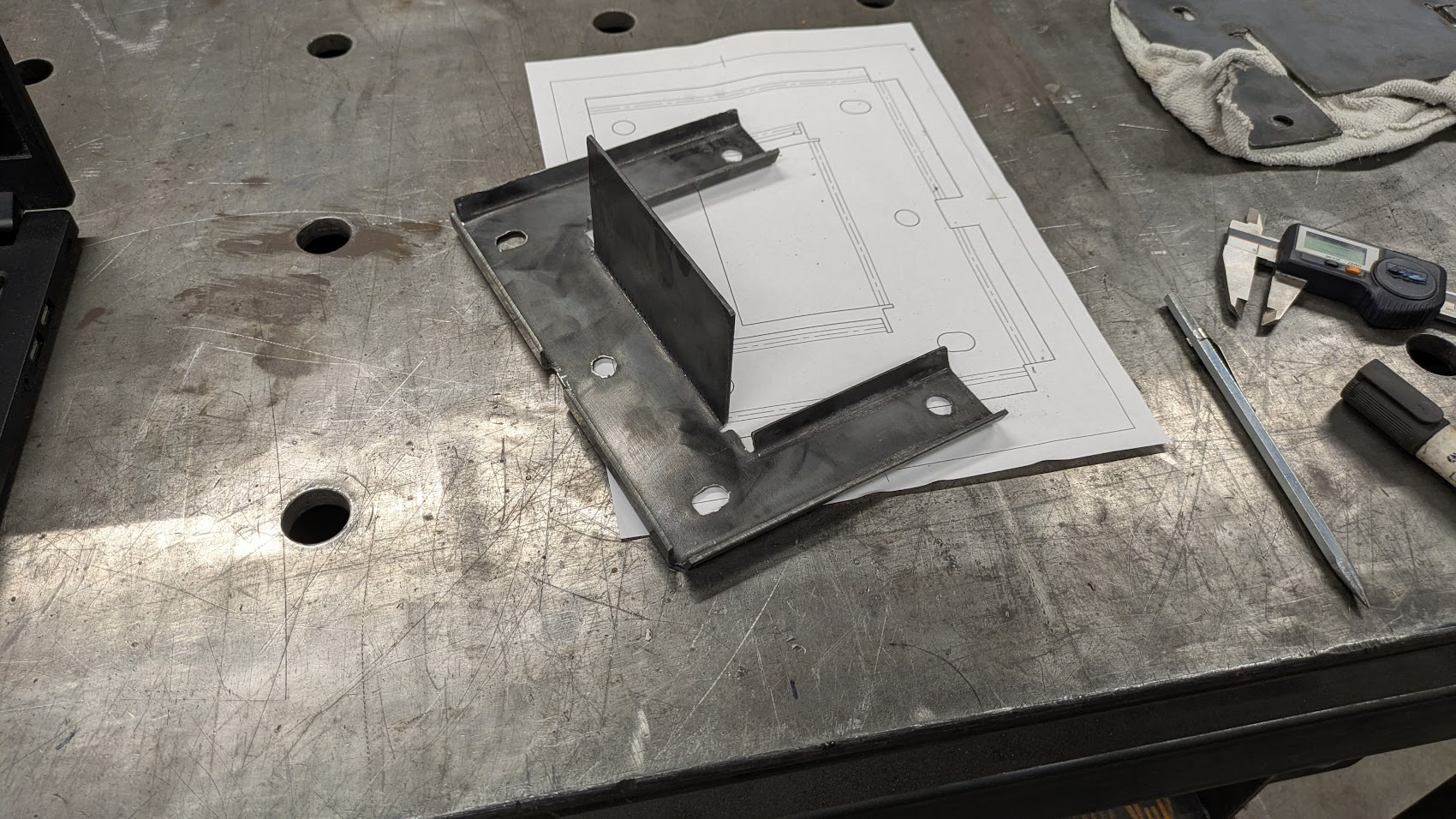 It all started with grinding off the (very light) mill scale and redrilling the rough holes from the plasma cutting: I prepared some 3D printed jigs to align everything. I welded some tacks and removed the jig, the PLA would just melt with the high temperatures. Unfortunately I missed a piece during export and didn't notice it when my partner sent me the picture of the puzzle plate.