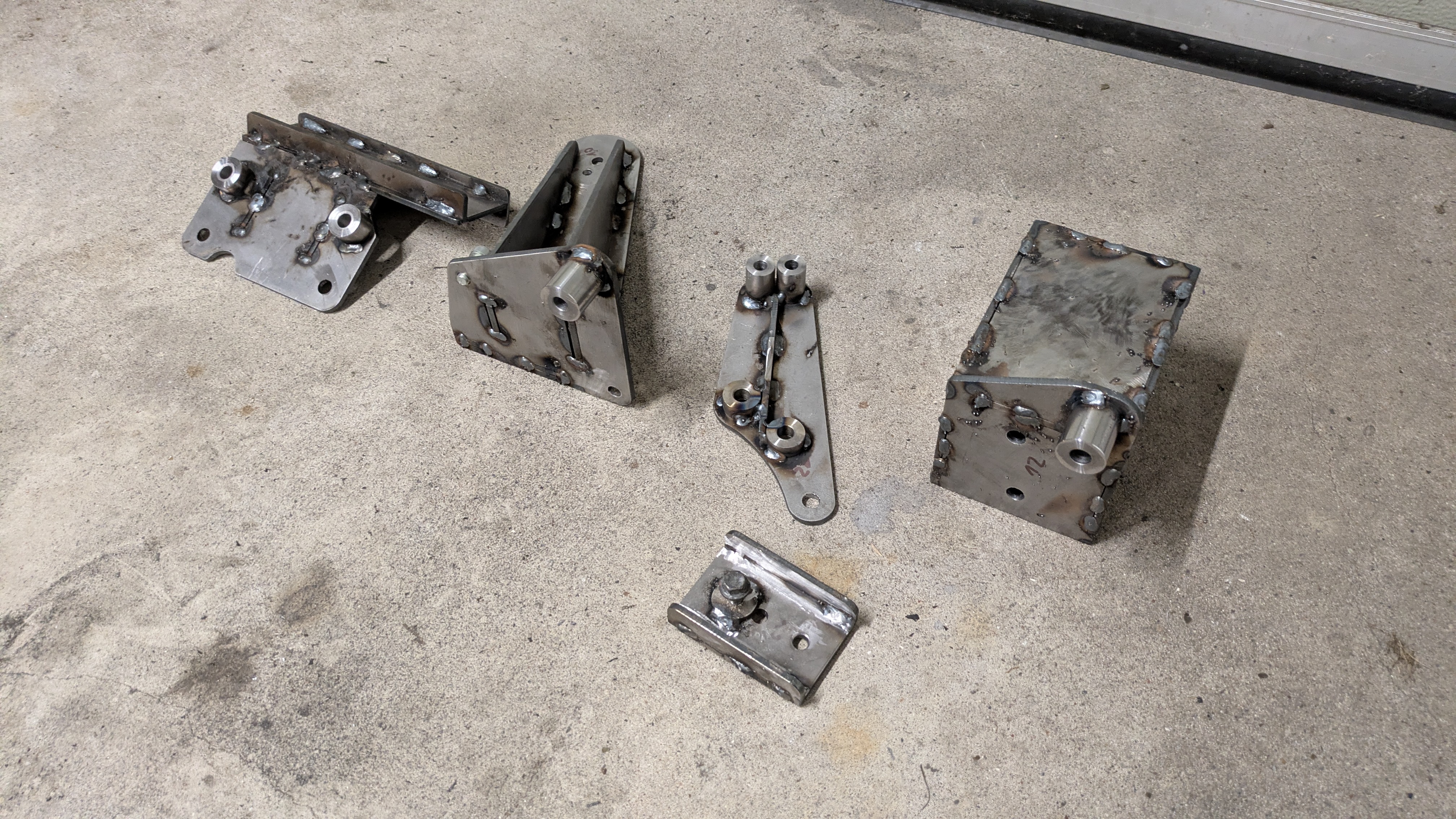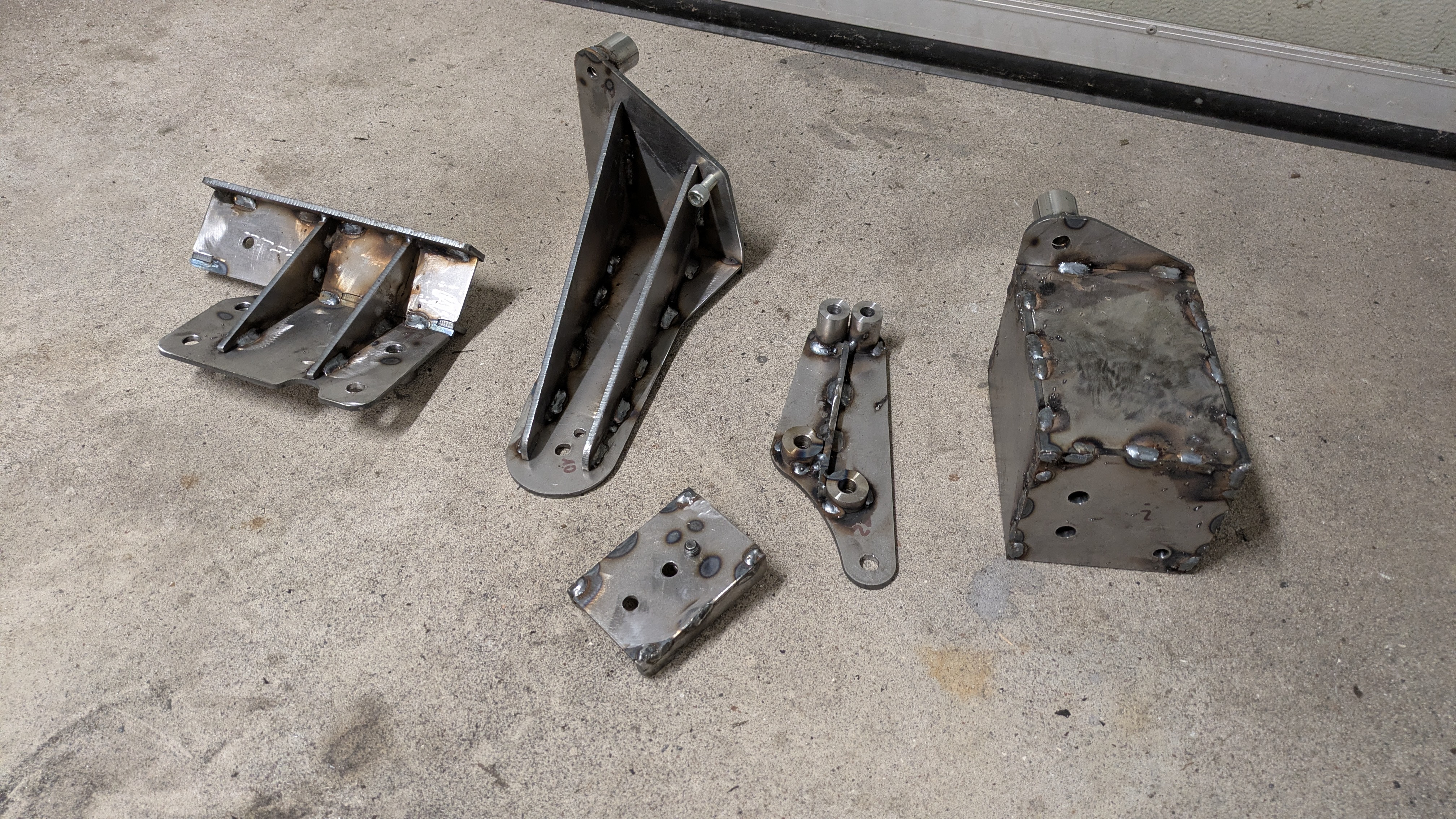 It was a bit annoying that it was 6mm instead of 5mm, so some additional filing was required, but hey, it let me complete the mount nevertheless. Here are some group photos of the completed mounts. I did not weld everything fully to limit the risk of warping. Also it does not necessarily add more strength. Unfortunately I made some mistakes during assembly and one during the design. The stiffener plate was welded in wrong, so I had to notch it to make some space for the engine mount.