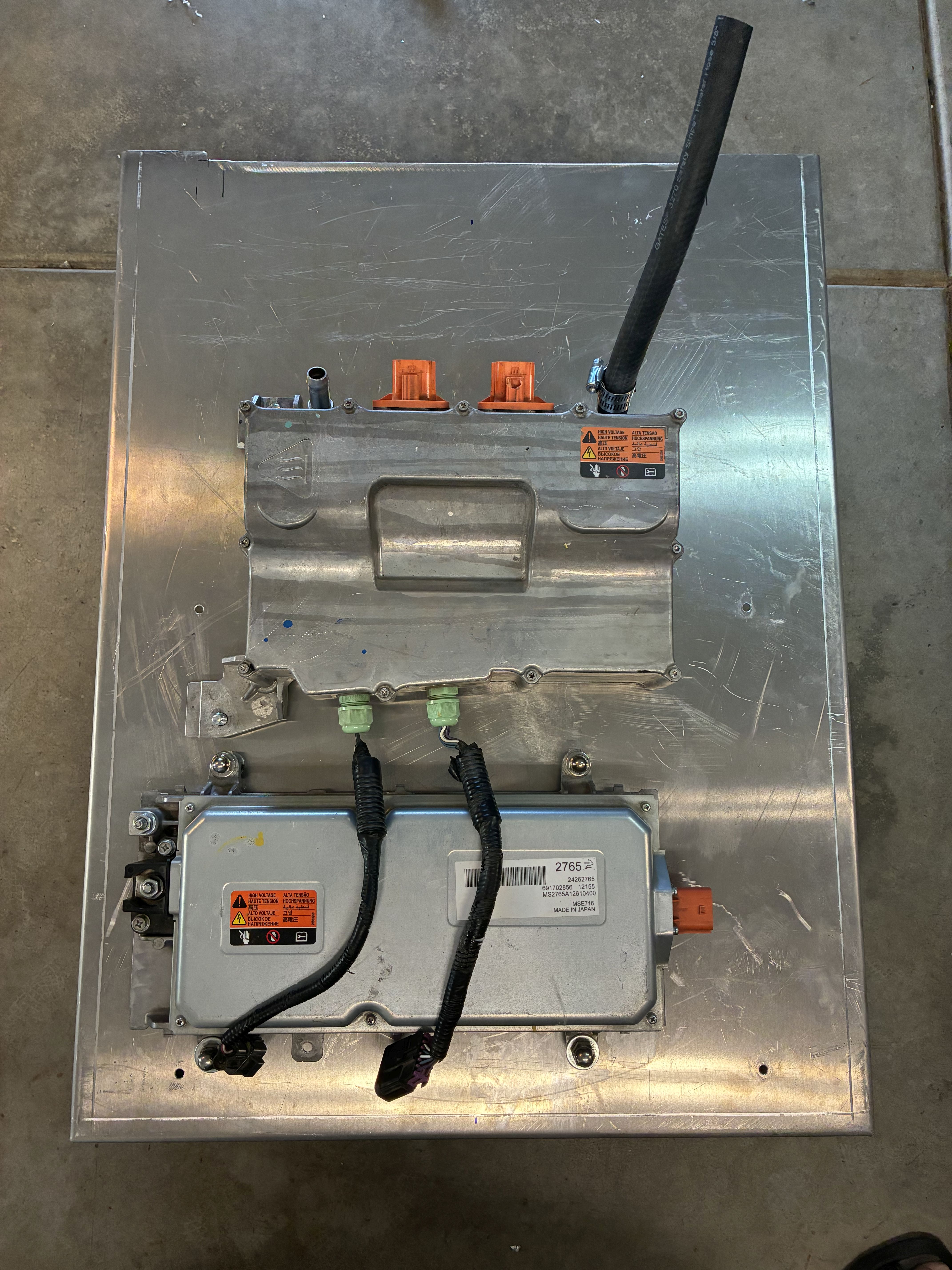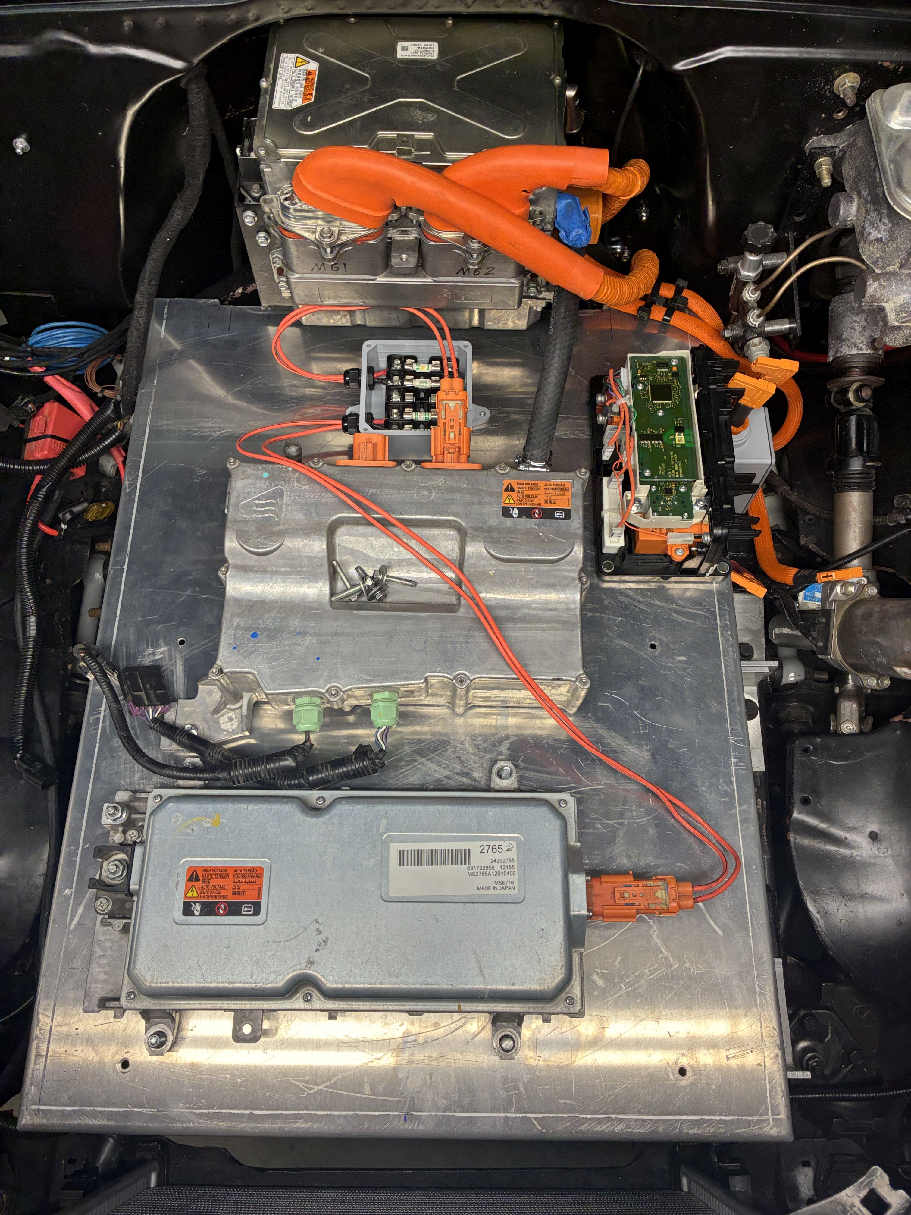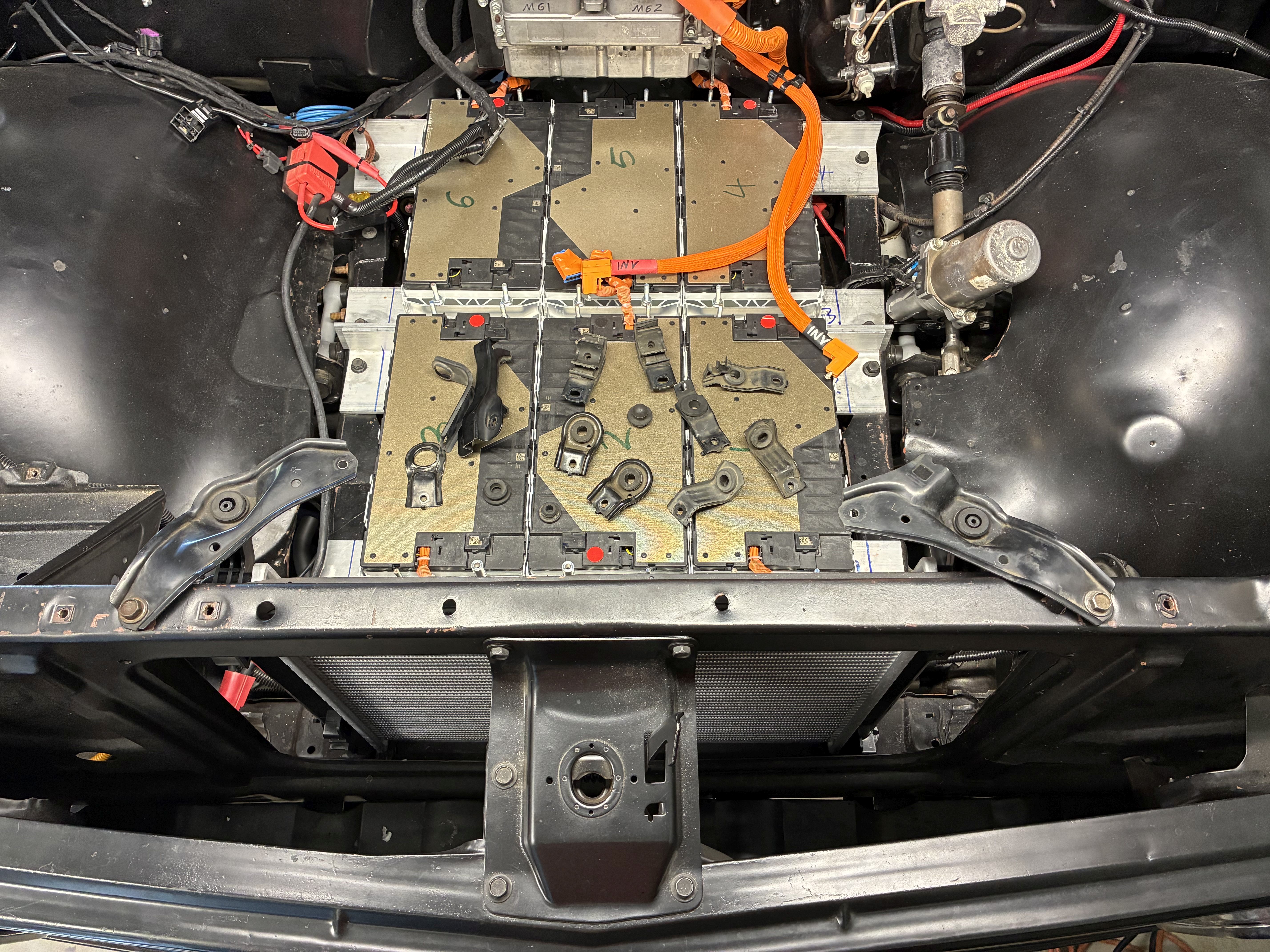 here I am remounting the 1st Gen Chevy Volt DC-DC converter (for now) with my beloved acorn nuts, which turned out to be way more P.I.A. than it's worth, I highly do NOT recommend using them as the bolts have to be perfect or a bit shorter length to allow full tightfullness or they will bottom or should I say top out !