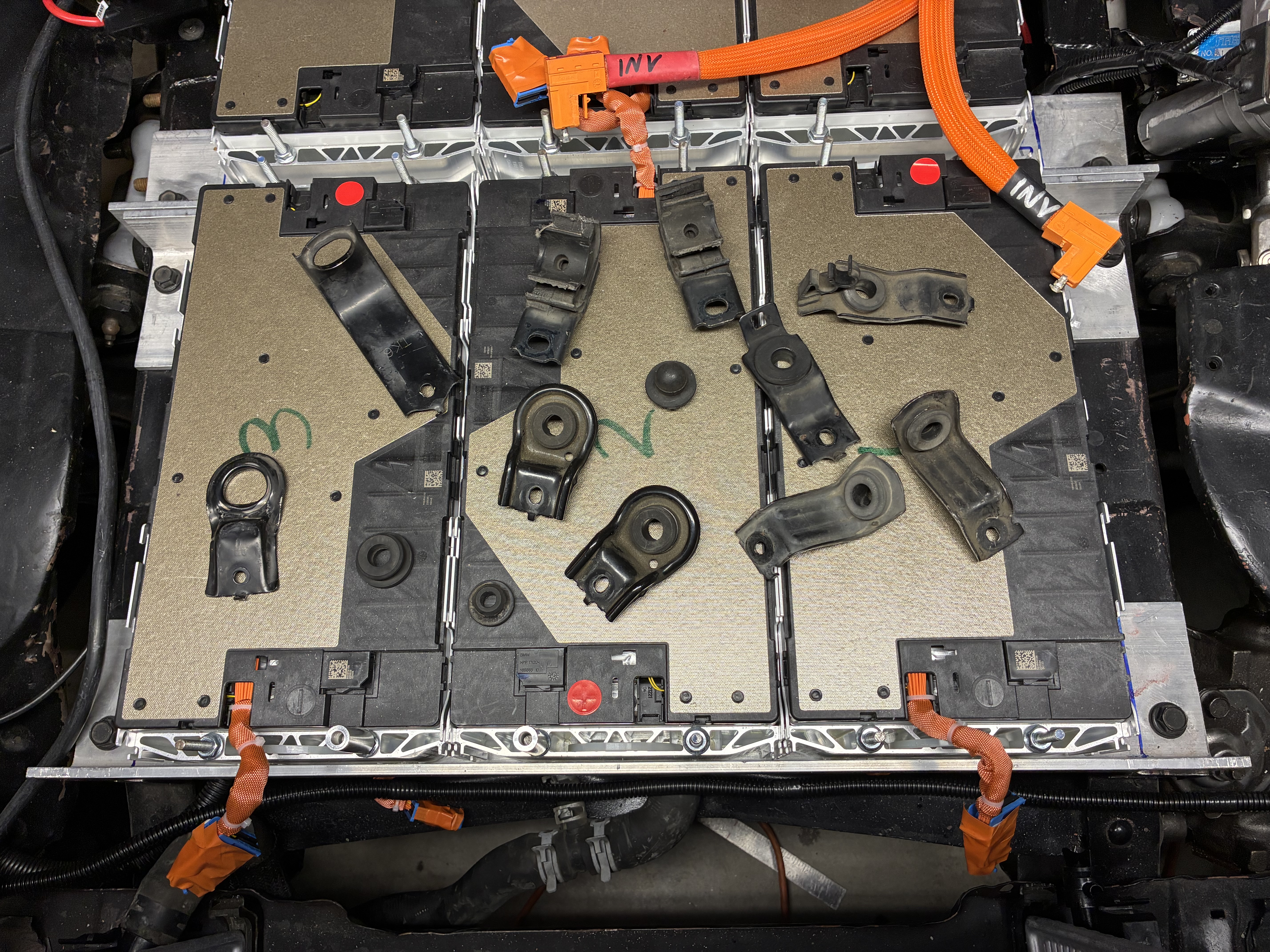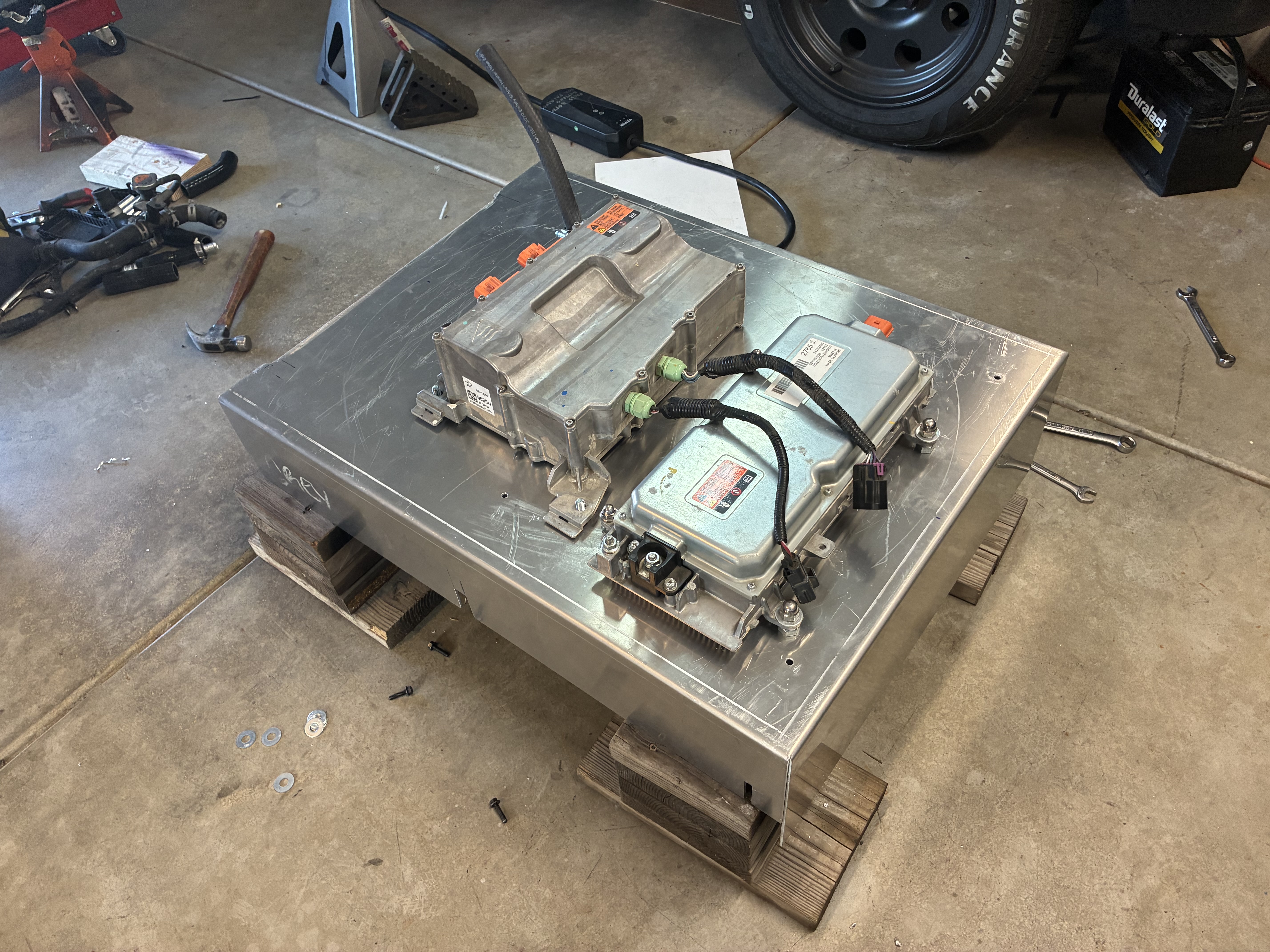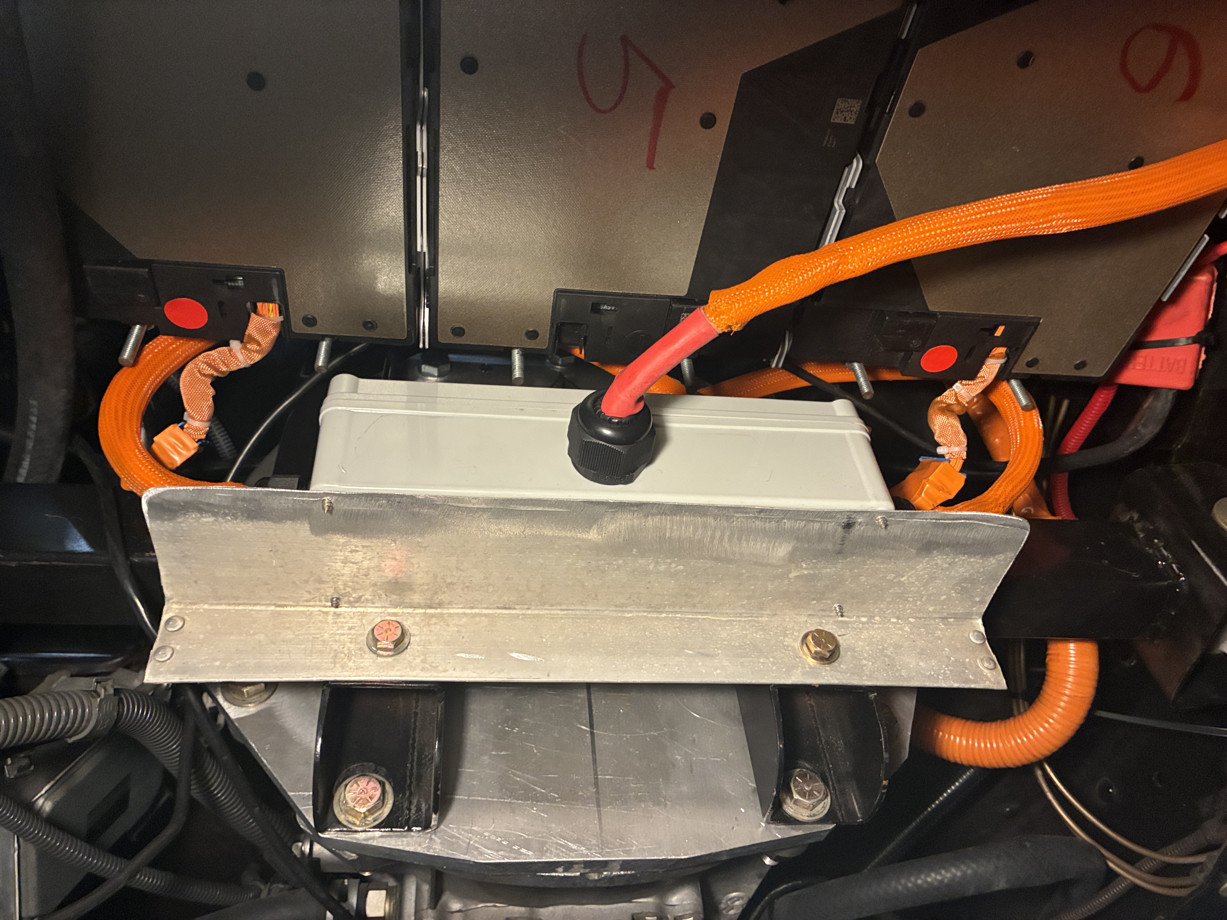 here I am remounting the 1st Gen Chevy Volt DC-DC converter (for now) with my beloved acorn nuts, which turned out to be way more P.I.A. than it's worth, I highly do NOT recommend using them as the bolts have to be perfect or a bit shorter length to allow full tightfullness or they will bottom or should I say top out !