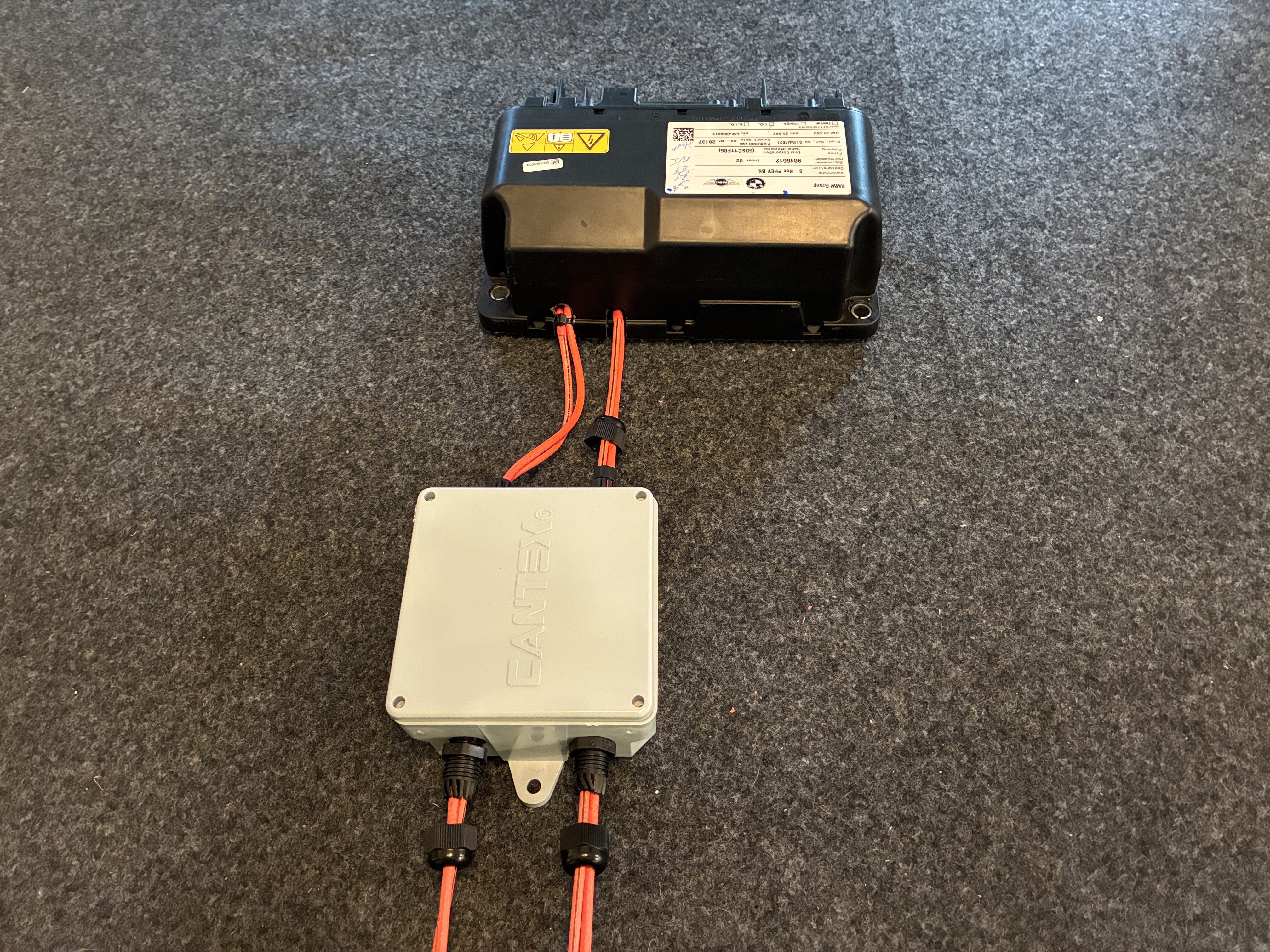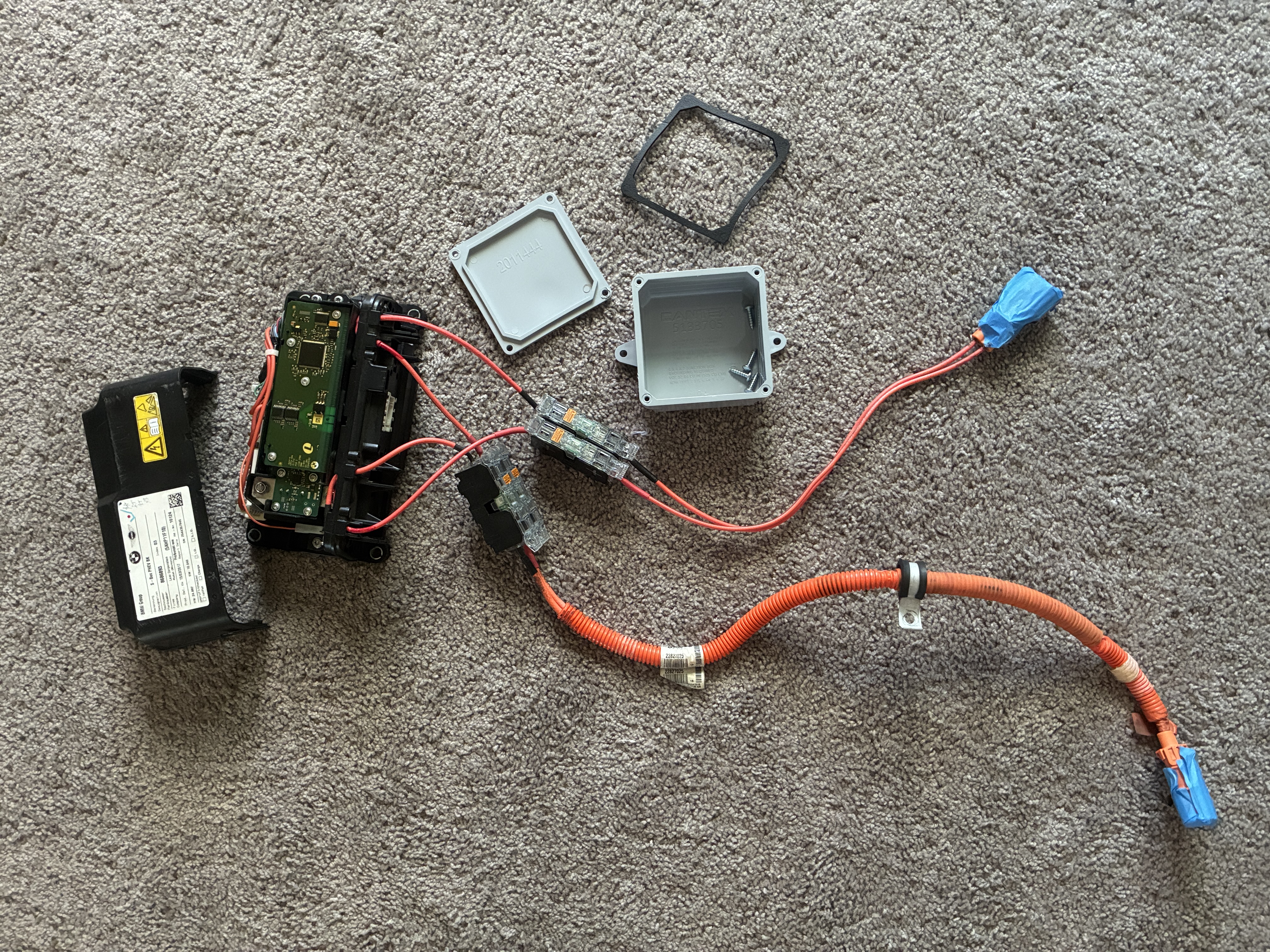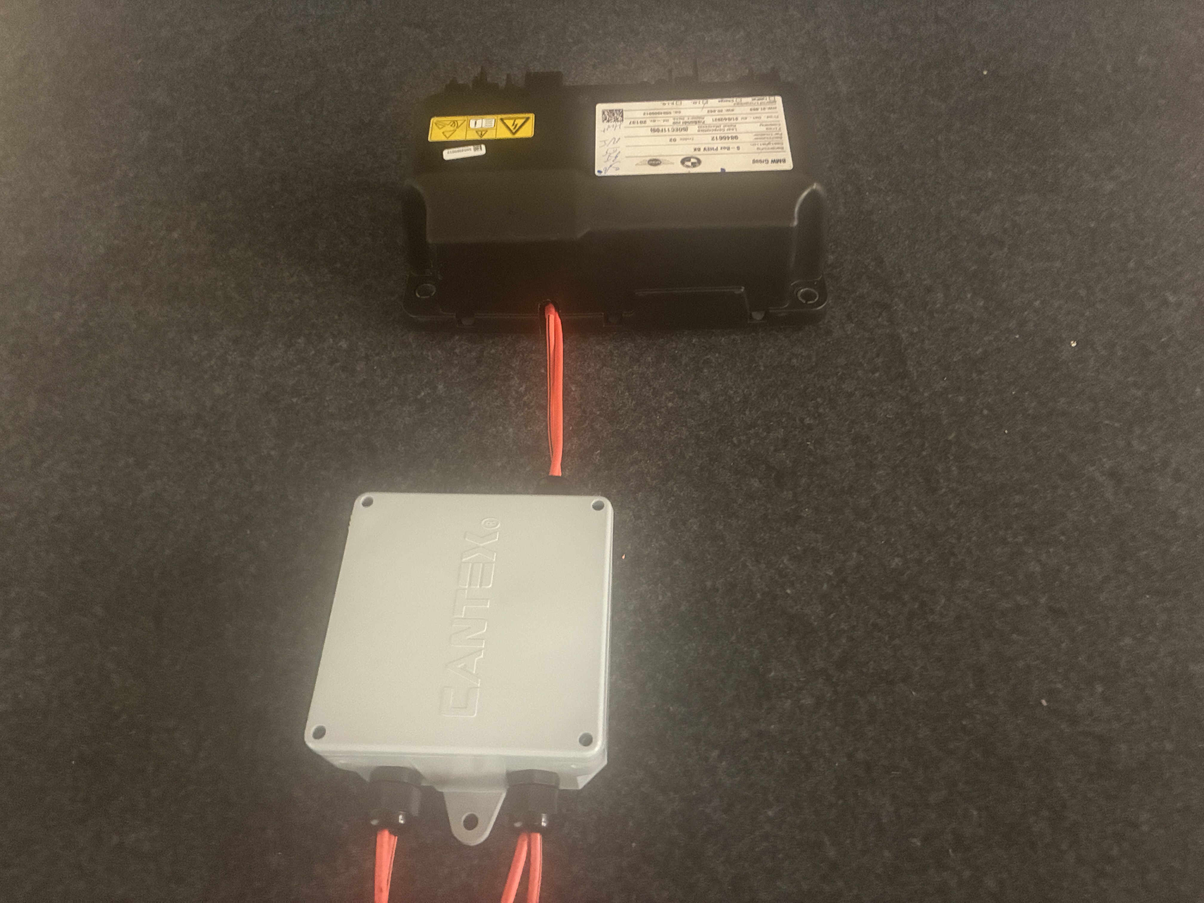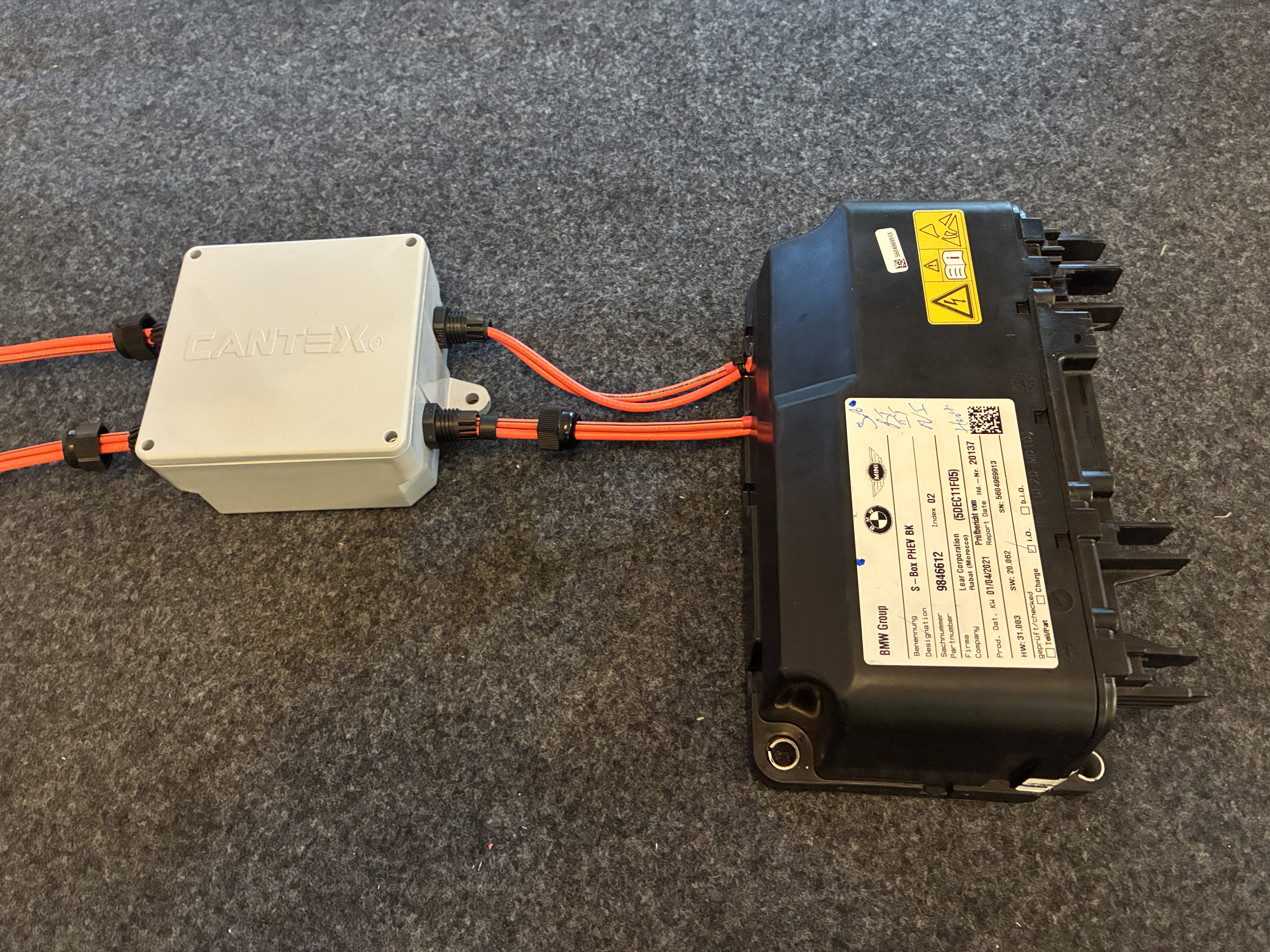 anywho, I managed to chimichanga the high voltage connection via a Cantex junction box to the BMW sBox, this box joins the two negative leads from the two BMW 530e packs into one, simple is the name of the game