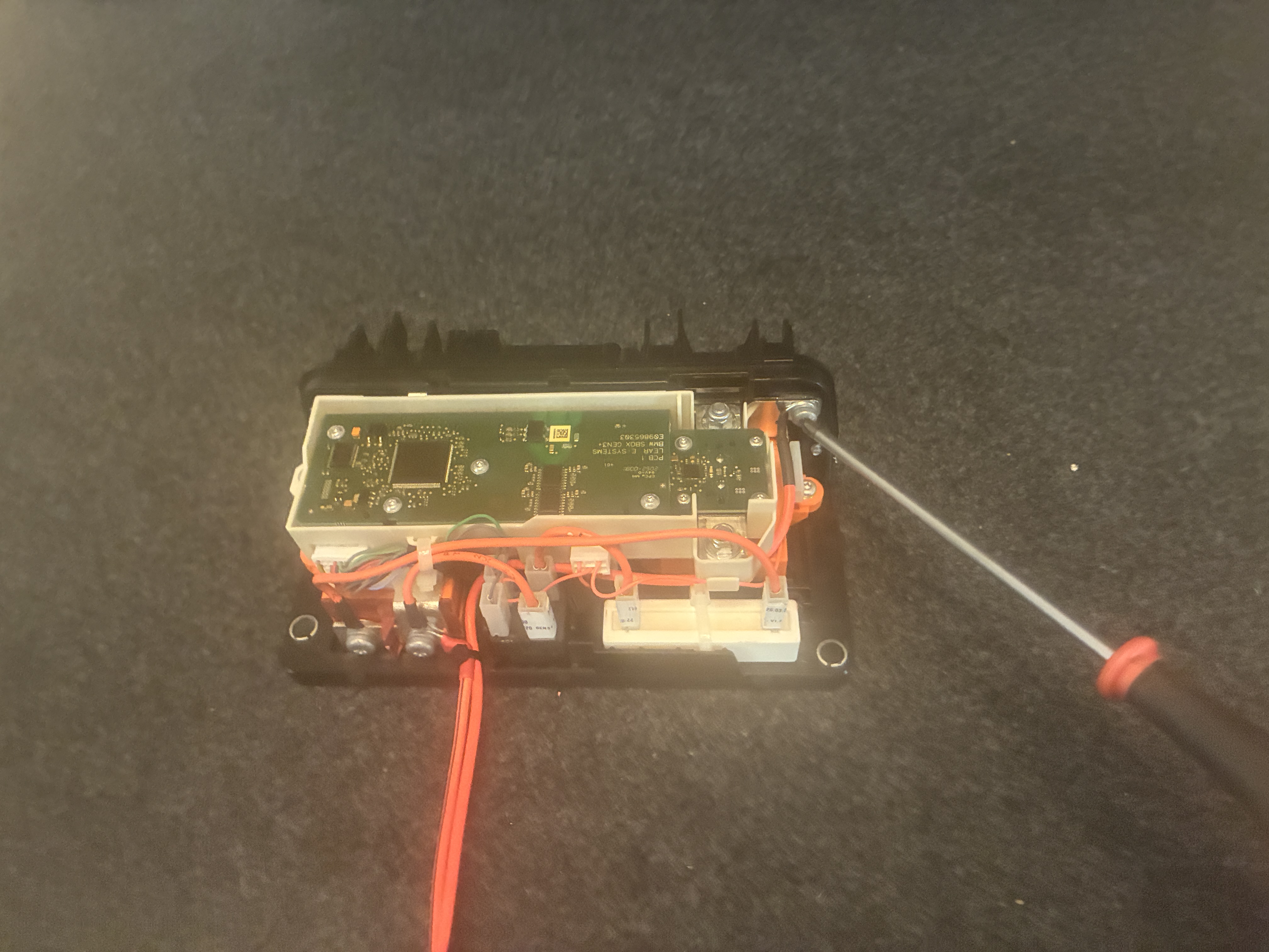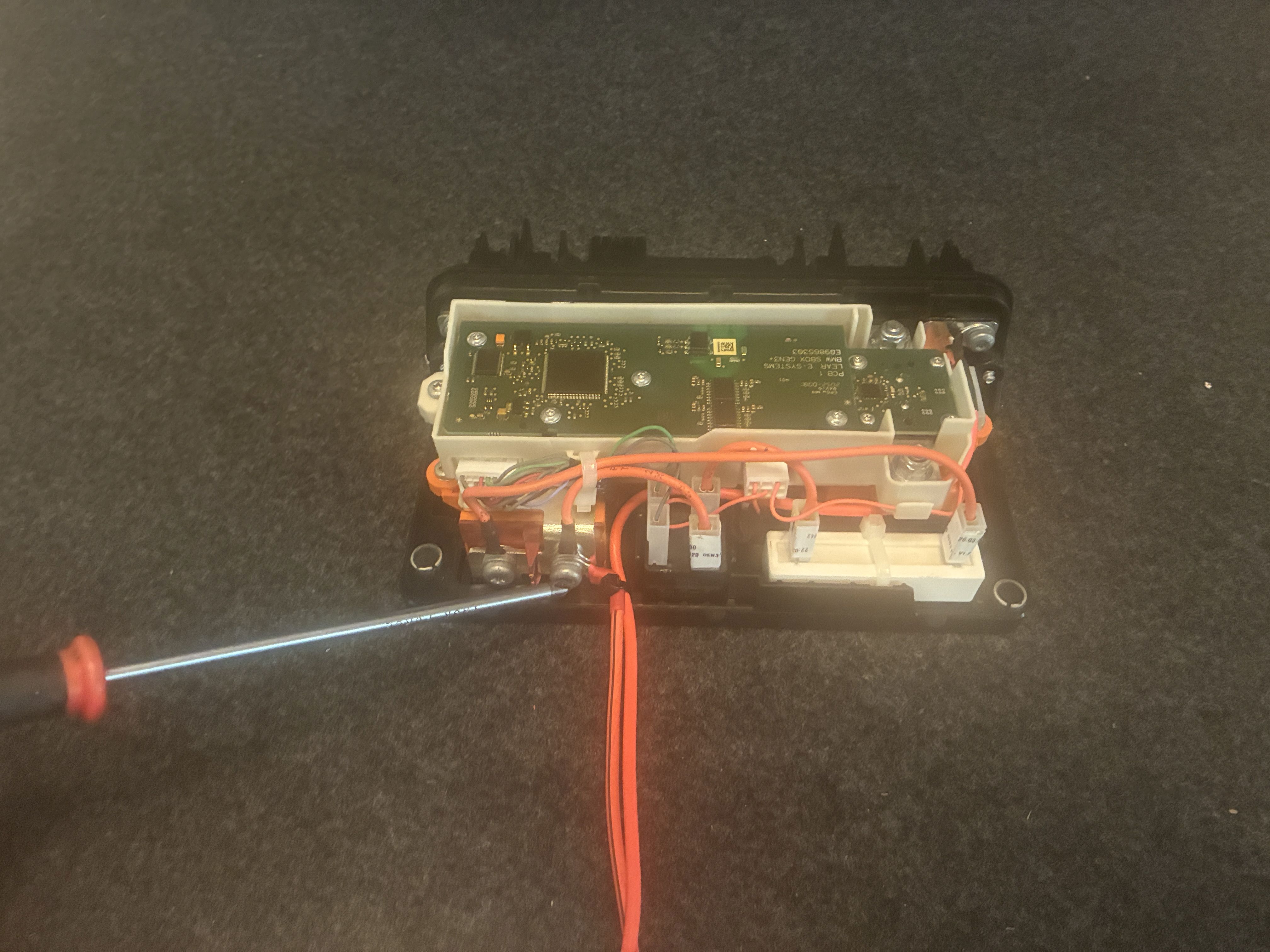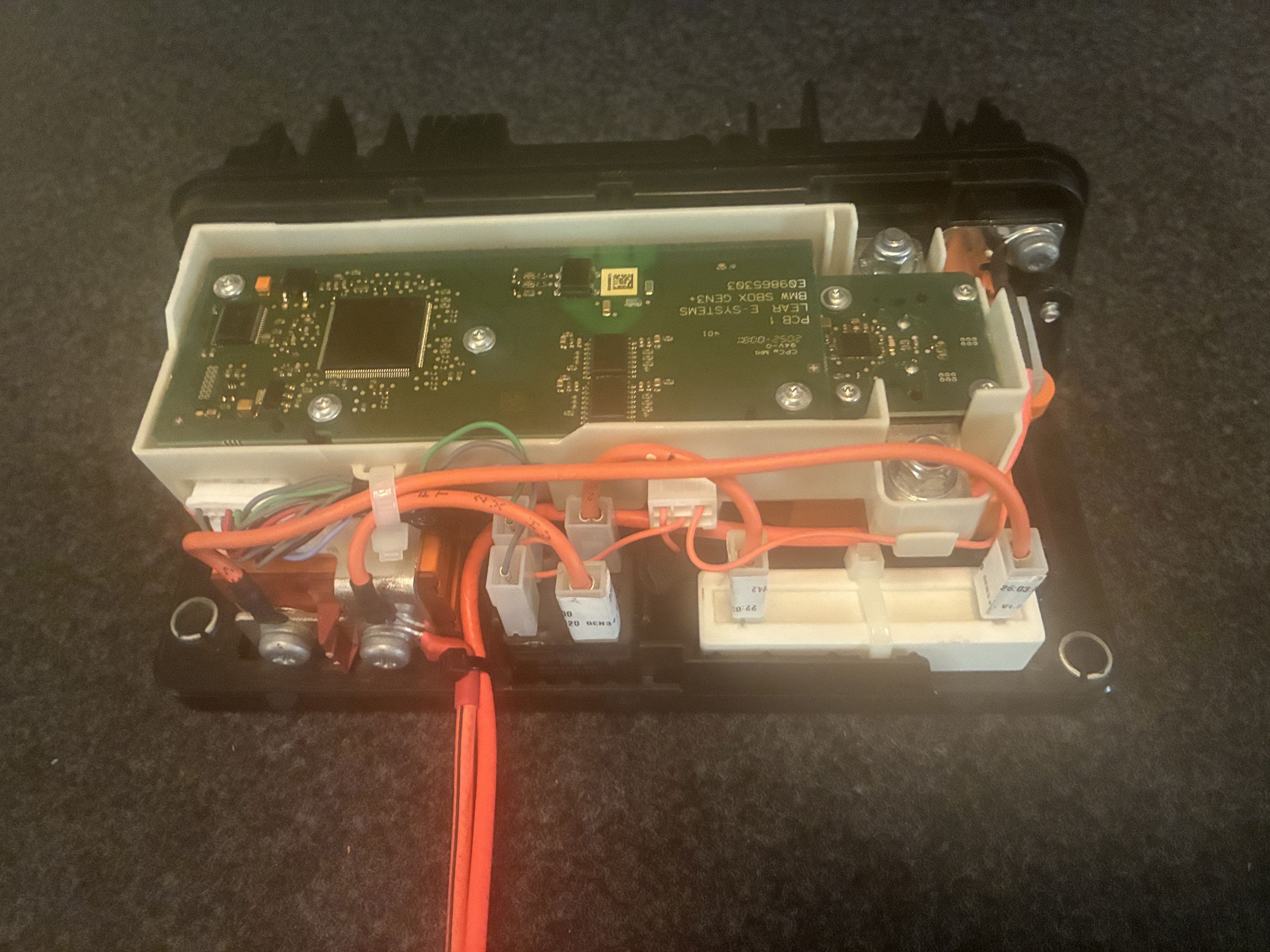 so then it was time to tether this sexy CANTEX junction box to the BMW sBox, so first we do the DC-DC converter leads, these are properly wired to the output of the box, meaning both contactors need to be closed for current to make it's way to the junction box