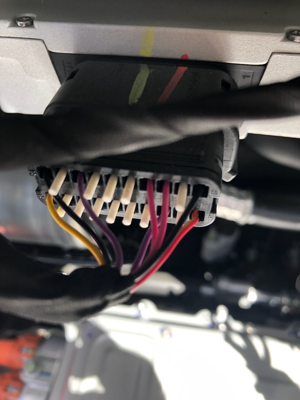 FYI, the MY24 converter has a slightly different part number: EKEA-2126080A. It also has two more pins connected -- pins 14 and 18. They match the CAN colouring convention of pink and violet, but that doesn't jive with the DB-EVCC-500 docs. See the (better) first pic below, compared with the second pic from a MY22 car.