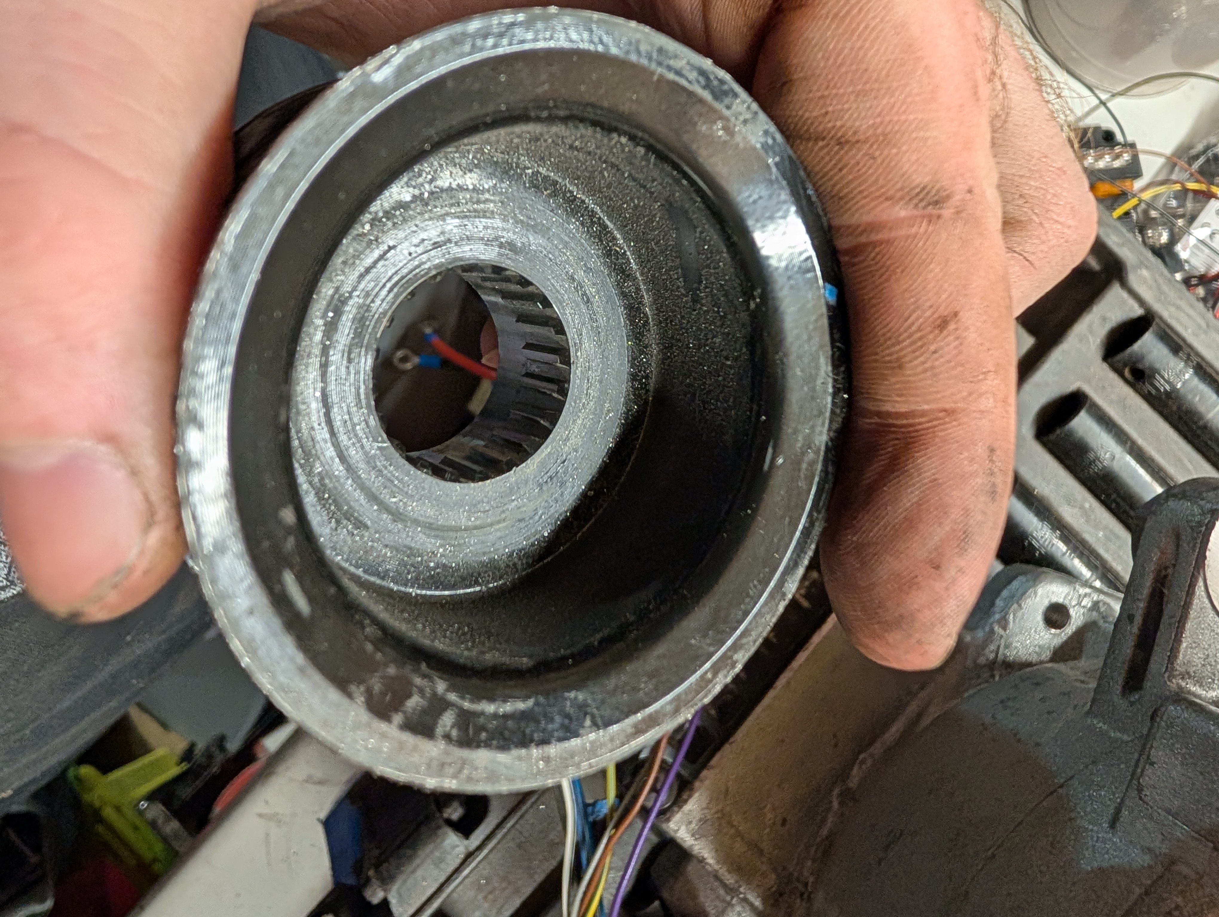 I machined down the standard pulley. Sprocket fits perfect on the shaft. Will weld sprocket to standard pulley core. Rough machining was done by spinning motor without field weakening, and using an angle grinder.
