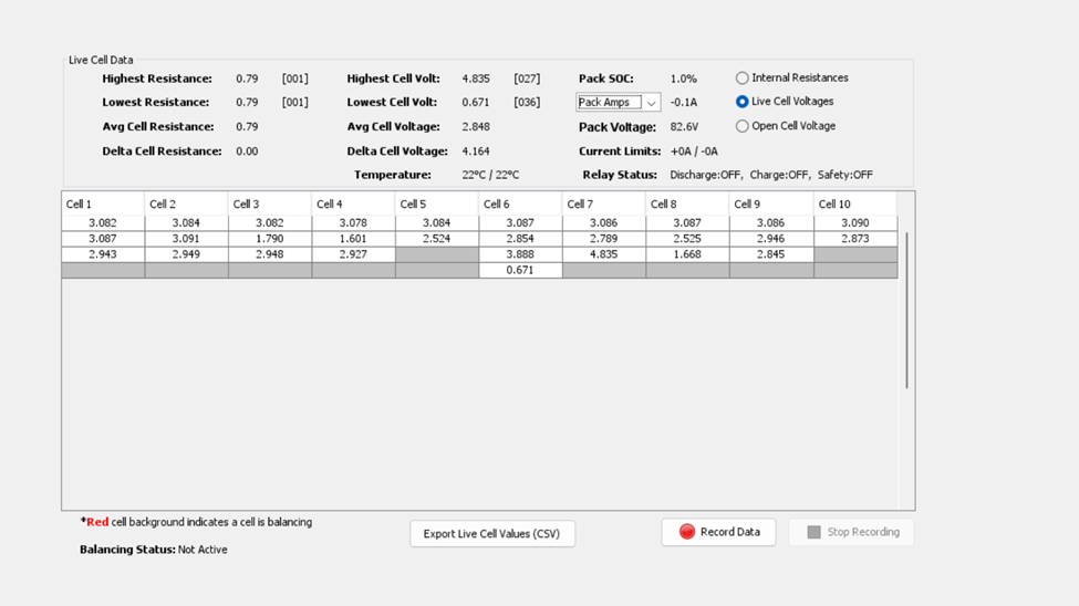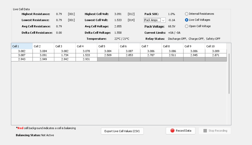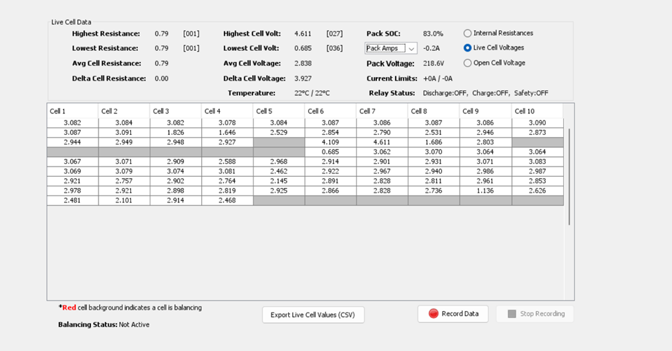 I pulled out the cell taps from the ORION 2 and inserted them one at a time to take readings. Here is what I got. Unfortunately, I started popping fuses like popcorn when I got to the last one so I shut it all down and emailed Andrew Ewert again. Oh well . . .