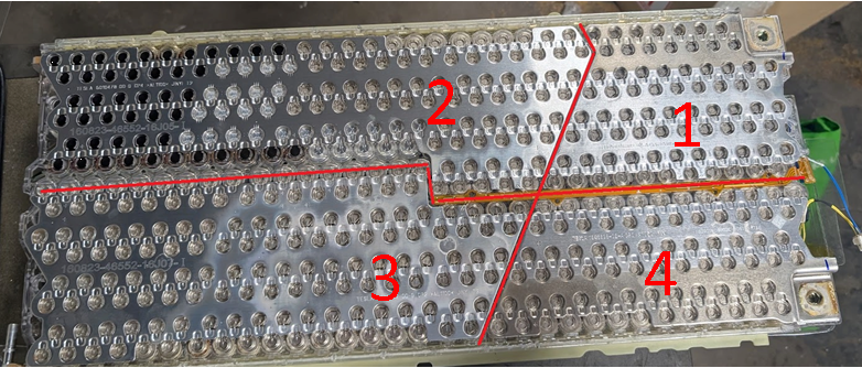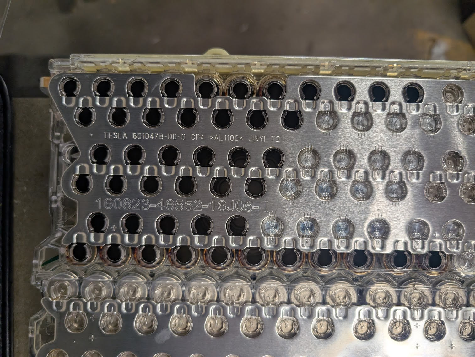 When I was doing this, 13 of the modules gave out readings between the 3.1 -3.2 range, but one of the modules gave off strange readings (only 5 cells showed up) and on closer inspection, 46 individual batteries were missing from the module.
