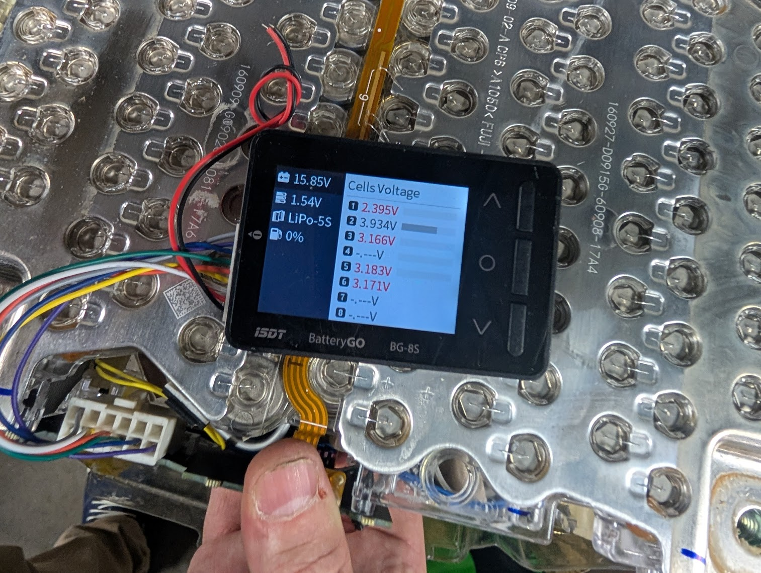 Obviously, the low reading of 2.395 concerns me, but with the higher reading next to it of 3.934 makes me wonder if because this battery is wired differently than the other ones, my BatteryGO is reading those incorrectly and I don't have a dangerous condition on cell 1. Together, the two of them average out to 3.1645, which would be consistent with the other batteries I tested. Since these all came out of the same pack monitored by Tesla's BMS up until going out of service for an accident, I feel like the Tesla would have prevented a cell from dropping this low. Thoughts on how to prove my thereom?