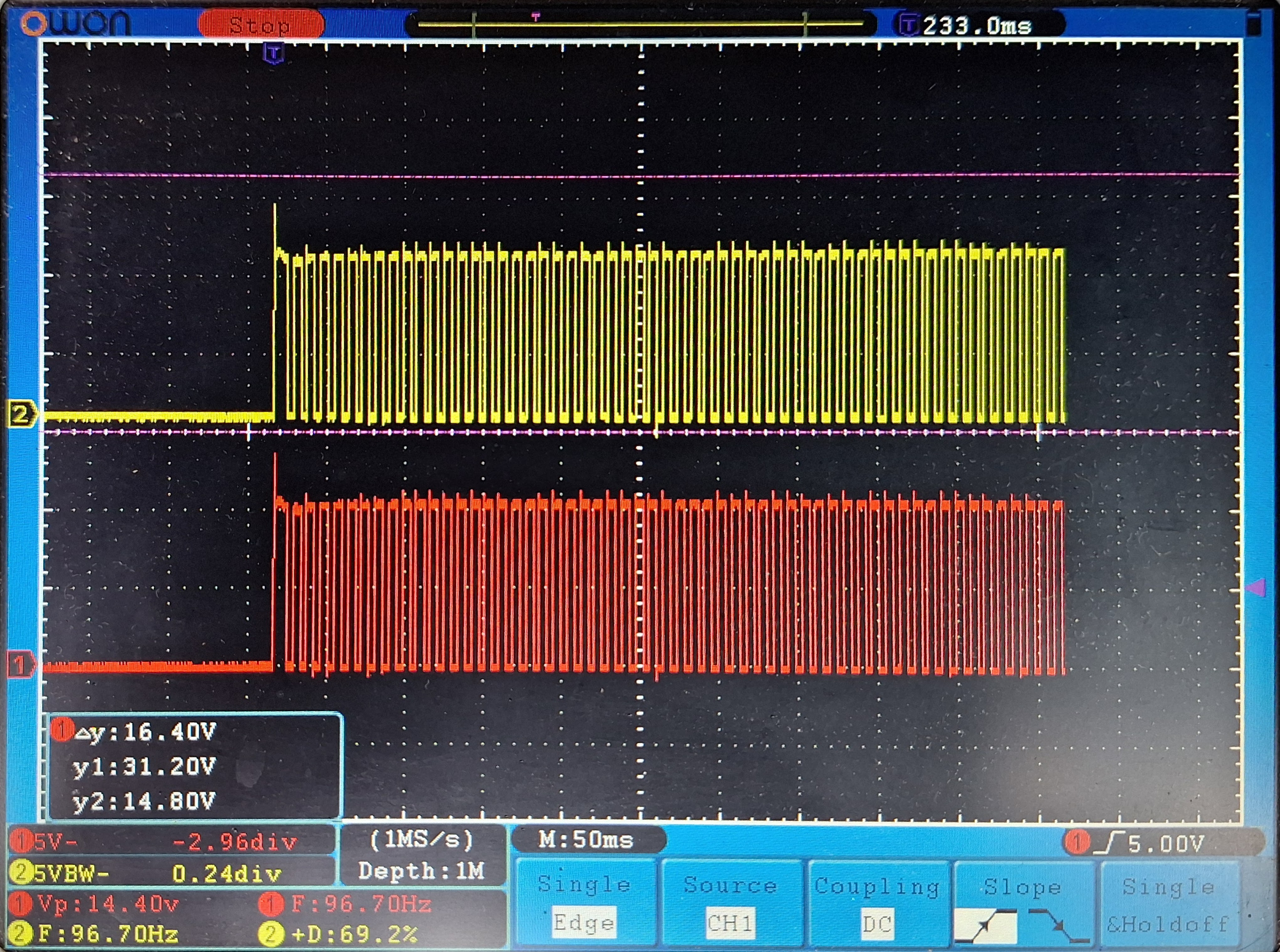The energiemeter is controlled with a 50% duty cycle variable frequency square wave. With the frequency varying between 5 and 270 Hz.