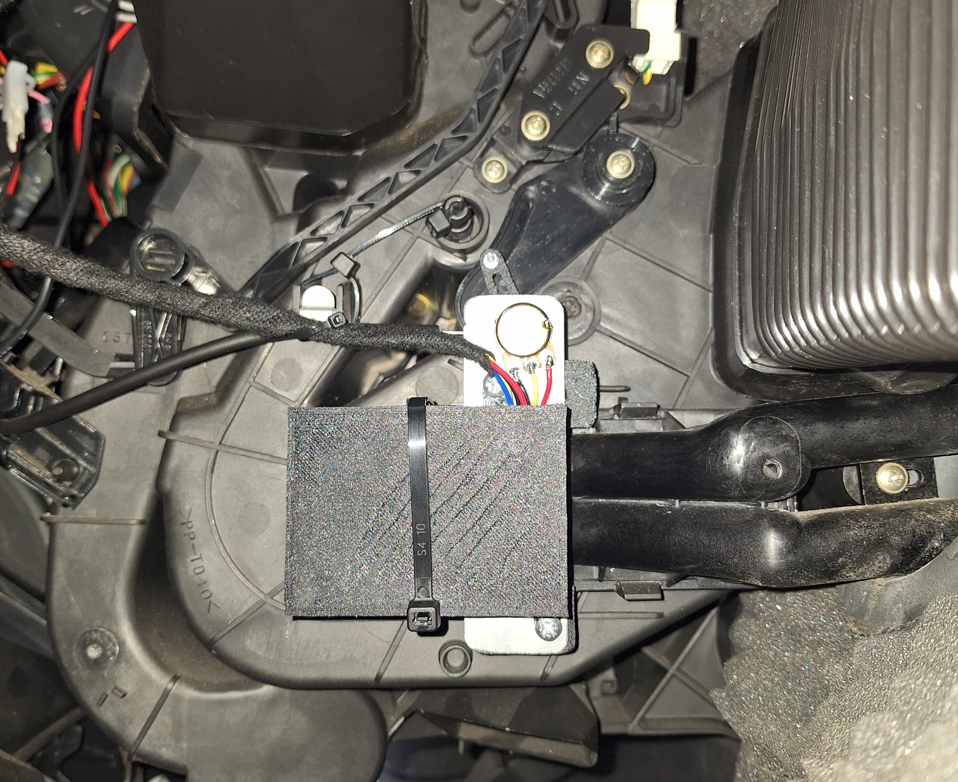 Added a potentiometer to sense the heater slider position. An arduino reads the value converts it to 0 to 100% and sends it via CAN to the Zombie. Luckily there are some mounting screws for the heater matrix. With a couple of 3D printed parts it was easy to mount the electronics.