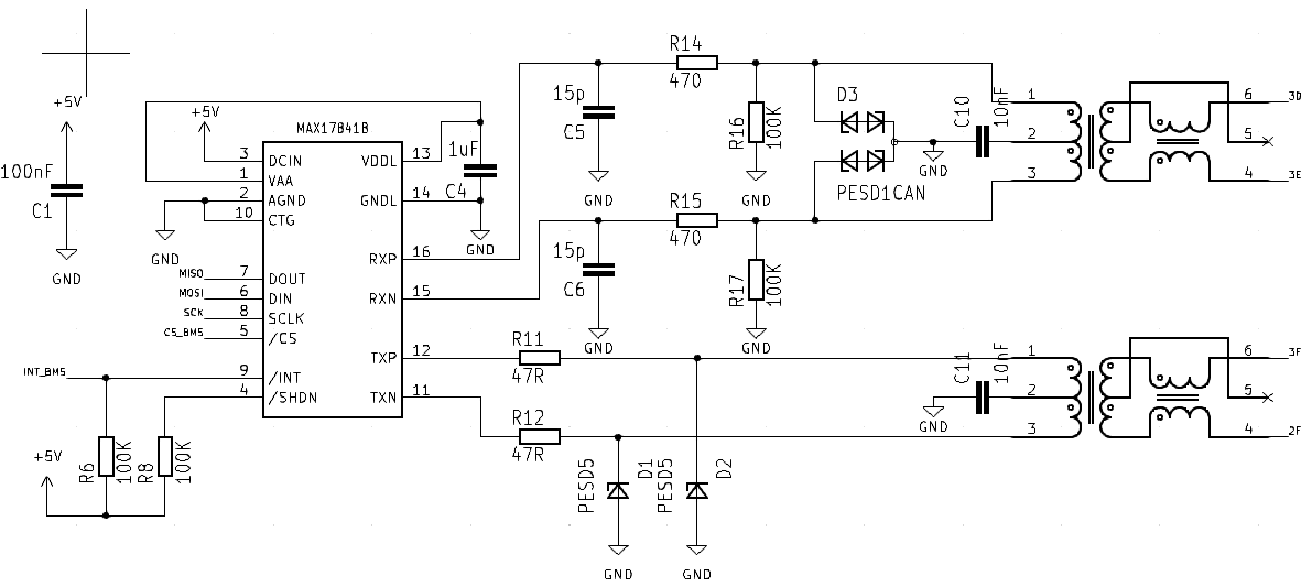 The BMS.pdf was my first attempt and is incorrect. A bit further down in the thread you will find BMS_5.pdf, that is what I use for all my bms:es. The difference is you use 10nF and I use 1nF to gnd on the center taps on the transformers. Also I use 1,5k where you use 470R on rx lines. Don't think this is the main concern right now.