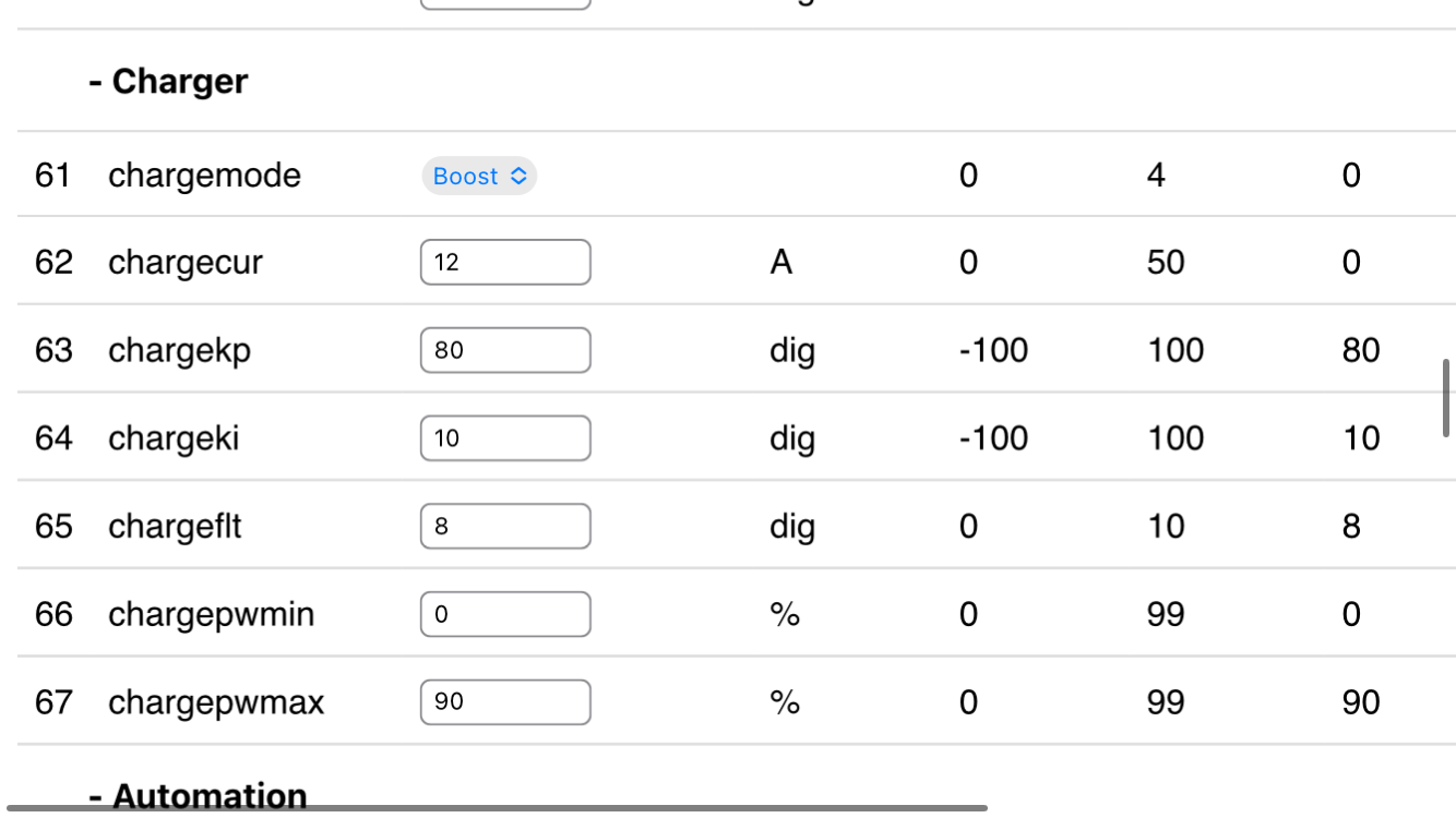 Can I get a brief explanation of tuning chargekp, chargeki, and chargeflt? It looks like my current sensor is really noisy, so I adjusted chargeflt until I got 12a on my clamp meter on my ac input. Not sure if there’s a good process for tuning chargekp or chargeki other than….FAFO?