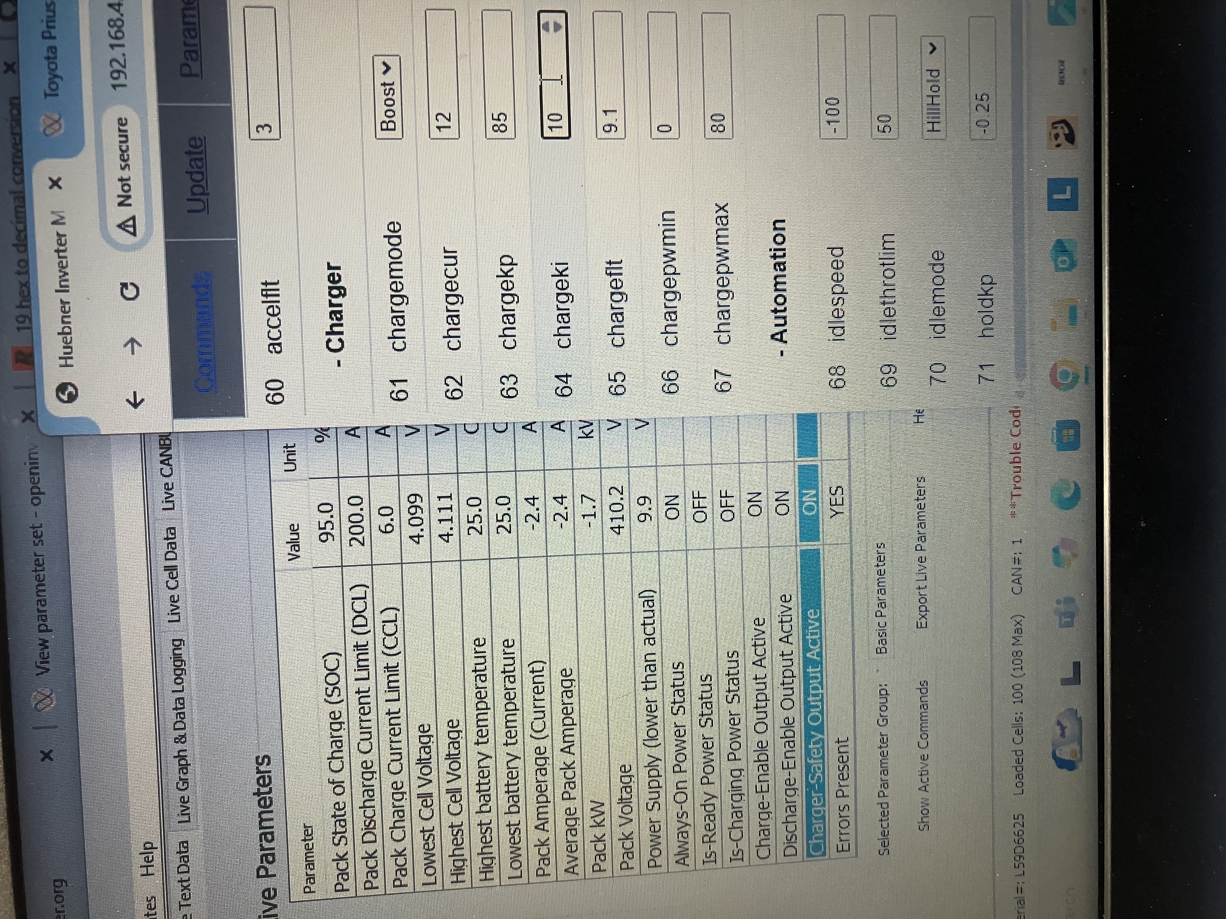 I checked to make sure I was getting power into the inverter- I have AC voltage going into the rectifier, and dc coming out (if it's disconnected from the inverter). With everything hooked up, I'm seeing the low side of the buck/boost cycling between ~350V and ~400V on the multimeter. I'm getting the same reading with the inverter in run mode. my battery voltage is sitting about 408V right now, so it seems like the booster isn't boosting. Attached are my charging parameters and spot values. Any direction would be greatly appreciated, I feel like I've hit a wall and don't know what to try next.