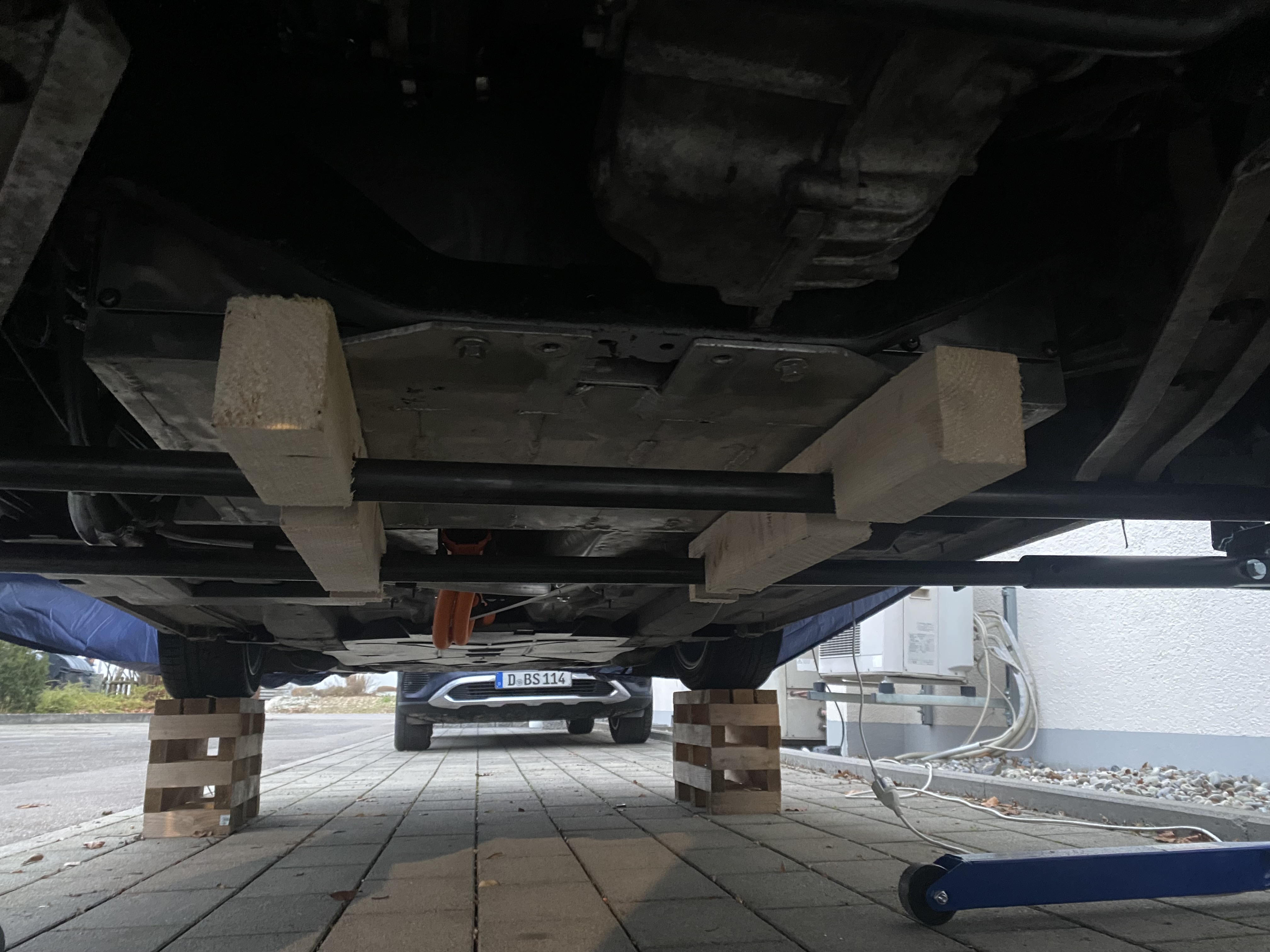 I want to reflect with you on options to lift my car to get my battery box in and out. I need to lift my car approximitly 70cm to get the battery out. My workflow to unmount the battery is to lift the car, remove the connections and remove except 4 bolts. Place the car with the battery on a roll cart. Loosen the remaining bolts and then lift the car. Currently I am working outside and I can't place anything permanent there, because it is rented. What do you do? What are your ideas?