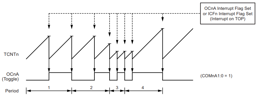 value written to OCR1A or ICR1 is lower than the current value of TCNT1, the counter will miss the compare match. The