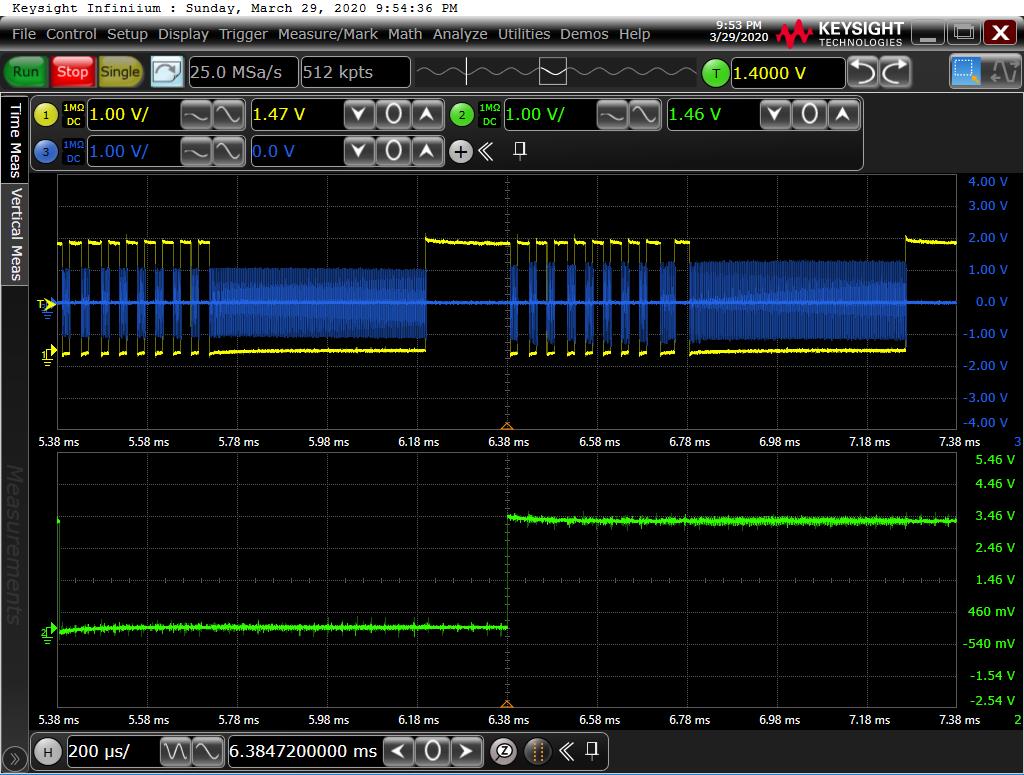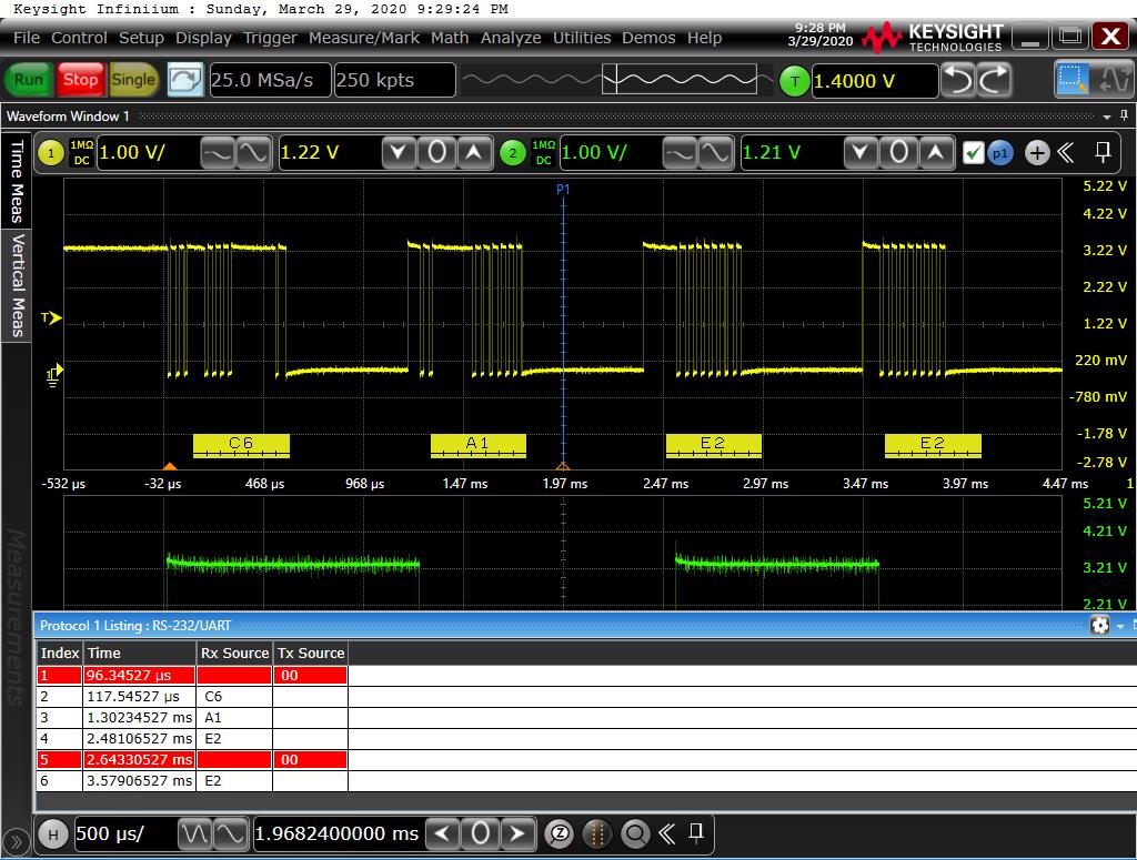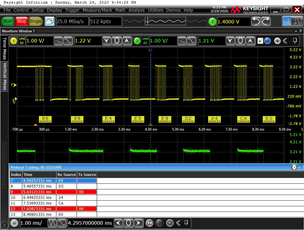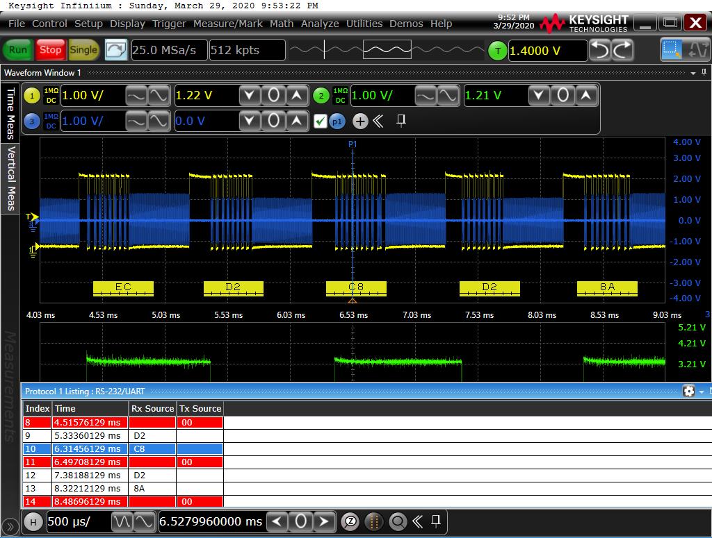 Soooo... in the attached chan3 (blue) is on the outputs of the iso transformers, chan1 (yellow) is on pin 3 of the batman header and chan2 (green) is on pin2 of batman header. Protocol decoder set to serial at 14.4k on chan1 just for kicks....