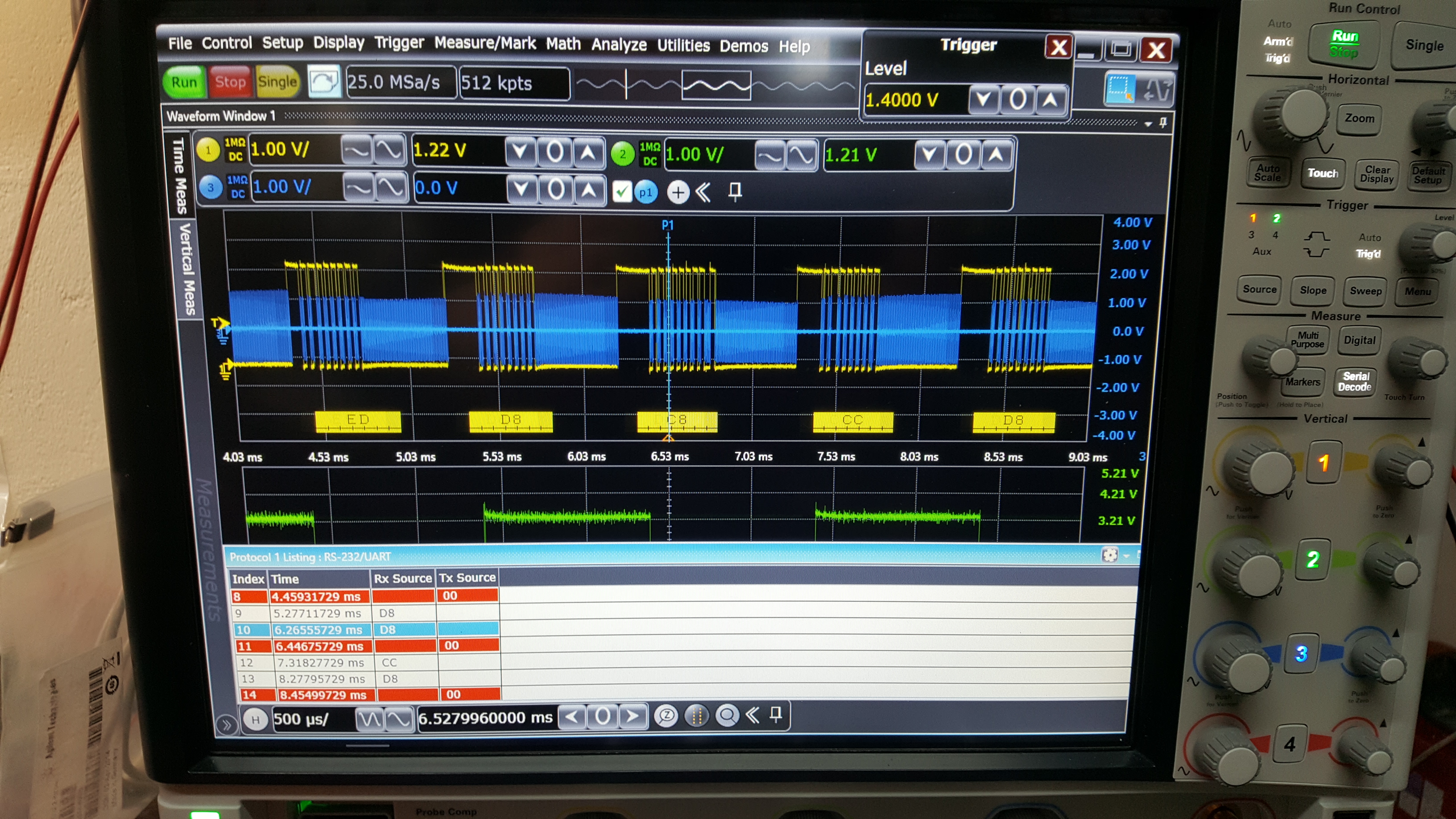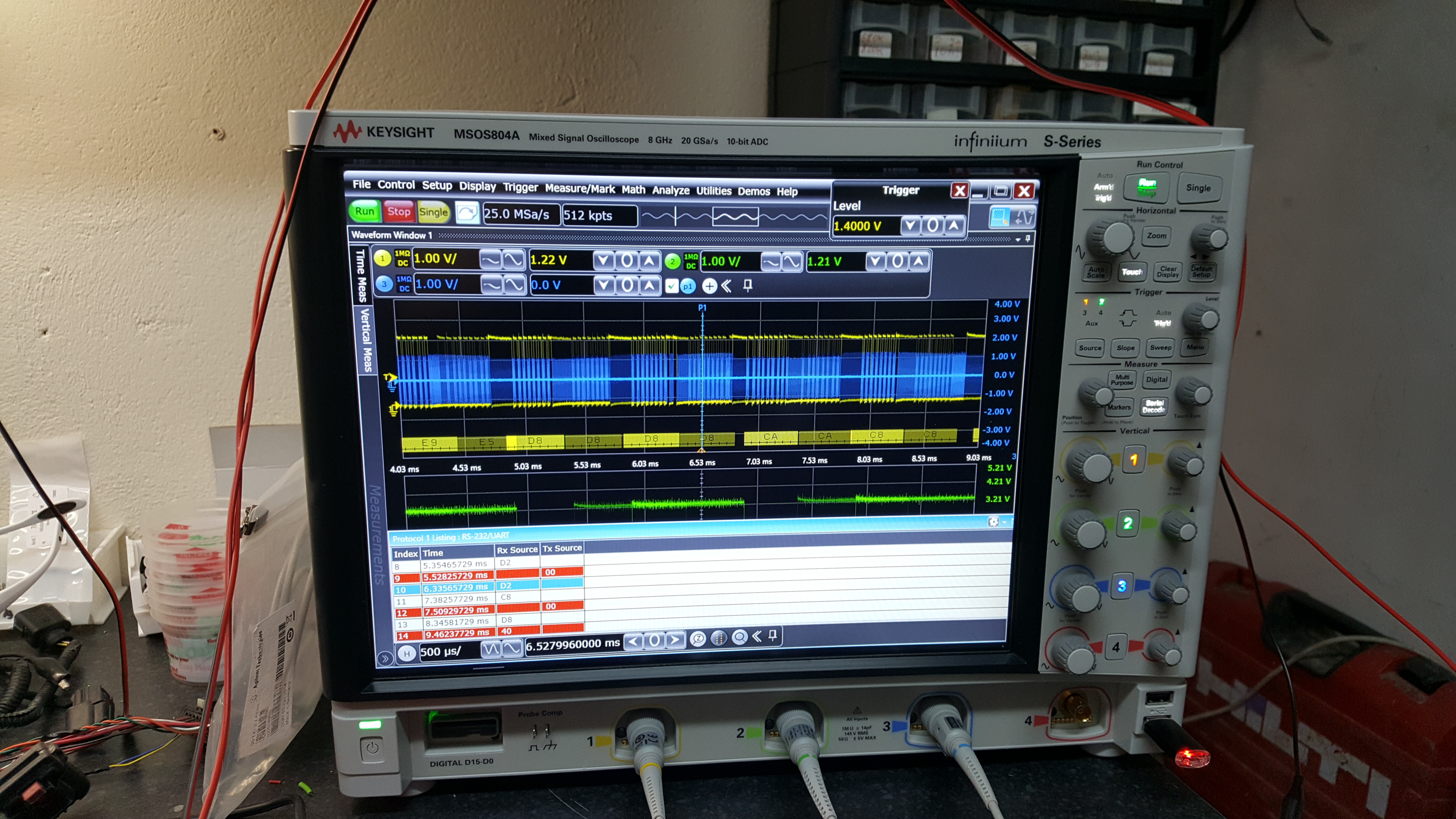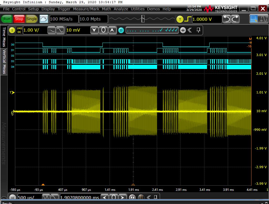 Soooo... in the attached chan3 (blue) is on the outputs of the iso transformers, chan1 (yellow) is on pin 3 of the batman header and chan2 (green) is on pin2 of batman header. Protocol decoder set to serial at 14.4k on chan1 just for kicks....