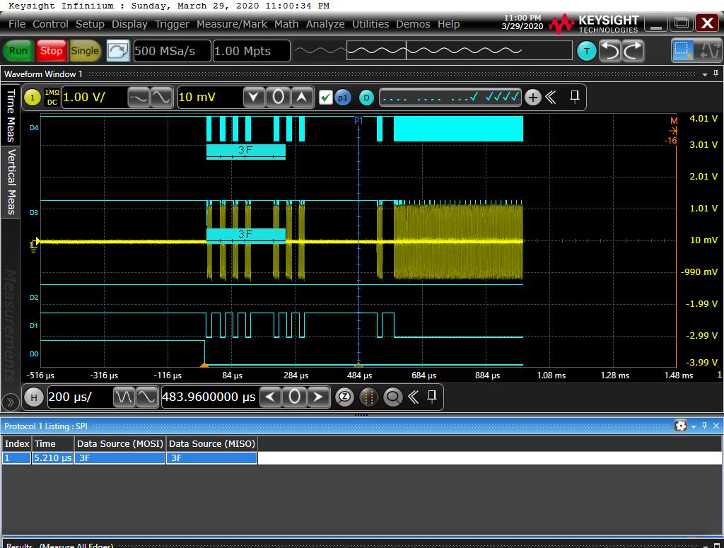 Forgot this is an MSO scope. Broke out the digital pod and probed all 5 pins on the batman header. Kicked on spi protocol decoder and bingo. Now we're cooking:)