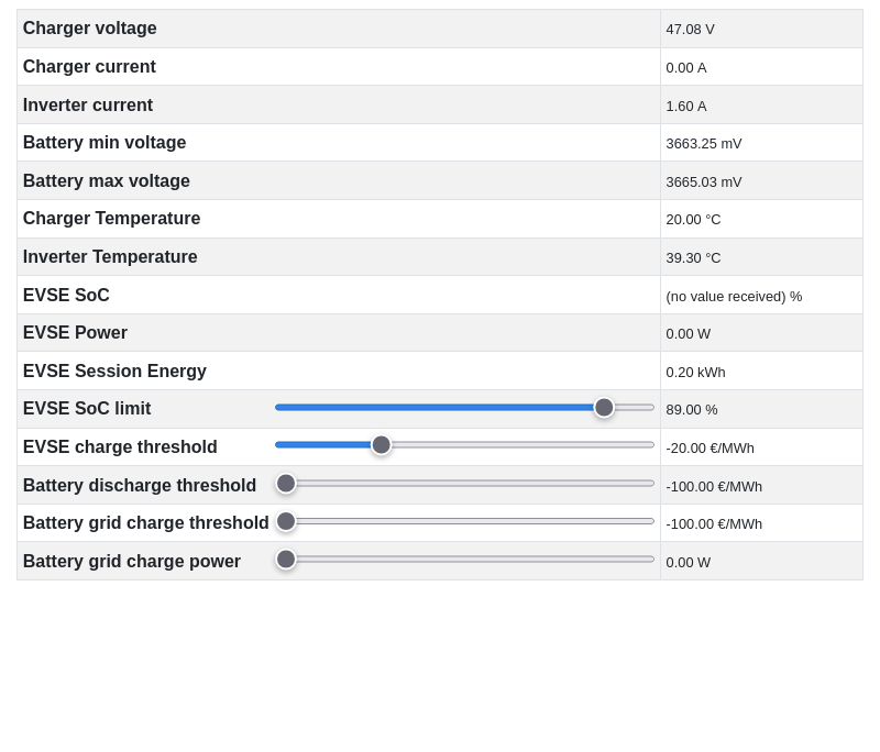 I've also added more controls to the web page: So now I can program max SoC, maximum price for EV/stationary charging from grid and minimum price for discharging either of the batteries (I'm on a dynamic spot market plan). So already some degree of automation.