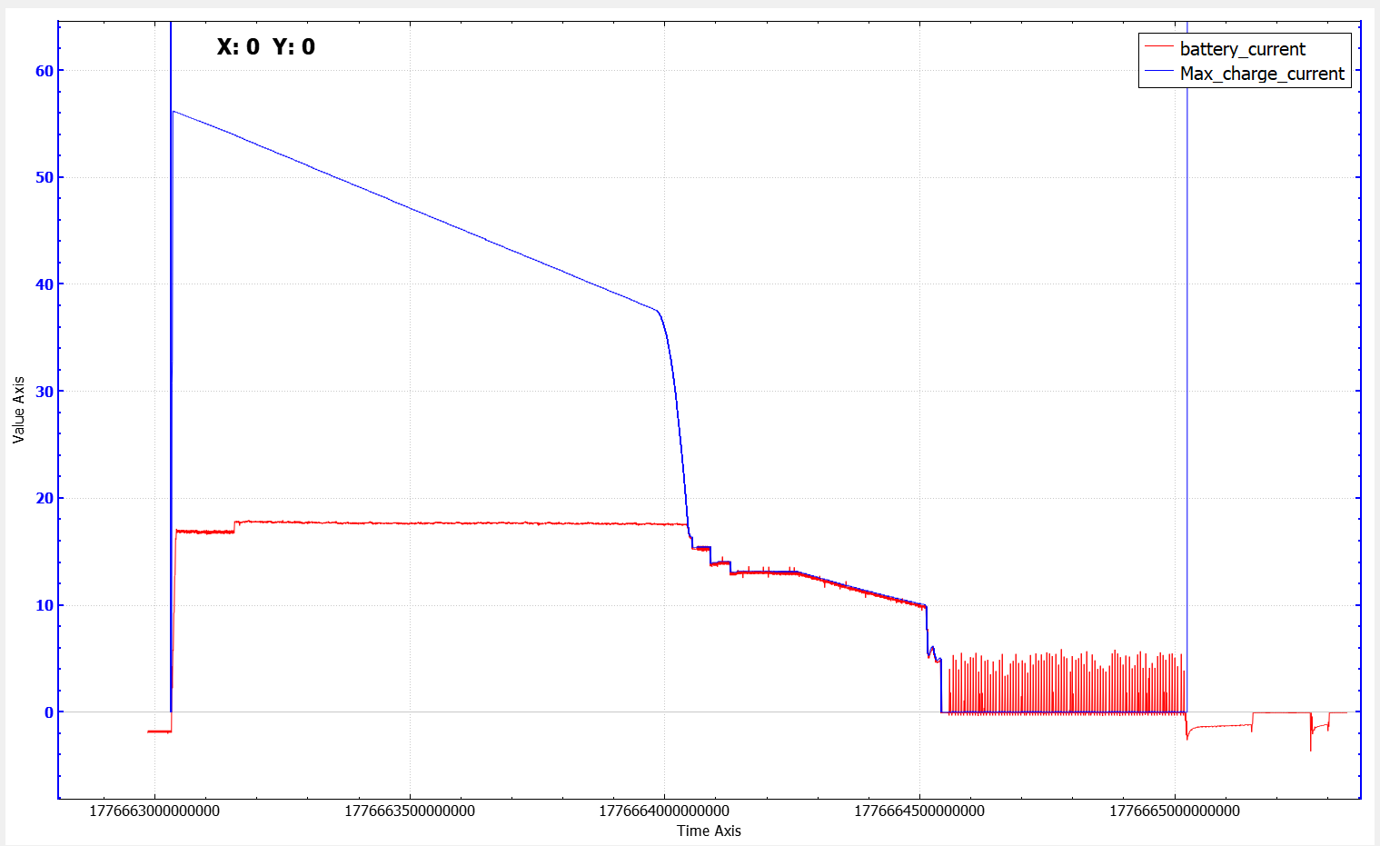 With a lot of trial and error I found the max charge voltage. In the logs I got from a MG4 with a 64kwh battery the max voltage is set to 4.3V per cell. After talking to the guy that made the logs. He send me a new log form a MG4 with a 51Kwh LFP battery charged from 95% to 100%. To check if the max voltage gets changed at the end of the charge. Short answer NO and the max is set to 3.72V per cell. But my eye fell on the bytes next to the voltage. There was a value counting down. Red is battery current Blue is max charge current.
