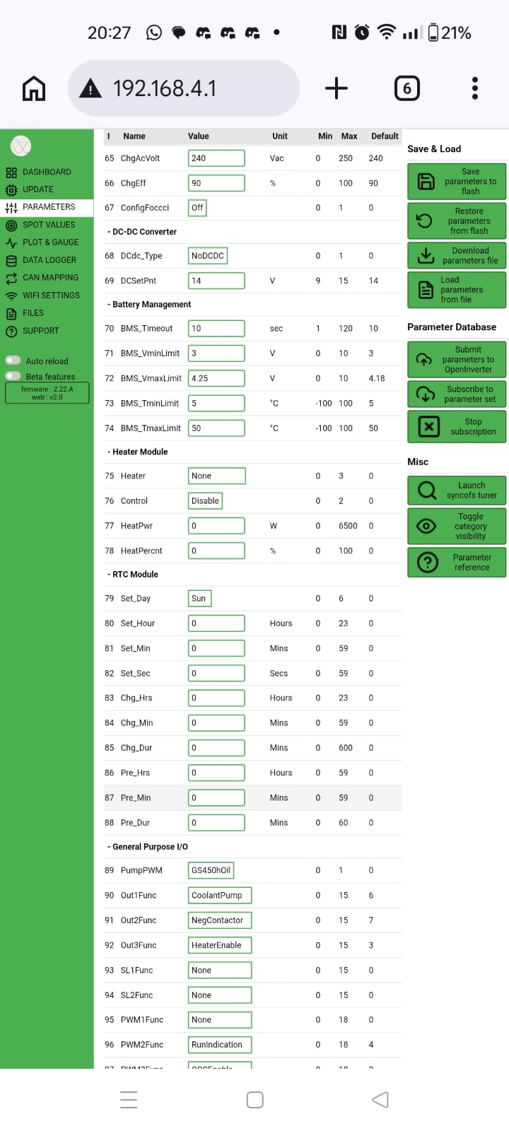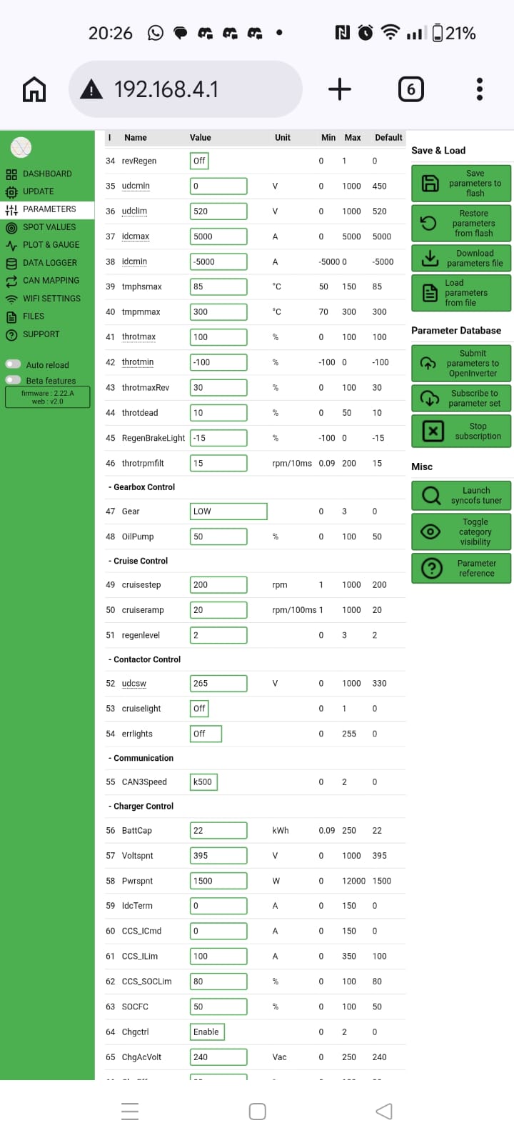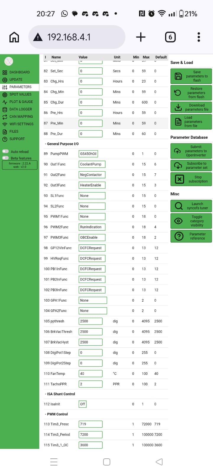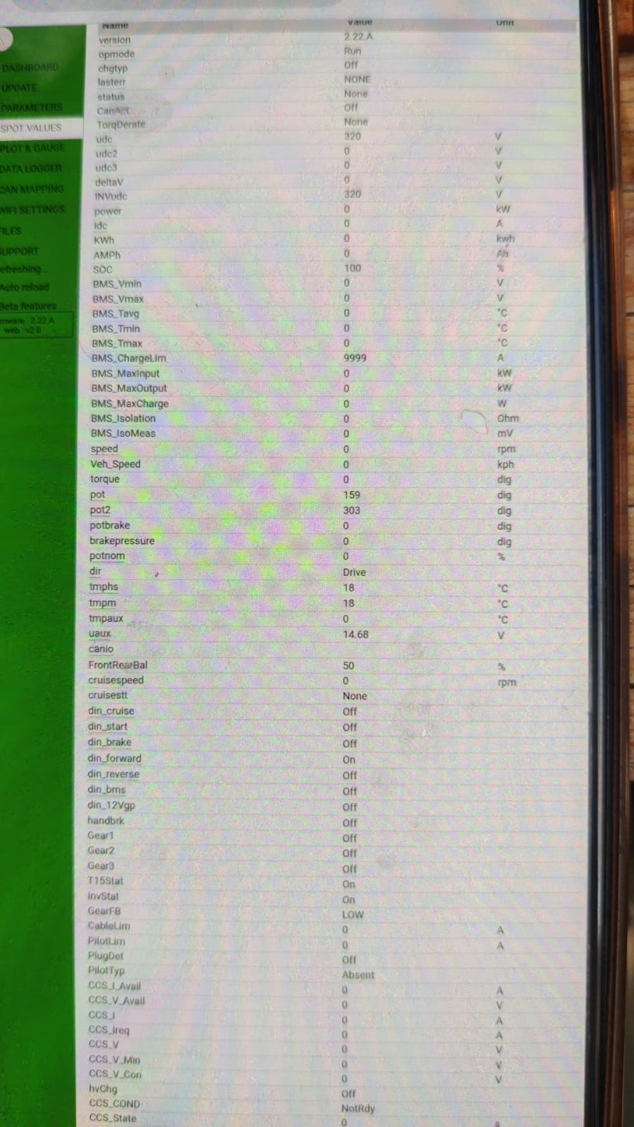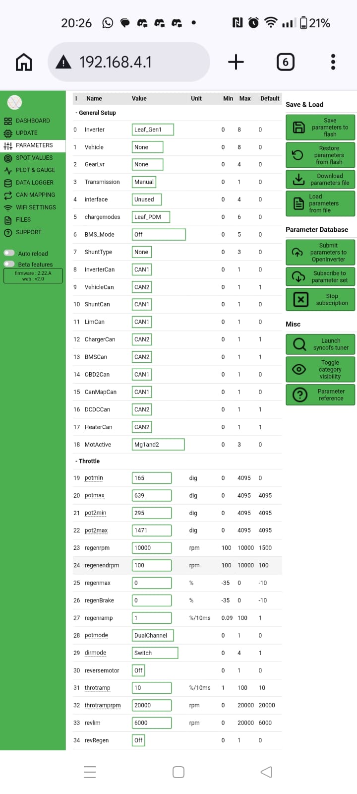 Ive got the openinverter board wired up to my gen 1 leaf stack. Throttle calibrated correctly, able to get it into RUN and DRIVE states easily. No matter what I do I cannot seem to get the motor to spin, no noise from motor or inverter. Torque value goes up but current draw stays 0. Ive got 320vdc on the HV side, doing precharge and contactors manually. Ive set the udcsw voltages etc so that it will accept the 320vdc but no luck and no errors.