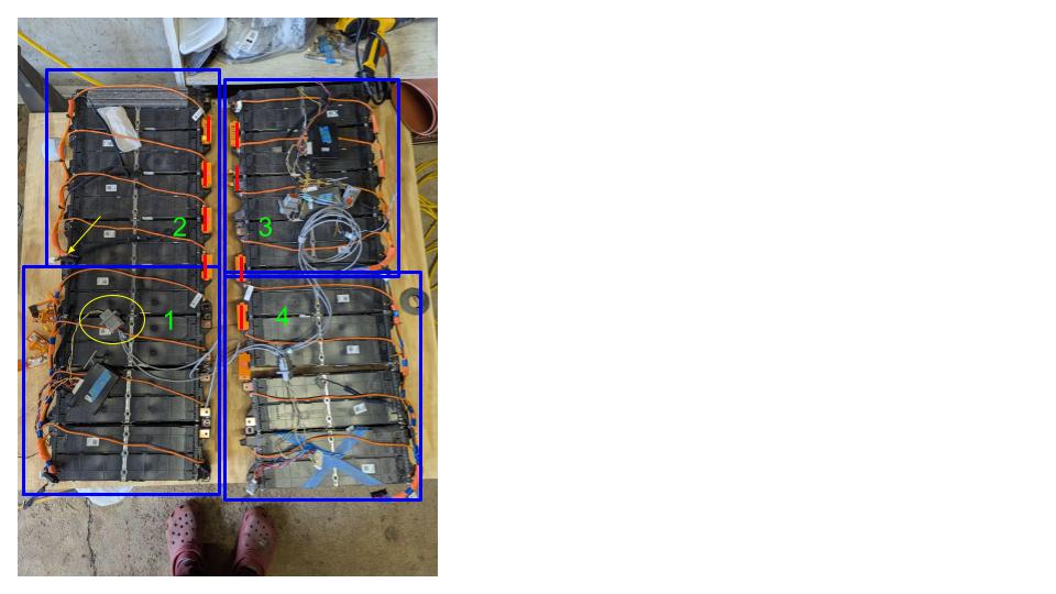 2. I assumed that the CMUs and BMS are inactive until powered on and i press go. After connecting everything up i was going to connect 12V and open up the GUI to read cell voltages and thought there would be a command to balance the cells if i wanted to. Now I'm wondering if the balancing is passive and when i connected the CMUs the balancing process began. I wasn't planning to balance the cells so i didn't reconnect all the modules. I highlighted with red lines which modules are connected and as you can see all 4 modules in the second set are connected AND the bottom module is also connected to the top module of the 1st set. I think the CMU began balancing 3 modules at 24V with one module at 48V.