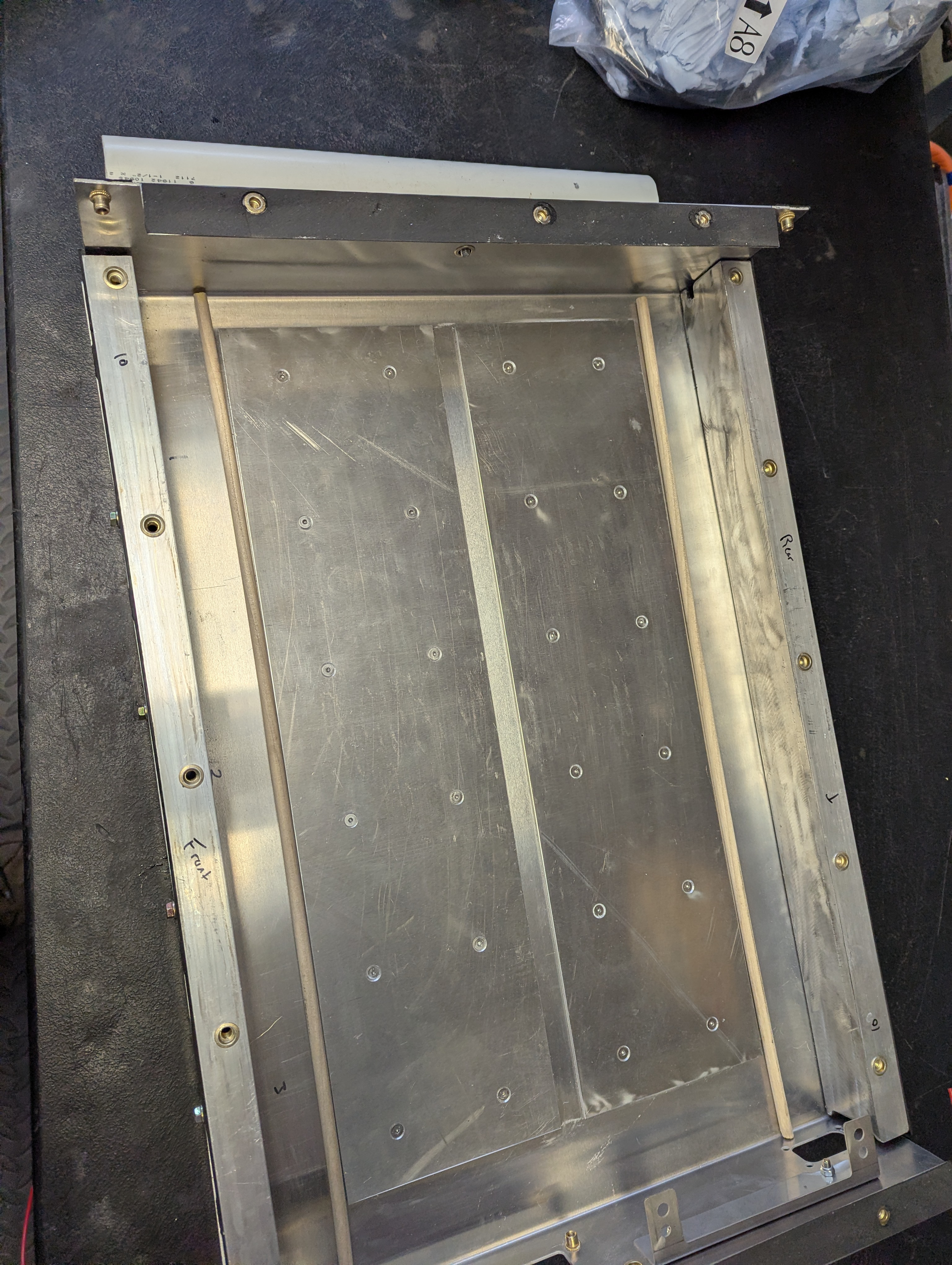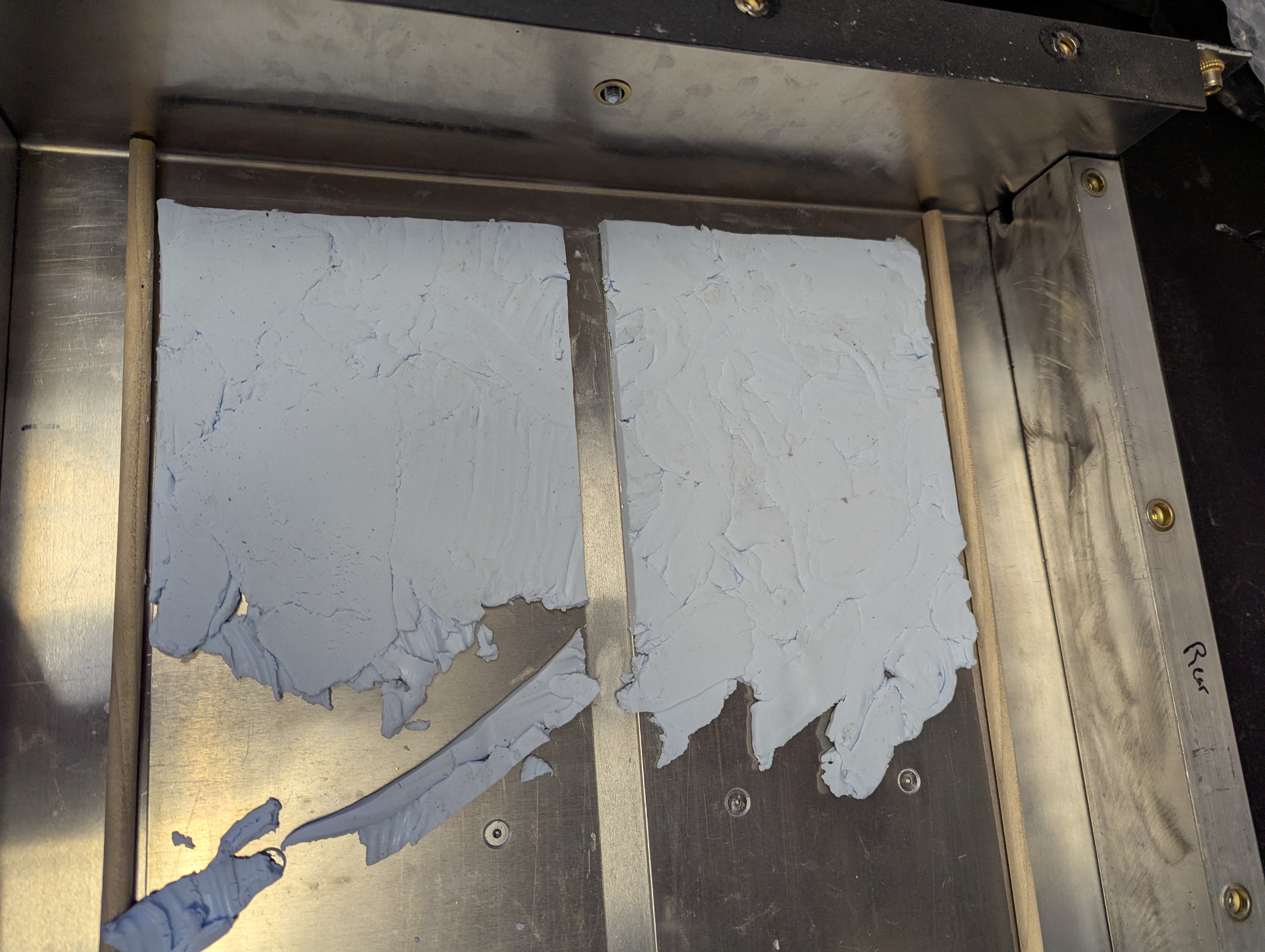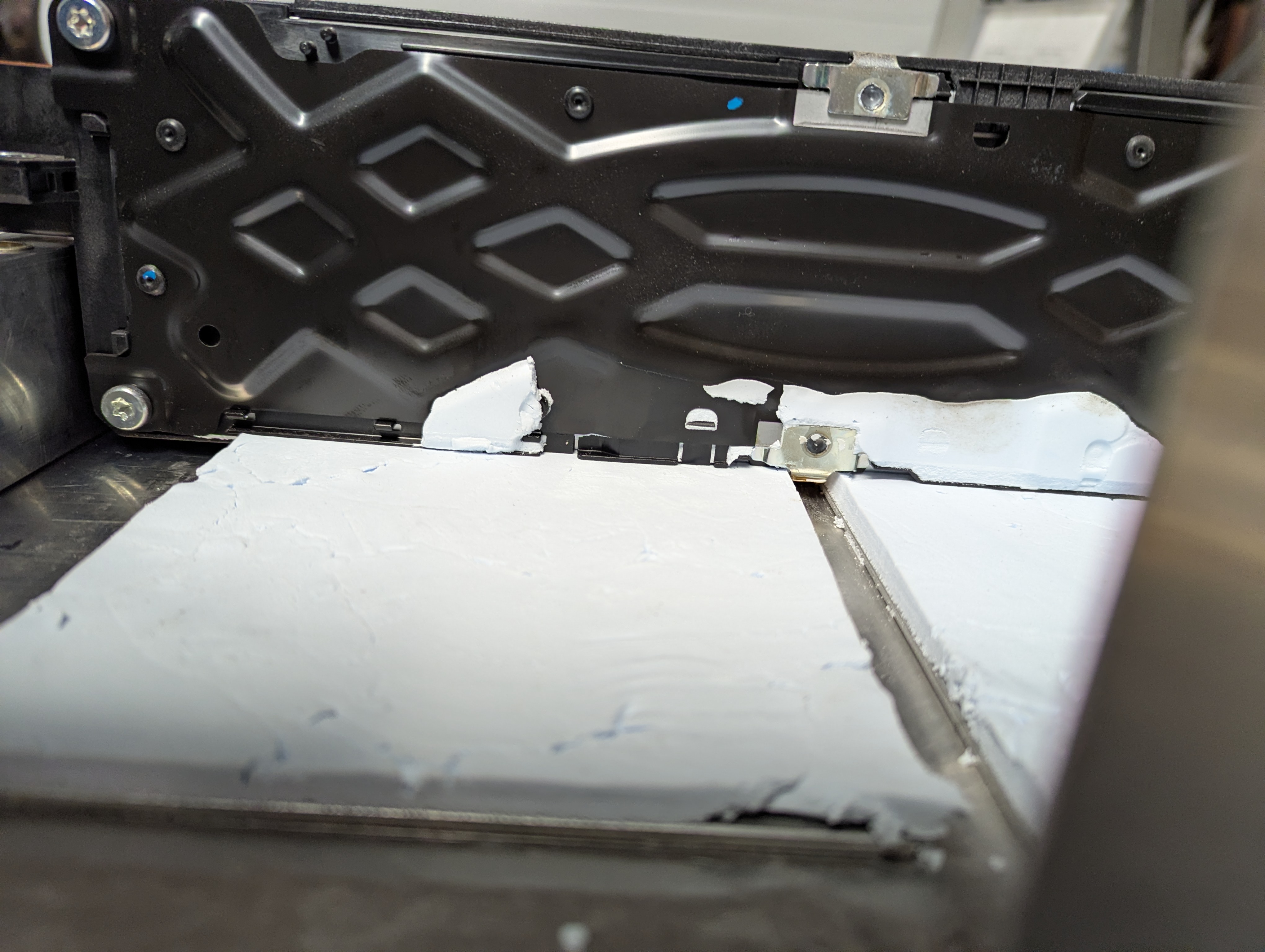 Then i got the first battery box built! I used a rolling pin mathod to get the thermal paste to the right height to barely touch the bottoms of the cells. I think my spacing worked out a well as i could have wanted. When i rest the module on the paste there's a .01-.03" gap between the mounting surface and the module. This gives a teeny bit of pressure on the cells, just enough to make them touch without deforming the pouches i hope. When i lift the module back up you can see a tiny bit of paste stuck to the cells and the very faintest outline of where they touched the thermal paste. I learned from the hyundai technical service manual that this paste gets installed as a 2-part mix, therefore i'm guessing it's much softer when the modules are installed at the factory than it is now. Hope i get some ok heat transfer out of this complex design i've made.