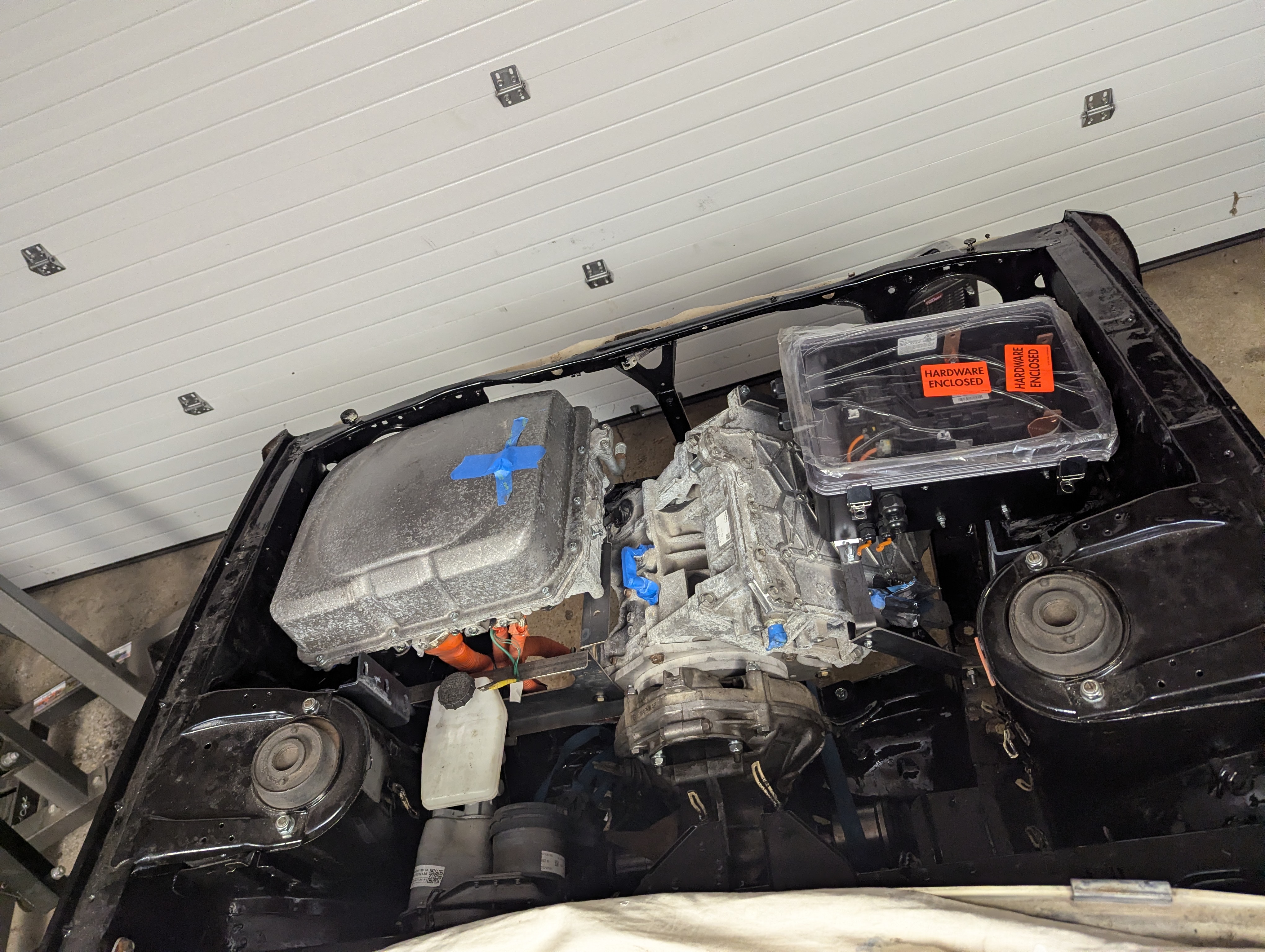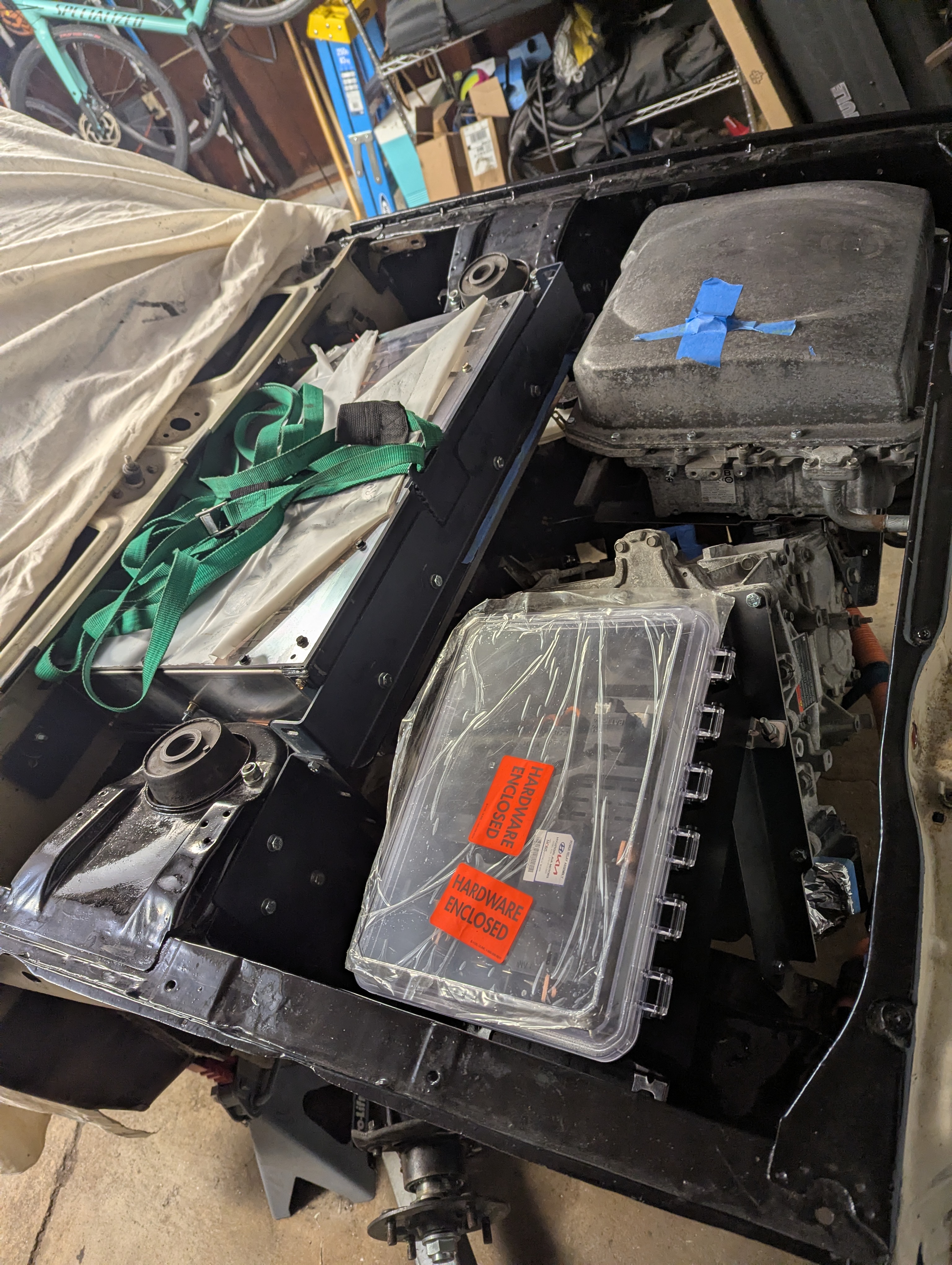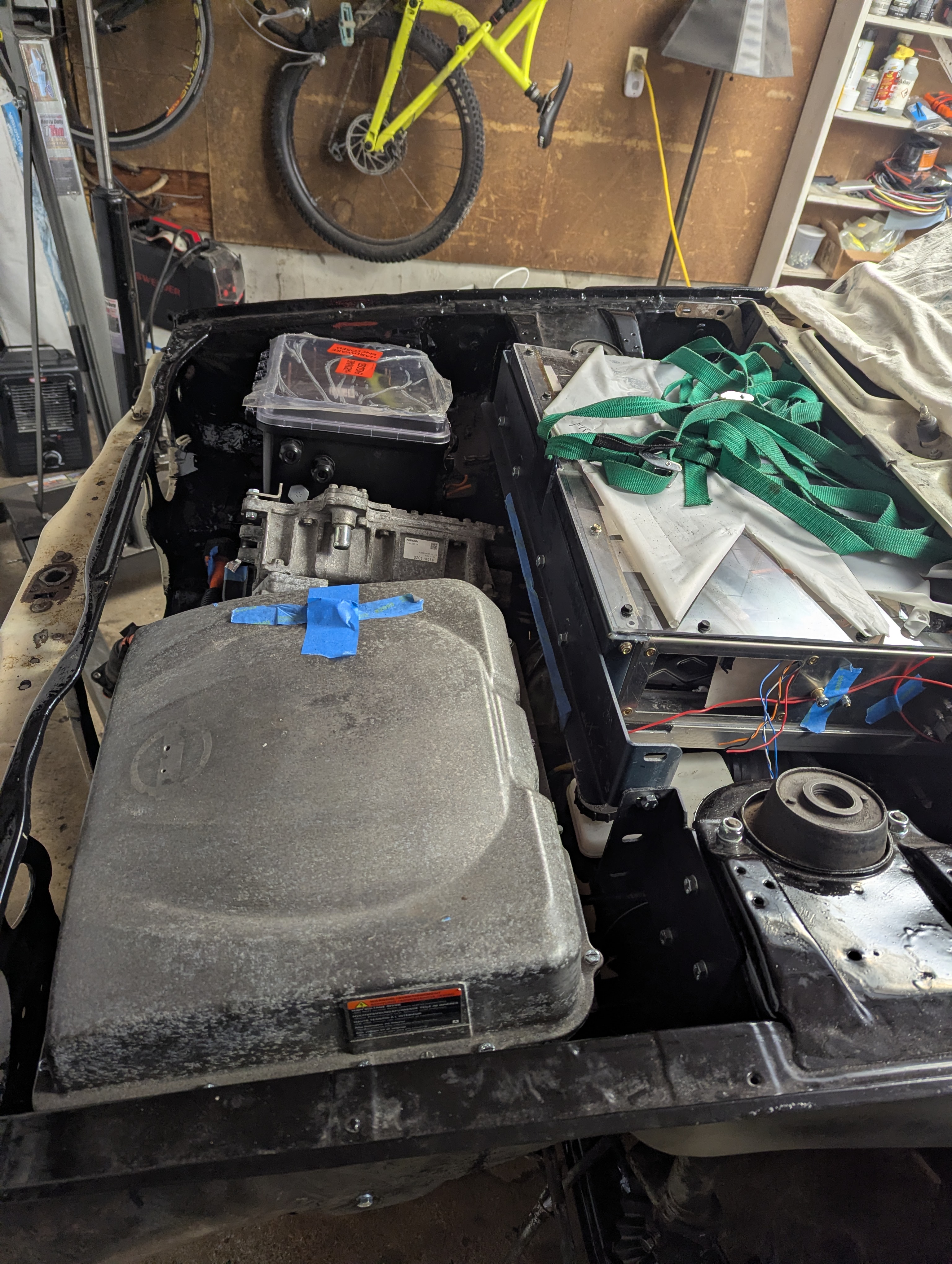 Got everything installed for the first time! This is just temporary for fabricating the motor mounts and getting cable and hose lengths. Now it all has to come back out for painting the motor mounts. It's a bit of a messy look, but so psyched i got it all to fit with 1/4 of the batteries under the hood! The motor is clocked at 45 degrees which makes a lot of odd shapes for fitting everything else in. My 3D scanner lied to me a little bit and I have to mod the battery box mounts to bring it an inch lower and half an inch forward.