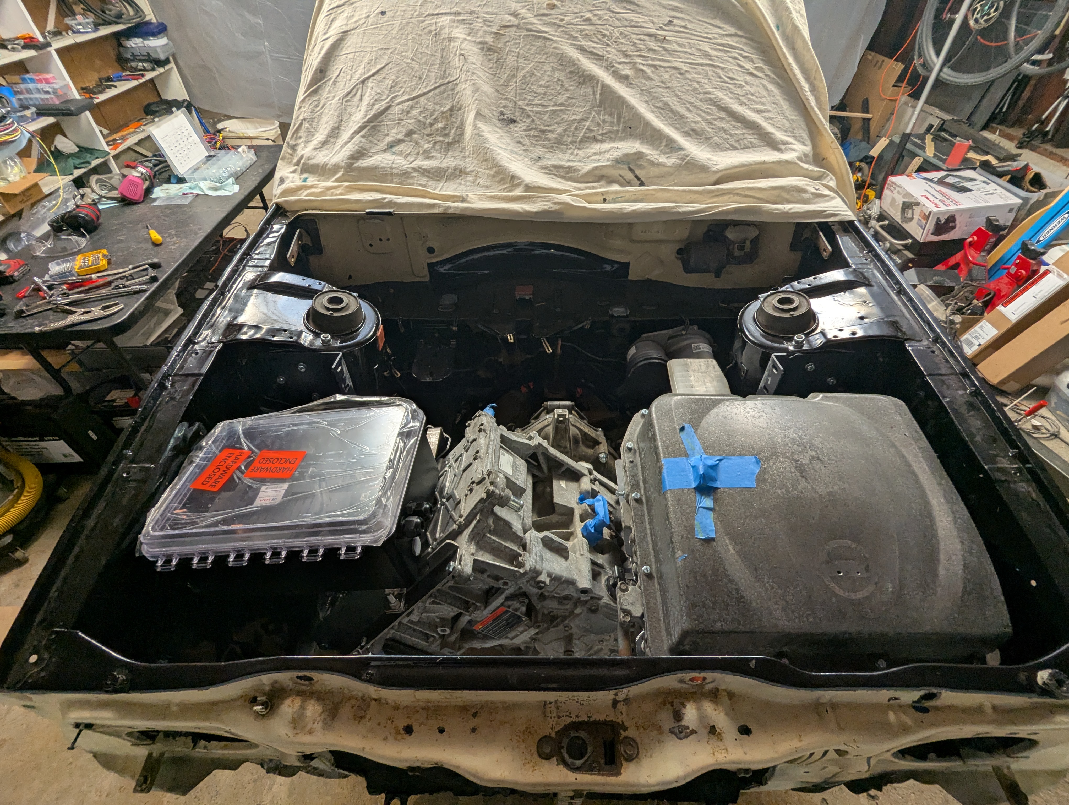 The redneckifiction of my garage (gararge as they say around here) is complete. IOW i built a plastic tent around my car workspace so i can work through the winter via space heater more comfortably. After a full day with the space heaters maxed out i got to 45F when it was 32F outside. ugh. it's going to be a long winter!