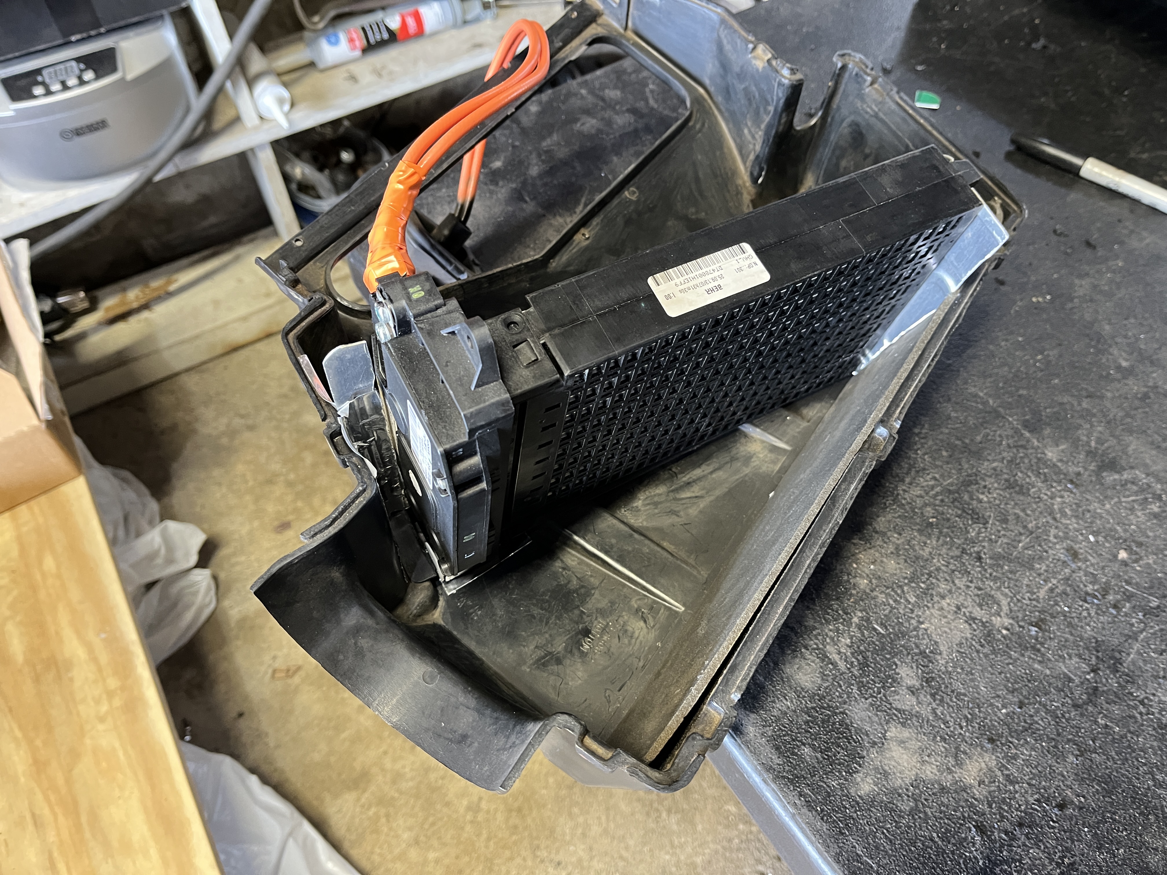 ^ Nissan leaf PTC air cabin heater partially fitted into the heating duct of the subaru